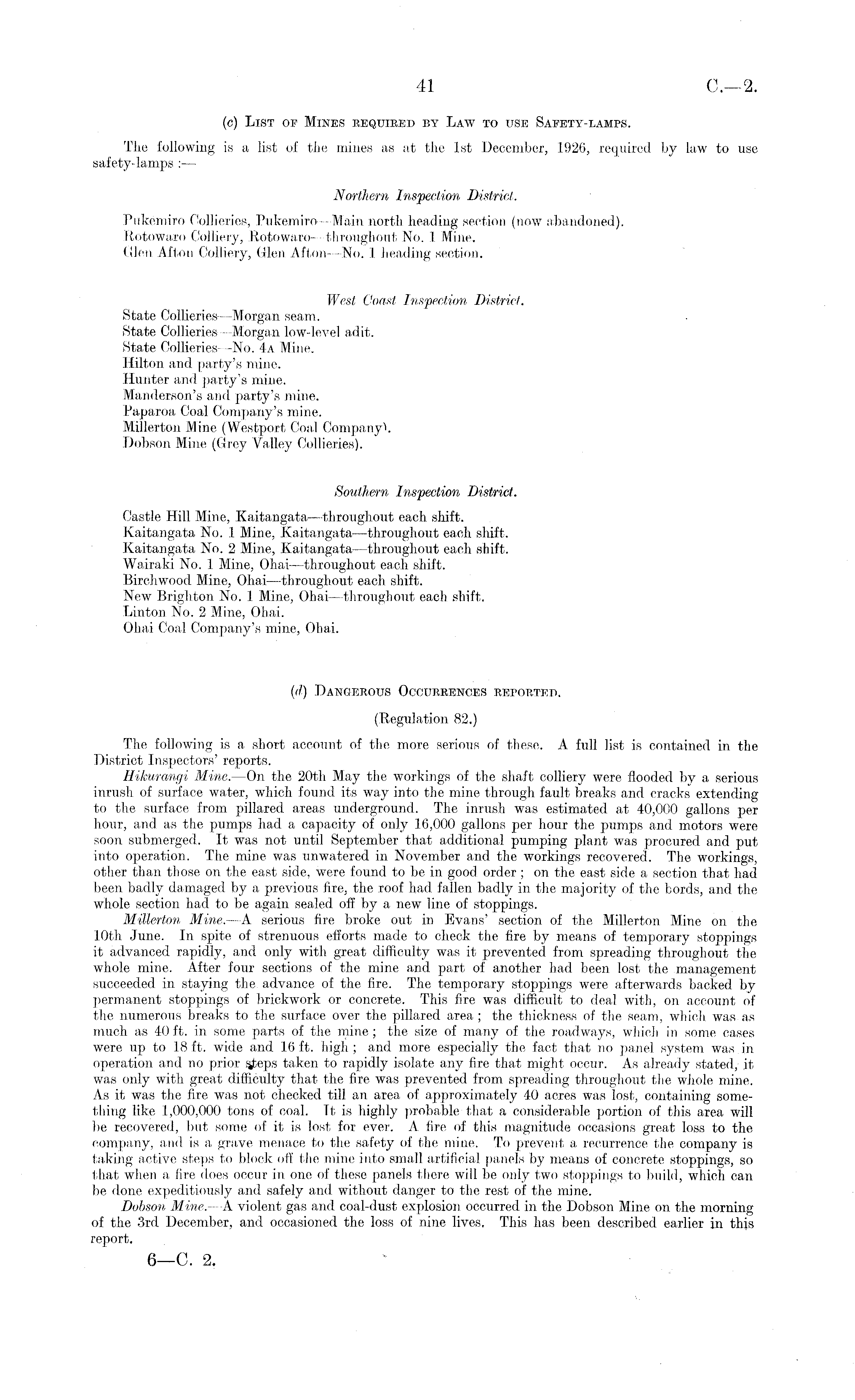 (c) List op Mines required by Law to use Safety-lamps. The following is a list of tlie mines as at the Ist December, 1926, required by law to use safety-lamps : — Northern Inspection District. Pukemiro Collieries, Pukemiro —Main north heading section (now abandoned). Rotowaro Colliery, _Rotowa.ro —throughout No. 1 Mine. Glen Afton Colliery, Glen Afton —No. 1 heading section. West Coast Inspection District. State Collieries—Morgan seam. State Collieries —Morgan low-level adit. State Collieries—No. 4a Mine. Hilton and party's mine. Hunter and party's mine. Manderson's and party's mine. Paparoa Coal Company's mine. Millerton Mine (Westport Coal Company'*. Dobson Mine (Grey Valley Collieries). Southern Inspection District. Castle Hill Mine, Kaitangata —throughout each shift. Kaitangata No. 1 Mine, Kaitangata —throughout each shift. Kaitangata No. 2 Mine, Kaitangata—throughout each shift. Wairaki No. 1 Mine, Ohai —throughout each shift. Birchwood Mine, Oliai —throughout each shift. New Brighton No. 1 Mine, Ohai —throughout each shift. Linton No. 2 Mine, Ohai. Ohai Coal Company's mine, Ohai. (d) Dangerous Occurrences reported. (Regulation 82.) The following is a short account of the more serious of these. A full list is contained in the District Inspectors' reports. Hikurangi Mine. —On the 20th May the workings of the shaft colliery were flooded by a serious inrush of surface water, which found its way into the mine through fault breaks and cracks extending to the surface from pillared areas underground. The inrush was estimated at 40,000 gallons per hour, and as the pumps had a capacity of only 16,000 gallons per hour the pumps and motors were soon submerged. It was not until September that additional pumping plant was procured and put into operation. The mine was unwatered in November and the workings recovered. The workings, other than those on the east side, were found to be in good order ; on the east side a section that had been badly damaged by a previous fire, the roof had fallen badly in the majority of the bords, and the whole section had to be again sealed off by a new line of stoppings. Millerton Mine. —A serious fire broke out in Evans' section of the Millerton Mine on the 10th June. In spite of strenuous efforts made to check the fire by means of temporary stoppings it advanced rapidly, and only with great difficulty was it prevented from spreading throughout the whole mine. After four sections of the mine and part of another had been lost the management succeeded in staying the advance of the fire. The temporary stoppings were afterwards backed by permanent stoppings of brickwork or concrete. This fire was difficult to deal with, on account of the numerous breaks to the surface over the pillared area ; the thickness of the seam, which was as much as 40 ft. in some parts of the mine; the size of many of the roadways, which in some cases were up to 18 ft. wide and 16 ft. high ; and more especially the fact that no panel system was in operation and no prior taken to rapidly isolate any fire that might occur. As already stated, it was only with great difficulty that the fire was prevented from spreading throughout the whole mine. As it was the fire was not checked till an area of approximately 40 acres was lost, containing something like 1,000,000 tons of coal. It is highly probable that a considerable portion of this area will lie recovered, but some of it is lost for ever. A fire of this magnitude occasions great loss to the company, and is a grave menace to the safety of the mine. To prevent a recurrence the company is taking active steps to block off the mine into small artificial panels by means of concrete stoppings, so that when a fire does occur in one of these panels there will be only two stoppings to build, which can be done expeditiously and safely and without danger to the rest of the mine. Dobson Mine.— A violent gas and coal-dust explosion occurred in the Dobson Mine on the morning of the 3rd December, and occasioned the loss of nine lives. This has been described earlier in this report.