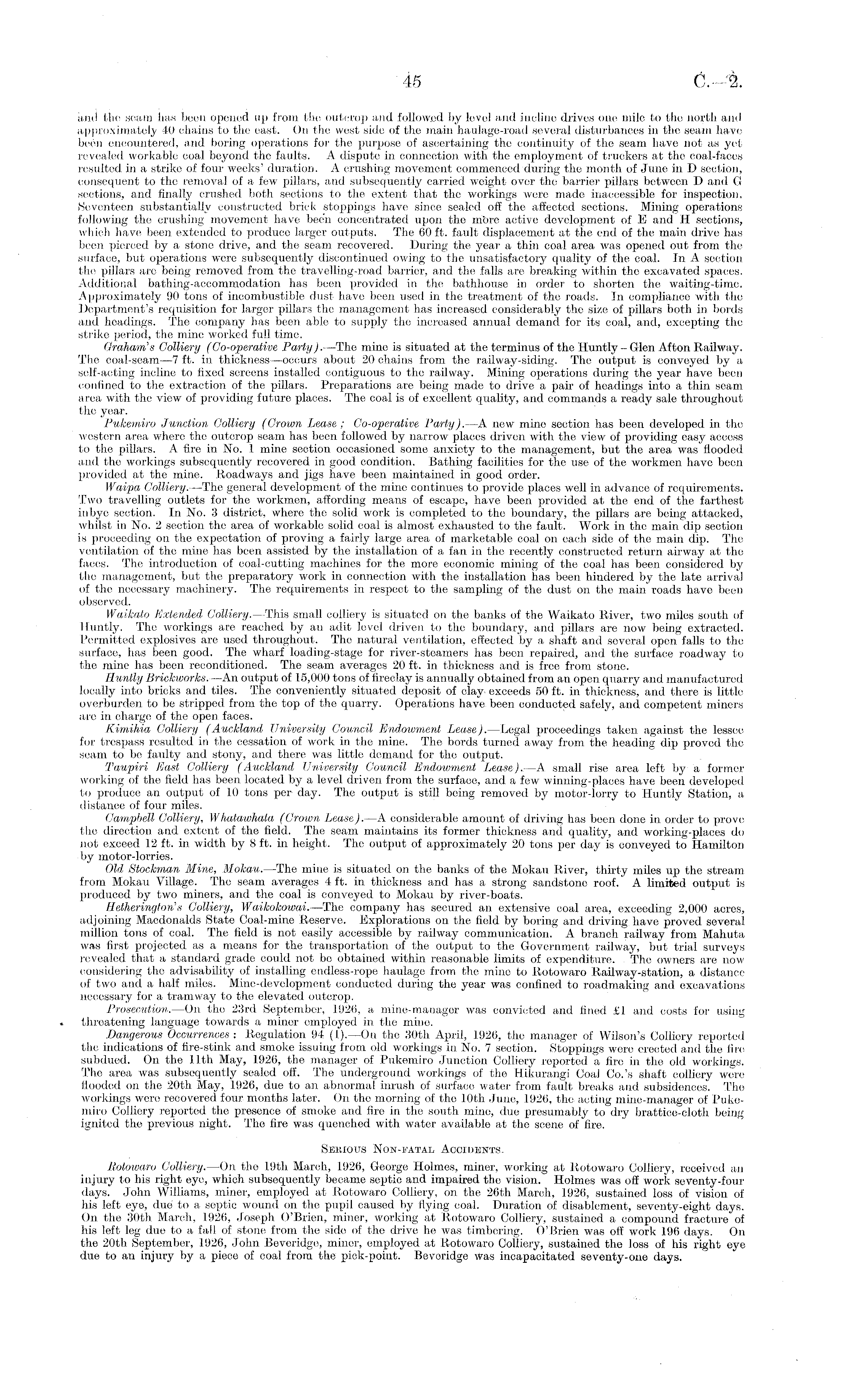 and the seam lias been opened up from the outcrop and followed by level and incline drives one mile to the north and approximately 40 chains to the east. On the west side of the main haulage-road several disturbances in the seam have been encountered, and boring operations for the purpose of ascertaining the continuity of the seam have not as yet revealed workable coal beyond the faults. A dispute in connection with the employment of truckers at the coal-faces resulted in a strike of four weeks' duration. A crushing movement commenced during the month of June in D section, consequent to the removal of a few pillars, and subsequently carried weight over the barrier pillars between D and G sections, and finally crushed both sections to the extent that the workings were made inaccessible for inspection. Seventeen substantially constructed brick stoppings have since sealed off the affected sections. Mining operations following the crushing movement have been concentrated upon the more active development of E and H sections, which have been extended to produce larger outputs. The 60 ft. fault displacement at the end of the main drive has been pierced by a stone drive, and the seam recovered. During the year a thin coal area was opened out from the surface, but operations were subsequently discontinued owing to the unsatisfactory quality of the coal. In A section the pillars are being removed from the travelling-road barrier, and the falls are breaking within the excavated spaces. Additional bathing-accommodation has been provided in the bathhouse in order to shorten the waiting-time. Approximately 90 tons of incombustible dust have been used in the treatment of the roads. In compliance with the Department's requisition for larger pillars the management has increased considerably the size of pillars both in bords and headings. The company has been able to supply the increased annual demand for its coal, and, excepting the strike period, the mine worked full time. Graham's Colliery (Go-operative Party).—The mine is situated at the terminus of the Huntly - Glen Afton Railway. The coal-seam —7 ft. in thickness—occurs about 20 chains from the railway-siding. The output is conveyed by a self-acting incline to fixed screens installed contiguous to the railway. Mining operations during the year have been confined to the extraction of the pillars. Preparations are being made to drive a pair of headings into a thin seam area with the view of providing future places. The coal is of excellent quality, and commands a ready sale throughout the year. Pukemiro Junction Colliery (Crown Lease ; Co-operative Party).—A new mine section has been developed in the western area where the outcrop seam has been followed by narrow places driven with the view of providing easy access to the pillars. A fire in No. 1 mine section occasioned some anxiety to the management, but the area was flooded and the workings subsequently recovered in good condition. Bathing facilities for the use of the workmen have been provided at the mine. Roadways and jigs have been maintained in good order. Waipa Colliery.—The general development of the mine continues to provide places well in advance of requirements. Two travelling outlets for the workmen, affording means of escape, have been provided at the end of the farthest inbye section. In No. 3 district, where the solid work is completed to the boundary, the pillars are being attacked, whilst in No. 2 section the area of workable solid coal is almost exhausted to the fault. Work in the main dip section is proceeding on the expectation of proving a fairly large area of marketable coal on each side of the main dip. The ventilation of the mine has been assisted by the installation of a fan in the recently constructed return airway at the faces. The introduction of coal-cutting machines for the more economic mining of the coal has been considered by tlie management, but the preparatory work in connection with the installation has been hindered by the late arrival of the necessary machinery. The requirements in respect to the sampling of the dust on the main roads have been observed. Waikato Extended Colliery.—This small colliery is situated on the banks of the Waikato River, two miles south of Huntly. The workings are reached by an adit level driven to the boundary, and pillars are now being extracted. Permitted explosives are used throughout. The natural ventilation, effected by a shaft and several open falls to the surface, has been good. The wharf loading-stage for river-steamers has been repaired, and the surface roadway to the mine has been reconditioned. The seam averages 20 ft. in thickness and is free from stone. Huntly Brickworks. —An output of 15,000 tons of fireclay is annually obtained from an open quarry and manufactured locally into bricks and tiles. The conveniently situated deposit of clay, exceeds 50 ft. in thickness, and there is little overburden to be stripped from the top of the quarry. Operations have been conducted safely, and competent miners are in charge of the open faces. Kimihia Colliery (Auckland University Council Endowment Lease). —Legal proceedings taken against the lessee for trespass resulted in the cessation of work in the mine. The bords turned away from the heading dip proved the seam to be faulty and stony, and there was little demand for the output. Taupiri East Colliery (Auckland University Council Endowment Lease).—A small rise area left by a former working of the field has been located by a level driven from the surface, and a few winning-places have been developed to produce an output of 10 tons per day. The output is still being removed by motor-lorry to Huntly Station, a distance of four miles. Campbell Colliery, Whatawhata (Grown Lease). —A considerable amount of driving has been done in order to prove the direction and extent of the field. The seam maintains its former thickness and quality, and working-places do not exceed 1