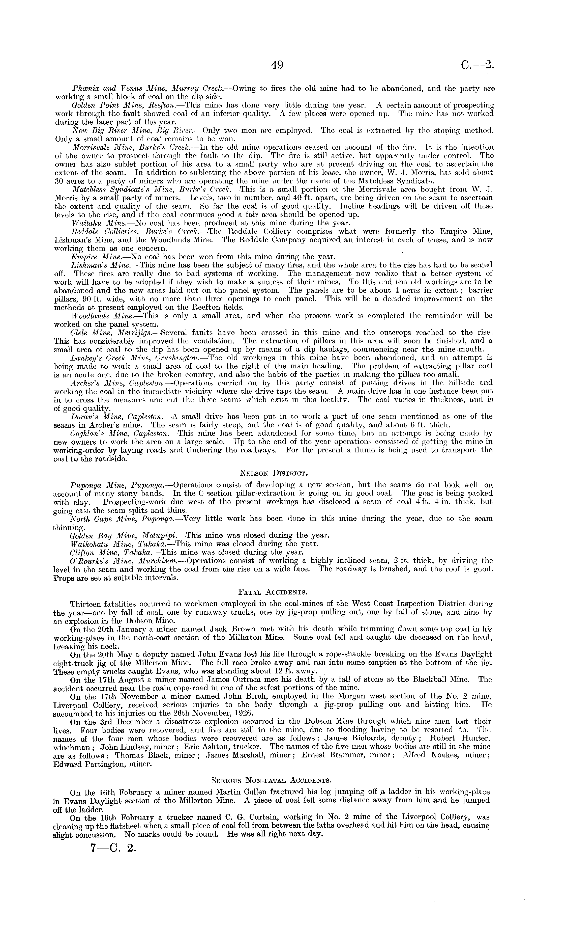 Phoenix and Venus Mine, Murray Creek.—Owing to fires the old mine had to be abandoned, and the party are working a small block of coal on the dip side. Golden Point Mine, Seefton. —This mine has done very little during the year. A certain amount of prospecting work through the fault showed coal of an inferior quality. A few places were opened up. The mino has not worked during the later part of the year. New Big River Mine, Big River.—Only two men are employed. The coal is extracted by the stoping method. Only a small amount of coal remains to be won. Morrisvale Mine, Burke's Creek. —In the old mine operations ceased on account of the fire. It is the intention of the owner to prospect through the fault to the dip. The fire is still active, but apparently under control. The owner has also sublet portion of his area to a small party who are at present driving on the coal to ascertain the extent of the seam. In addition to subletting the above portion of his lease, the owner, W. J. Morris, has sold about 30 acres to a party of miners who are operating the mine under the name of the Matchless Syndicate. Matchless Syndicate's Mine, Burke's Creek.—This is a small portion of the Morrisvale area bought from W. J. Morris by a small party of miners. Levels, two in number, and 40 ft. apart, are being driven on the seam to ascertain the extent and quality of the seam. So far the coal is of good quality. Incline headings will be driven off these levels to the rise, and if the coal continues good a fair area should be opened up. Waitahu Mine.—No coal has been produced at this mine during the year. Reddale Collieries, Burke's Creek.—The Reddale Colliery comprises what were formerly the Empire Mine, Lishman's Mine, and the Woodlands Mine. The Reddale Company acquired an interest in each of these, and is now working them as one concern. Empire Mine.—No coal has been won from this mine during the year. Lishman's Mine.—This mine has been the subject of many fires, and the whole area to the rise has had to be sealed off. These fires are really due to bad systems of working. The management now realize that a better system of work will have to be adopted if they wish to make a success of their mines. To this end the old workings are to be abandoned and the new areas laid out on the panel system. The panels are to be about 4 acres in extent; barrier pillars, 90 ft. wide, with no more than three openings to each panel. This will be a decided improvement on the methods at present employed on the Reefton fields. Woodlands Mine.—This is only a small area, and when the present work is completed the remainder will be worked on the panel system. Clele Mine, Merrijigs.—-Several faults have been crossed in this mine and the outcrops reached to the rise. This has considerably improved the ventilation. The extraction of pillars in this area will soon be finished, and a small area of coal to the dip has been opened up by means of a dip haulage, commencing near the mine-mouth. Lankey's Creek Mine, Crushington.—The old workings in this mine have been abandoned, and an attempt is being made to work a small area of coal to the right of the main heading. The problem of extracting pillar coal is an acute one, due to the broken country, and also the habit of the parties in making the pillars too small. Archer's Mine, Capleston.—Operations carried on by this party consist of putting drives in the hillside and working the coal in the immediate vicinity where the drive taps the seam. A main drive has in one instance been put in to cross the measures and cut the three seams which exist in this locality. The coal varies in thickness, and is of good quality. Doran's Mine, Capleston.—A small drive has been put in to work a part of one seam mentioned as one of the seams in Archer's mine. The seam is fairly steep, but the coal is of good quality, and about 6 ft. thick. Coghlan's Mine, Capleston.—This mine has been adandoned for some time, but an attempt is being made by new owners to work the area on a large scale. Up to the end of the year operations consisted of getting the mine in working-order by laying roads and timbering the roadways. For the present a flume is being used to transport the coal to the roadside. Nelson District. Puponga Mine, Puponga.—Operations consist of developing a new section, but the seams do not look well on account of many stony bands. In the C section pillar-extraction is going on in good coal. The goaf is being packed with clay. Prospecting-work due west of the present workings has disclosed a seam of coal 4 ft. 4 in. thick, but going east the seam splits and thins. North Cape Mine, Puponga.—-Very little work has been done in this mine during the year, due to the seam thinning. Golden Bay Mine, Motupijn.—This mine was closed during the year. Waikohatu Mine, Takaka.—This mine was closed during the year. Clifton Mine, Takaka. —This mine was closed during the year. O'Rourke's Mine, Murchison.—Operations consist of working a highly inclined seam, 2 ft. thick, by driving the level in the seam and working the coal from the rise on a wide face. The roadway is brushed, and the roof is good. Props are set at suitable intervals. Fatal Accidents. Thirteen fatalities occurred to workmen employed in the coal-mines of the West Coast Inspection District during the year —one by fall of coal, one by runaway trucks, one by jig-prop pulling out, one by fall of stone, and nine by an explosion in the Dobson Mine. On the 20th January a miner named Jack Brown met with his death while trimming down some top coal in his working-place in the north-east section of the Millerton Mine. Some coal fell and caught the deceased on the head, breaking his neck. On the 20th May a deputy named John Evans lost his life through a rope-shackle breaking on the Evans Daylight eight-truck jig of the Millerton Mine. The full race broke away and ran into some empties at the bottom of the jig. These empty tru