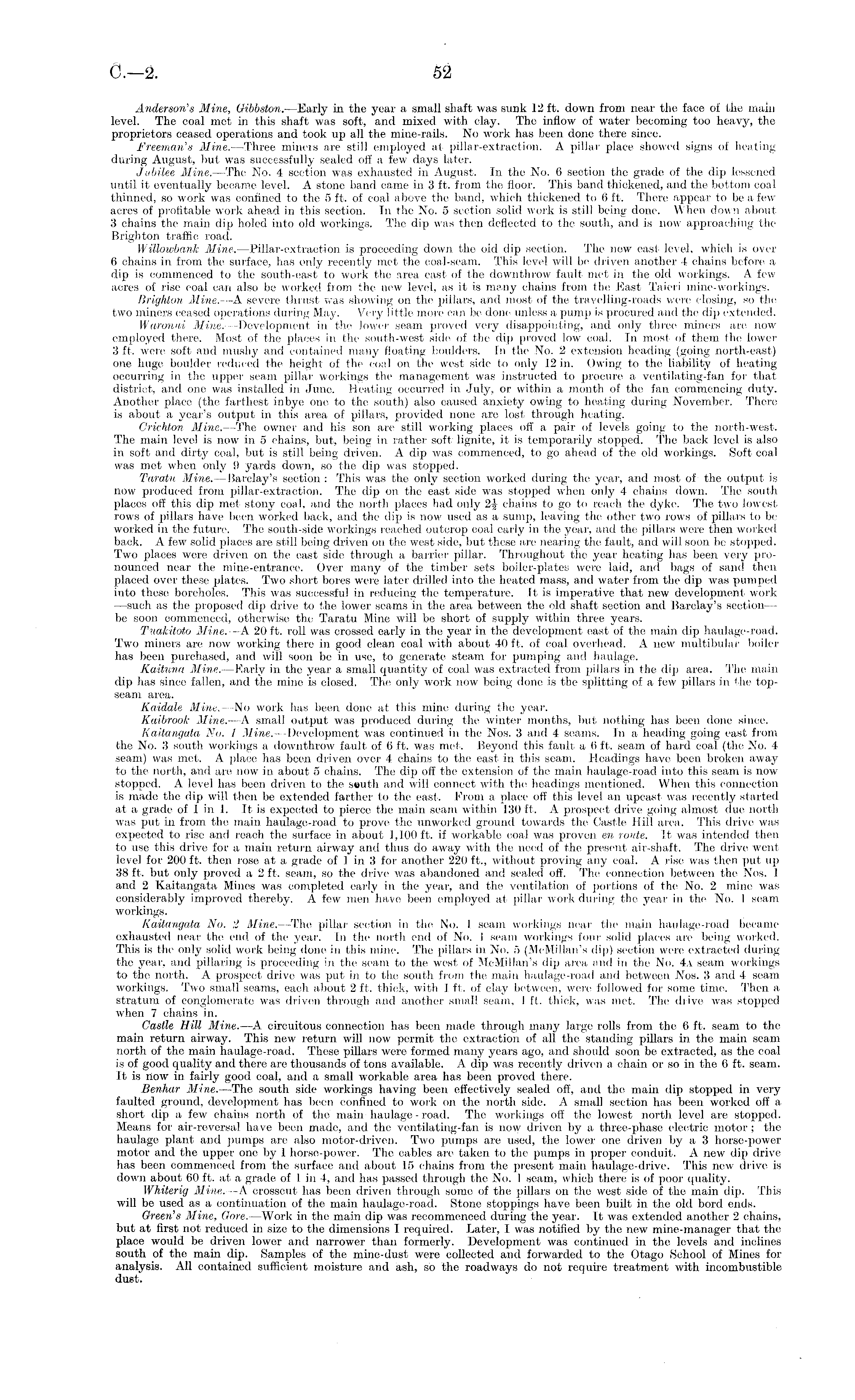Anderson's Mine, Gibbston.—Early in the year a small shaft was sunk 12 ft. down from near the face of the main level. The coal met in this shaft was soft, and mixed with clay. The inflow of water becoming too heavy, the proprietors ceased operations and took up all the mine-rails. No work has been done there since. Freeman's Mine.—Three miners are still employed at pillar-extraction. A pillar place showed signs of heating during August, but was successfully sealed off a few days later. Jubilee Mine. —The No. 4 section was exhausted in August. In the No. 6 section the grade of the dip lessened until it eventually became level. A stone band came in 3 ft. from the floor. This band thickened, and the bottom, coal thinned, so work was confined to the 5 ft. of coal above the band, which thickened to 6 ft. There appear to be a few acres of profitable work ahead in this section. In the No. 5 section solid work is still being done. When dow.n about 3 chains the main dip holed into old workings. The dip was then deflected to the south, and is now approaching the Brighton traffic road. Willowbank Mine. —.Pillar-extraction, is proceeding down the old dip section. The new east level, which is over 6 chains in from the surface, has only recently met the coal-seam. This level will be driven another 4 chains before a dip is commenced to the south-east to work the area east of the downthrow fault met in the old workings. A few acres of rise coal can also be worked from the new level, as it is many chains from the East Taieri mine-workings. Brighton Mine.—A. severe thrust was showing on the pillars, and most of the travelling-roads were closing, so the two miners ceased operations during May. Very little more can be done unless a pump is procured and the dip extended. Waronni Mine. —Development in the lower seam proved very disappointing, and only three miners are now employed there. Most of the places in the south-west side of the dip proved low coal. In most of them the lower 3 ft. were soft and mushy and contained many floating boulders. In the No. 2 extension heading (going north-east) one huge boulder reduced the height of the coal on the west side to only 12 in. Owing to the liability of heating occurring in the upper seam pillar workings the management was instructed to procure a ventilating-fan for that district, and one was installed in June. Heating occurred in July, or within a month of the fan commencing duty. Another place (the farthest in bye one to the south) also caused anxiety owing to heating during November. There is about a year's output in this area of pillars, provided none are lost through heating. Crichton Mine.—The owner and his son are still working places off a pair of levels going to the north-west. The main level is now in 5 chains, but, being in rather soft; lignite, it is temporarily stopped. The back level is also in soft and dirty coal, but is still being driven. A dip was commenced, to go ahead of the old workings. Soft coal was met when only 9 yards down, so the dip was stopped. Taratu Mine.—Barclay's section : This was the only section worked during the year, and most of the output is now produced from pillar-extraction. The dip on the east side was stopped when only 4 chains down. The south places off this dip met stony coal, and the north places had only 2J chains to go to reach the dyke. The two lowest rows of pillars have been worked back, and the dip is now used as a sump, leaving the other two rows of pillars to be worked in the future. The south-side workings reached outcrop coal early in the year, and the pillars were then worked back. A few solid places are still being driven on the west side, but these are nearing the fault, and will soon be stopped. Two places were driven on the east side through a barrier pillar. Throughout the year heating has been very pronounced near the mine-entrance. Over many of the timber sets boiler-plates were laid, and bags of sand then placed over these plates. Two short bores were later drilled into the heated mass, and water from the dip was pumped into these boreholes. This was successful in reducing the temperature. It is imperative that new development work —such as the proposed dip drive to the lower seams in the area between the old shaft section and Barclay's section— be soon commenced, otherwise the Taratu Mine will be short of supply within three years. Tuakitoto Mine.—A 20 ft. roll was crossed early in the year in the development east of the main dip haulage-road. Two miners are now working there in good clean coal with about 40 ft. of coal overhead. A new multibular boiler has been purchased, and will soon be in use, to generate steam for pumping and haulage. Kaituna Mine. —Early in the year a small quantity of coal was extracted from pillars in the dip area. The main dip has since fallen, and the mine is closed. The only work now being done is the splitting of a few pillars in the topseam area. Kaidale Mine. —No work has been done at this mine during the year. Kaibrook Mine. —A small output was produced during the winter months, but nothing has been done since. Kaitangata No. 1 Mine. —Development was continued in the Nos. 3 and 4 seams. In a heading going east from the No. 3 south workings a downthrow fault of 6 ft. was met. Beyond this fault a 6 ft. seam of hard coal (the No. 4 seam) was met. A place has been driven over 4 chains to the east in this seam. Headings have been broken away to the north, and are now in about 5 chains. The dip off the extension of the main haulage-road into this seam is now stopped. A level has been driven to the south and will connect with the headings mentioned. When this connection is made the dip will then be extended farther to the east. From a place off this level an upcast was recently started at a grade of lin 1. It is expected to pierce the main seam within 130 ft. A prospect drive going almost due north was put in from the main haulage-road to prove 