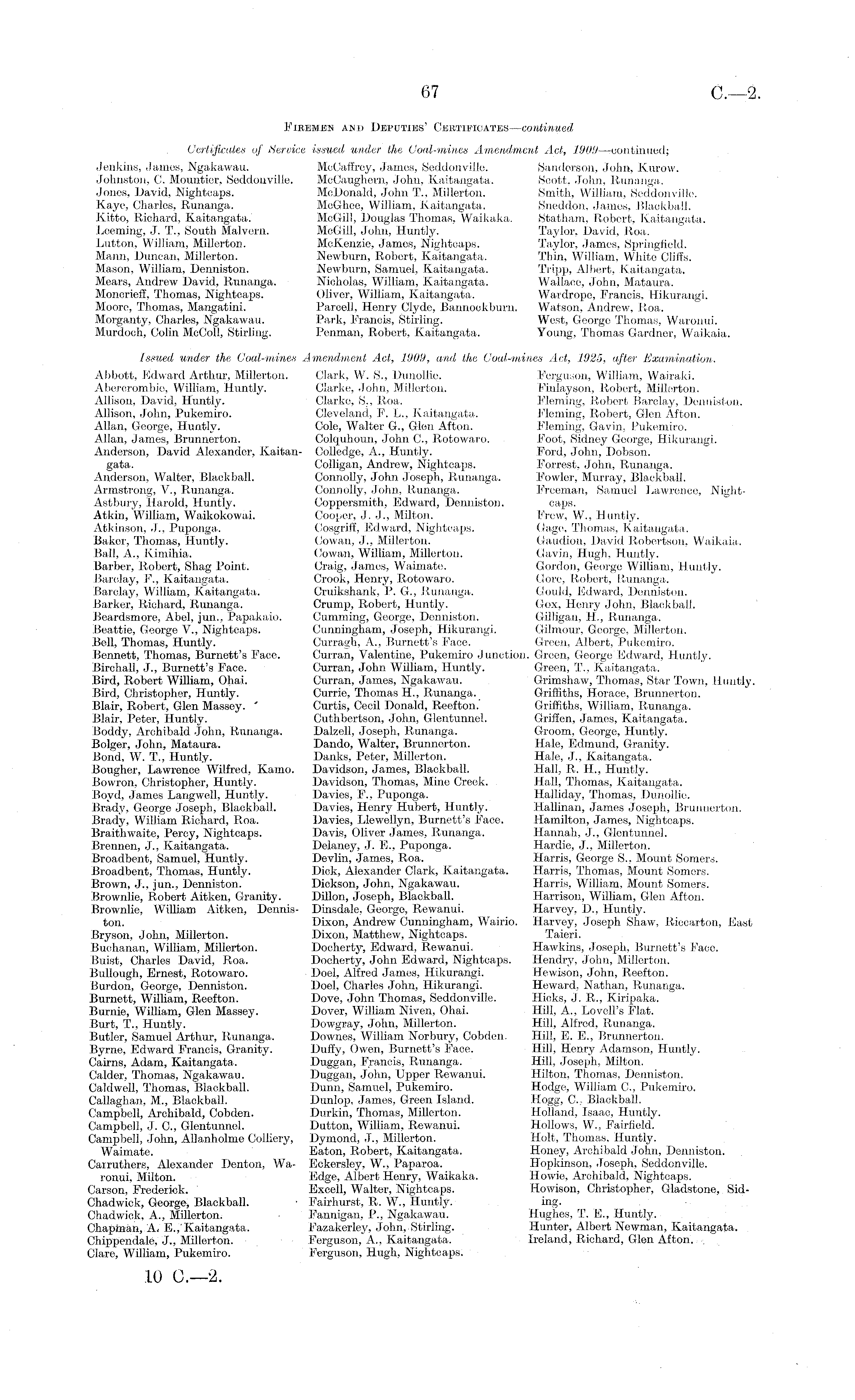Firemen and Deputies' Certificates—continued Certificates uf Service issued under the Goal-mines Amendment Act, 190!)— continued; Jenkins, James, Ngakawau. McCaffrey, James, Seddonville. Sanderson, John, Kurow. Johnston, C. Mountier, Seddonville, McCaughern, John, Kaitangata. Scott, John, Runanga. Jones, David, Nightcaps. McDonald, John T„ Millerton. Smith, William, Seddonville. Kaye, Charles, Runanga. McGhee, William, Kaitangata. Sneddon, James, Blackball. Kitto, Richard, Kaitangata. McGill, Douglas Thomas, Waikaka. Statham, Robert, Kaitangata. Leeming, J. T., South Malvern. McGill, John, Huntly. Taylor, David, Roa. Lutton, William, Millerton. McKenzie, James, Nightcaps. Taylor, James, Springfield. Mann, Duncan, Millerton. Newburn, Robert, Kaitangata. Thin, William, White Cliffs. Mason, William, Denniston. Newburn, Samuel, Kaitangata. Tripp, Albert, Kaitangata. Mears, Andrew David, Runanga. Nicholas, William, Kaitangata. Wallace, John, Mataura. Moncrieff, Thomas, Nightcaps. Oliver, William, Kaitangata. Wardrope, Francis, Hikurangi. Moore, Thomas, Mangatini. Pared]. Henry Clyde, Bannockburn. Watson, Andrew, Roa. Morganty, Charles, Ngakawau. Park, Francis, Stirling. West, George Thomas, Waronui. Murdoch, Colin McColl, Stirling. Penman, Robert, Kaitangata. Young, Thomas Gardner, Waikaia. tssued under the Coal-mines Amendment Act, 1909, and the Coal-mines Act, 1925, after Examination. Abbott, Edward Arthur, Millerton. Clark. W. S., Dunollie. Ferguson, William, Wairaki. Abercrombie, William, Huntly. Clarke, John, Millerton. Finlayson, Robert, Millerton. Allison, David, Huntly. Clarke, S., Roa. Fleming, Robert Barclay, Denniston. Allison, John, Pukemiro. Cleveland, F. L., Kaitangata. Fleming, Robert, Glen Afton. Allan, George, Huntly. Cole, Walter G., Glen Afton. Fleming, Gavin, Pukemiro. Allan, James, Brunnerton. Colquboun, John C., Rotowaro. Foot, Sidney George, Hikurangi. Anderson, David Alexander, Kaitan- Colledge, A., Huntly. Ford, John, Dobson. gata. Colliga.n, Andrew, Nightcaps. Forrest, John, Runanga. Anderson, Walter, Blackball. Connolly, John Joseph, Runanga. Fowler, Murray, Blackball. Armstrong, V., Runanga. Connolly, John, Runanga. Freeman, Samuel Lawrence, NightAstbury, Harold, Huntly. Coppersmith, Edward, Denniston. caps. Atkin, William, Waikokowai. Cooper, J. J., Milton. Frew, W., Huntly. Atkinson, J., Puponga. Cosgriff, Edward, Nightcaps. Gage, Thomas, Kaitangata. Baker, Thomas, Huntly. Cowan, J., Millerton. Gaudion, David Robertson, Waikaia. Ball, A., Kimihia. Cowan, William, Millerton. Gavin, Hugh, Huntly. Barber, Robert, Shag Point. Craig, James, Waimate. Gordon, George William, Huntly. Barclay, F., Kaitangata. Crook, Henry, Rotowaro. Gore, Robert, Runanga. Barclay, William, Kaitangata. Cruikshank, P. G., Runanga. Gould, Edward, Denniston. Barker, Richard, Runanga. Crump, Robert, Huntly. Gox, Henry John, Blackball. Beardsmore, Abel, jun., Papakaio. Cumming, George, Denniston. Gilligan, H., Runanga. Beattie, George V., Nightcaps. Cunningham, Joseph, Hikurangi. Gilmour, George, Millerton. Bell, Thomas, Huntly. Curragh, A., Burnett's Face. Green, Albert, Pukemiro. Bennett, Thomas, Burnett's Face. Curran, Valentine, Pukemiro Junction. Green, George Edward, Huntly. Birchall, J., Burnett's Face. Curran, John William, Huntly. Green, T., Kaitangata. Bird, Robert William, Ohai. Curran, James, Ngakawau. Grimshaw, Thomas, Star Town, Huntly. Bird, Christopher, Huntly. Currie, Thomas H., Runanga. Griffiths, Horace, Brunnerton. Blair, Robert, Glen Massey. ' Curtis, Cecil Donald, Reefton. Griffiths, William, Runanga. Blair, Peter, Huntly. Cuthbertson, John, Glentunnel. Griffen, James, Kaitangata. Boddy, Archibald John, Runanga. Dalzell, Joseph, Runanga. Groom, George, Huntly. Bolger, John, Mataura. Dando, Walter, Brunnerton. Hale, Edmund, Granity. Bond, W. T., Huntly. Danks, Peter, Millerton. Hale, J., Kaitangata. Bougher, Lawrence Wilfred, Kamo. Davidson, James, Blackball. Hall, R. H., Huntly. Bowron, Christopher, Huntly. Davidson, Thomas, Mine Creek. Hall, Thomas, Kaitangata. Boyd, James Langwell, Huntly. Davi.es, F., Puponga. Halliday, Thomas, Dunollie. Brady, George Joseph, Blackball. Davies, Henry Hubert, Huntly. Hallinan, James Joseph, Brunnerton. Brady, William Richard, Roa. Davies, Llewellyn, Burnett's Face. Hamilton, James, Nightcaps. Braithwaite, Percy, Nightcaps. Davis, Oliver James, Runanga. Hannah, J., Glentunnel. Brennen, J., Kaitangata. Delaney, J. E., Puponga. Hardie, J., Millerton. Broadbent, Samuel, Huntly. Devlin, James, Roa. Harris, George S.. Mount Somers. Broadbent, Thomas, Huntly. Dick, Alexander Clark, Kaitangata. Harris, Thomas, Mount Somers. Brown, J., jun., Denniston. Dickson, John, Ngakawau. Harris, William, Mount Somers. Brownlie, Robert Aitken, Granity. Dillon, Joseph, Blackball. Harrison, William, Glen Afton. Brownlie, William Aitken, Dennis- Dinsdale, George, Rewanui. Harvey, D., Huntly. ton. Dixon, Andrew Cunningham, Wairio. Harvey, Joseph Shaw, Riccarton, East Bryson, John, Millerton. Dixon, Matthew, Nightcaps. Taieri. Buchanan, William, Millerton. Docherty, Edward, Rewanui. Hawkins, Joseph, Burnett's Face. Buist, Charles David, Roa. Docherty, John Edward, Nightcaps. Hendry, John, Millerton. Bullough, Ernest, Rotowaro. Doel, Alfred James, Hikurangi. Hewison, John, Reefton. Burdon, George, Denniston. Doel, Charles John, Hikurangi. Howard, Nathan, Runanga. Burnett, William, Reefton. Dove, John Thomas, Seddonville. Hicks, J. R., Kiripaka. Burnie, William, Glen Massey. Dover, William Niven, Ohai. Hill, A., Lovell's Flat. Burt, T., Huntly. Dowgray, John, Millerton. Hill, Alfred, Runanga. Butler, Samuel Arthur, Runanga. Downes, William Norbury, Cobden. Hill, E. E., Brunnerton. Byrne, Edward Francis, Granity. Duft'v, Owen, Burnett's Face. Hill, Henry Adamson, Huntly. Cairns, Adam, Kaitangata. Duggan, Francis, Runanga. Hill, Joseph, Milton. Colder, Thomas, Ngakawau. Duggan, John, Upper Rewanui. Hilton, Thomas, Denniston. Caldwell, Thomas, Blackball. Dunn, S
