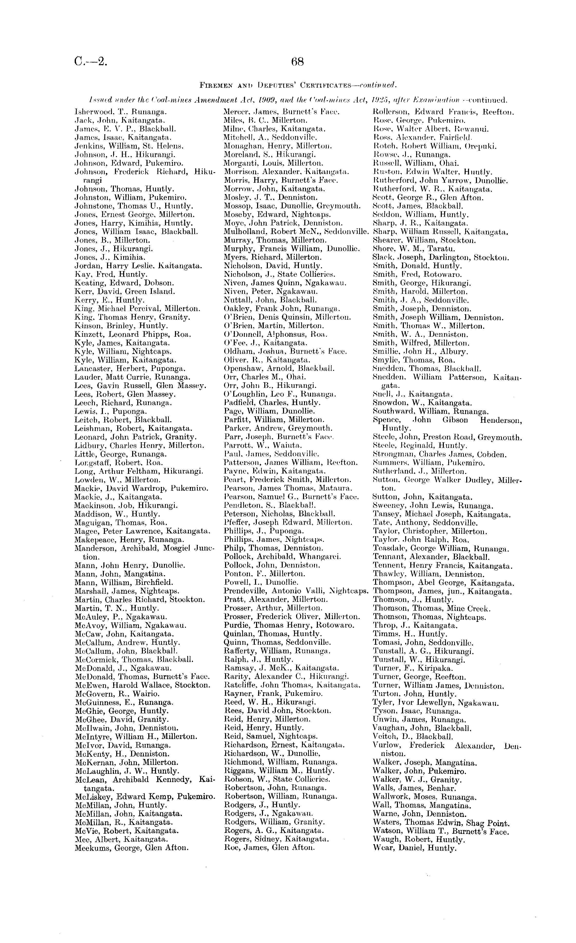 E'iremen and Depoties' Certificates —continued. Issued under the Coal-mines Amendment Act, 1909, and tke Coal-mines Act, 1925, after Examination-^contmued. Isherwood, T., Runanga. Mercer, James, Burnett's Faoe. Rollerson, Edward Francis, Reefton. Jack, John, Kaitangata. Miles, B. C., Millerton. Hose, George, Pukemiro. James, E. V. P., Blackball. Milne, Charles, Kaitangata. Rose, Walter Albert, Rewanui. James, Isaac, Kaitangata. Mitchell, A., Seddonville. Ross, Alexander, Fairfield. Jenkins, William, St. Helens. Monaghan, Henry, Millerton. Rotch, Robert William, Orepuki. Johnson, •). H., Hikurangi. Moreland, S., Hikurangi. Rowse, J., Runanga. Johnson, Edward, Pukemiro. Morganti, Louis, Millerton. Russell, William, Ohai. Johnson, Frederick Richard, Hiku- Morrison, Alexander, Kaitangata. Huston, Edwin Walter, Hutitly. rangi Morris, Harry, Burnett's Face. Rutherford, John Yarrow, Dunollie. Johnson, Thomas, Huntly. Morrow, John, Kaitangata. Rutherford, W. R., Kaitangata. Johnston, William, Pukemiro. Mosley, J. T., Denniston. Scott, George R., Glen Afton. Johnstone, Thomas U., Huntly. Mossop, Isaac, Dunollie, Greymouth. Scott, James, Blackball. Jones, Ernest George, Millerton. Moseby, Edward, Nightcaps. Seddon, William, Huntly. Jones, Harry, Kimihia', Huntly. Moye, John Patrick, Denniston. Sharp, J. R., Kaitangata. Jones, William Isaac, Blackball. Mulholland, Robert McN,, Seddonville. Sharp, W T ilJiam Russell, Kaitangata. Jones, 8., Millerton. Murray, Thomas, Millerton. Shearer. William, Stockton. Jones, J., Hikurangi. Murphy, Francis William, Dunollie. Shore, W. M., Taratu. Jones, J., Kimihia. Myers, Richard, Millerton. Slack. Joseph, Darlington, Stockton. Jordan, Harry Leslie. Kaitangata. Nicholson, David, Huntly. Smith, Donald, Huntly. Kay, Fred, Huntly. Nicholson, J., State Collieries. Smith, Fred, Rotowaro. Keating, Edward, Dobson. Niven, James Quinn, Ngakawau. Smith, George, Hikurangi. Kerr, David, Green Island. Niven, Peter, Ngakawau. Smith, Harold, Millerton. Kerry, E., Huntly. Nuttall, John, Blackball. Smith, J. A., Seddonville. King, Michael Percival, Millerton. Oakley, Frank John, Runanga. Smith, Joseph, Denniston. King, Thomas Henry, Granity. O'Brien, Denis Quinsin, Millerton. Smith, Joseph William, Denniston. Kinson, Brinley, Huntly. O'Brien, Martin, Millerton. Smith, Thomas W., Millerton. Kinzett, Leonard Phipps, Roa. O'Donnell, Alphonsus, Roa. Smith, W. A., Denniston. Kyle, James, Kaitangata. O'Fee, J., Kaitangata. Smith, Wilfred, Millerton. Kyle, William, Nightcaps. Oldham, Joshua, Burnett's Face. Smillie, John H., Albury. Kyle, William, Kaitangata. Oliver, R., Kaitangata. Smylie, Thomas, Roa. Lancaster, Herbert, Puponga. Openshaw, Arnold, Blackball. Snedden, Thomas, Blackball. Lauder, Matt Currie, Runanga. Orr, Charles M., Ohai. Snedden, William Patterson, KaitanLees, Gavin Russell, Glen Massey. Orr, John 8., Hikurangi. gata. Lees, Robert, Glen Massey. O'Loughlin, Leo F., Runanga. Snell, J., Kaitangata. Leech, Richard, Runanga. Padfield, Charles, Huntly. Snowdon, W., Kaitangata. Lewis, 1., Puponga. Page, William, Dunollie. Southward. William, Runanga. Leitch., Robert, Blackball. Parfitt, William, Millerton. Spence, John Gibson Henderson, Leishman, Robert, Kaitangata. Parker, Andrew, Greymouth. Huntly. Leonard, John Patrick, Granity. Parr, Joseph. Burnett's Face. Steele, John, Preston Road, Greymouth, Lidbury, Charles Henry, Millerton. Parrott, W., Waiuta. Steele, Reginald, Huntly. Little, George, Runanga. Paul, James, Seddonville. Strongman, Charles James, Cobden. Longstaff, Robert, Roa. Patterson, James William, Reefton. Summers, William, Pukemiro. Long, Arthur Feltham, Hikurangi. Payne, Edwin, Kaitangata. Sutherland, J., Millerton. Lowden, W., Millerton. Peart, Frederick Smith, Millerton. Sutton, George Walker Dudley, MillerMackie, David Wardrop, Pukemiro. Pearson, James Thomas, Mataura. ton. Mackie, J., Kaitangata. Pearson, Samuel G., Burnett's Face. Sutton, John, Kaitangata. Mackinson, Job, Hikurangi. Pendleton, S.. Blackball. Sweeney, John Lewis, Runanga. Maddison, W., Huntly. Peterson, Nicholas, Blackball. Tansey, Michael Joseph, Kaitangata. Maguigan, Thomas, Roa. Pfeffer, Joseph Edward, Millerton. Tate, Anthony, Seddonville. Magee, Peter Lawrence, Kaitangata. Phillips, J., Puponga. Taylor, Christopher, Millerton. Makepeace, Henry, Runanga. Phillips, James, Nightcaps. Taylor, John Ralph, Roa. Manderson, Archibald, Mosgiel June- Philp, Thomas, Denniston. Teasdale, George William, Runanga. tion. Pollock, Archibald, Whangarei. Tennant, Alexander, Blackball. Mann, John Henry, Dunollie. Pollock, John, Denniston. Tennent, Henry Francis, Kaitangata. Mann, John, Mangatina. Ponton, F.. Millerton. Thawley, William, Denniston. Mann, William, Birchfield. Powell, 1., Dunollie. Thompson, Abel George, Kaitangata. Marshall, James, Nightcaps. Prendeville, Antonio Valli, Nightcaps. Thompson, James, jun., Kaitangata. Martin, Charles Richard, Stockton. Pratt, Alexander, Millerton. Thomson, J., Huntly. Martin, T. N., Huntly. Prosser, Arthur, Millerton. Thomson, Thomas, Mine Creek. McAuley, P., Ngakawau. Prosser, Frederick Oliver, Millerton. Thomson, Thomas, Nightcaps. McAvoy, William, Ngakawau. Purdie, Thomas Henry, Rotowaro. Throp, J.. Kaitangata. MeCaw, John, Kaitangata. Quinlan, Thomas, Huntly. Timms, H.. Huntly. McCallum, Andrew, Huntly. Quinn, Thomas, Seddonville. Tomasi, John, Seddonville. McCallum, John, Blackball. Rafferty, William, Runanga. Tunstall, A. G., Hikurangi. McCormick, Thomas, Blackball. Ralph, J„ Huntly. Tunstall, W., Hikurangi. McDonald, J., Ngakawau. Ramsay, J. McK., Kaitangata. Turner, F., Kiripaka. McDonald, Thomas, Burnett's Face. Rarity, Alexander C., Hikurangi. Turner, George, Reefton. McEwen, Harold Wallace, Stockton. Ratcliffe, John Thomas, Kaitangata. Turner, William James, Denniston. McGovern, R., Wairio. Rayner, Frank, Pukemiro. Turton, John, Huntly. McGuinness, E., Runanga. Reed, W. H., Hikurangi. Tyler, Ivor Llewellyn, Ngakawau. McGhie, George, Huntly