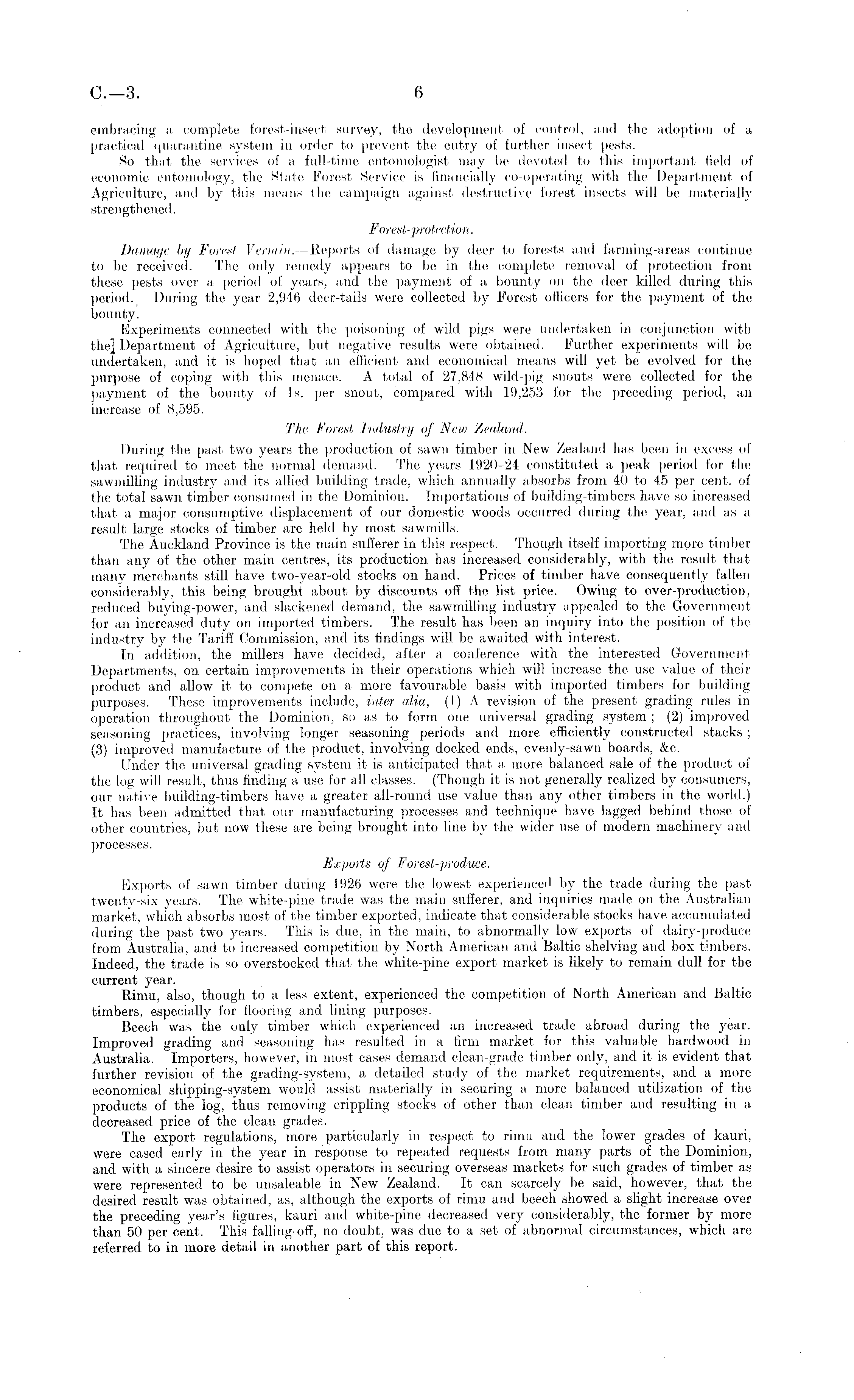 embracing a complete forest-insect survey, the development of control, and the adoption of a practical quarantine system in order to prevent the entry of further insect pests. So that the services of a full-time entomologist may be devoted to this important field of economic entomology, the State Forest Service is financially co-operating with the Department of Agriculture, and by this means the campaign against destructive forest insects will be materially strengthened. Forest-protection. Damage by Forest. Vermin. —Reports of damage by deer to forests and farming-areas continue to be received. The only remedy appears to be in the complete removal of protection from these pests over a period of years, and the payment of a bounty 011 the deer killed during this period. During the year 2,946 deer-tails were collected by Forest officers for the payment of the bounty. Experiments connected with the poisoning of wild pigs were undertaken in conjunction with the] Department of Agriculture, but negative results were obtained. Further experiments will be undertaken, and it is hoped that an efficient and economical means will yet be evolved for the purpose of coping with this menace. A total of 27,848 wild-pig snouts were collected for the payment of the bounty of Is. per snout, compared with 19,253 for the preceding period, an increase of 8,595. The Forest Industry of New Zealand. During the past two years the production of sawn timber in New Zealand has been in excess of that required to meet the normal demand. The years 1920-24 constituted a peak period for the sawmilling industry and its allied building trade, which annually absorbs from 40 to 45 per cent, of the total sawn timber consumed in the Dominion. Importations of building-timbers have so increased that a major consumptive displacement of our domestic woods occurred during the year, and as a result large stocks of timber are held by most sawmills. The Auckland Province is the main sufferer in this respect. Though itself importing more timber than any of the other main centres, its production has increased considerably, with the result that many merchants still have two-year-old stocks on hand. Prices of timber have consequently fallen considerably, this being brought about by discounts off the list price. Owing to over-production, reduced buying-power, and slackened demand, the sawmilling industry appealed to the Government for an increased duty on imported timbers. The result has been an inquiry into the position of the industry by the Tariff Commission, and its findings will be awaited with interest. In addition, the millers have decided, after a conference with the interested Government Departments, on certain improvements in their operations which will increase the use value of their product and allow it to compete on a more favourable basis with imported timbers for building purposes. These improvements include, inter alia, —(1) A revision of the present grading rules in operation throughout the Dominion, so as to form one universal grading system ; (2) improved seasoning practices, involving longer seasoning periods and more efficiently constructed stacks; (3) improved manufacture of the product, involving docked ends, evenly-sawn boards, &c. Under the universal grading system it is anticipated that a more balanced sale of the product of the log will result, thus finding a use for all classes. (Though it is not generally realized by consumers, our native building-timbers have a greater all-round use value than any other timbers in the world.) It has been admitted that our manufacturing processes and technique have lagged behind those of other countries, but now these are being brought into line by the wider use of modern machinery and processes. Ex forts of Forest-froduee. Exports of sawn timber during 1926 were the lowest experienced by the trade during the past twentv-six years. The white-pine trade was the main sufferer, and inquiries made 011 the Australian market, which absorbs most of the timber exported, indicate that considerable stocks have accumulated during the past two years. This is due, in the main, to abnormally low exports of dairy-produce from Australia, and to increased competition by North American and Baltic shelving and box timbers. Indeed, the trade is so overstocked that the white-pine export market is likely to remain dull for the current year. Rimu, also, though to a less extent, experienced the competition of North American and Baltic timbers, especially for flooring and lining purposes. Beech was the only timber which experienced an increased trade abroad during the year. Improved grading and seasoning has resulted in a firm market for this valuable hardwood in Australia. Importers, however, in most cases demand clean-grade timber only, and it is evident that further revision of the grading-system, a detailed study of the market requirements, and a more economical shipping-system would assist materially in securing a more balanced utilization of the products of the log, thus removing crippling stocks of other than clean timber and resulting in a decreased price of the clean grades. The export regulations, more particularly in respect to rimu and the lower grades of kauri, were eased early in the year in response to repeated requests from many parts of the Dominion, and with a sincere desire to assist operators in securing overseas markets for such grades of timber as were represented to be unsaleable in New Zealand. It can scarcely be said, however, that the desired result was obtained, as, although the exports of rimu and beech showed a slight increase over the preceding year's figures, kauri and white-pine decreased very considerably, the former by more than 50 per cent. This falling-off, no doubt, was due to a set of abnormal circumstances, which are referred to in more detail in another part of this report.