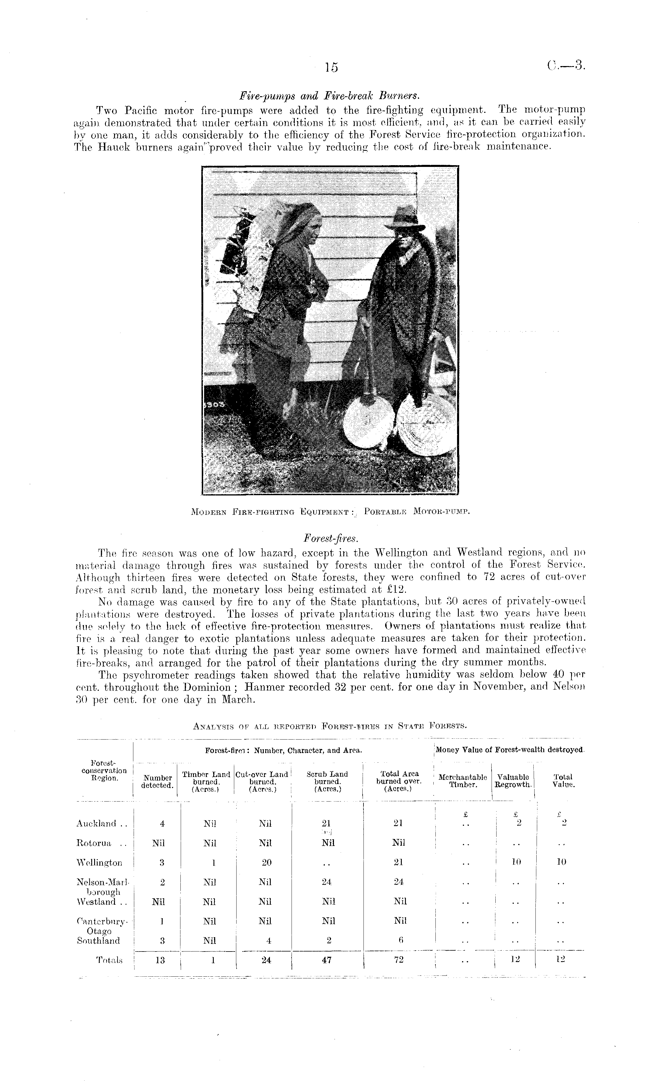 For est-fires. The fire season was one of low hazard, except in the Wellington and Westland regions, and no material damage through fires was sustained by forests under the control of the Forest Service. Although thirteen fires were detected on State forests, they were confined to 72 acres of cut-over forest and scrub land, the monetary loss being estimated at £12. No damage was caused by fire to any of the State plantations, but 30 acres of privately-owned plantations were destroyed. The losses of private plantations during the last two years have been due solely to the lack of effective fire-protection measures. Owners of plantations must realize that fire is a real danger to exotic plantations unless adequate measures are taken for their protection. It is pleasing to note that during the past year some owners have formed and maintained effective fire-breaks, and arranged for the patrol of their plantations during the dry summer months. The psychrometer readings taken showed that the relative humidity was seldom below 40 per cent, throughout the Dominion ; Hanmer recorded 32 per cent, for one day in November, and Nelson 30 per cent, for one day in March.