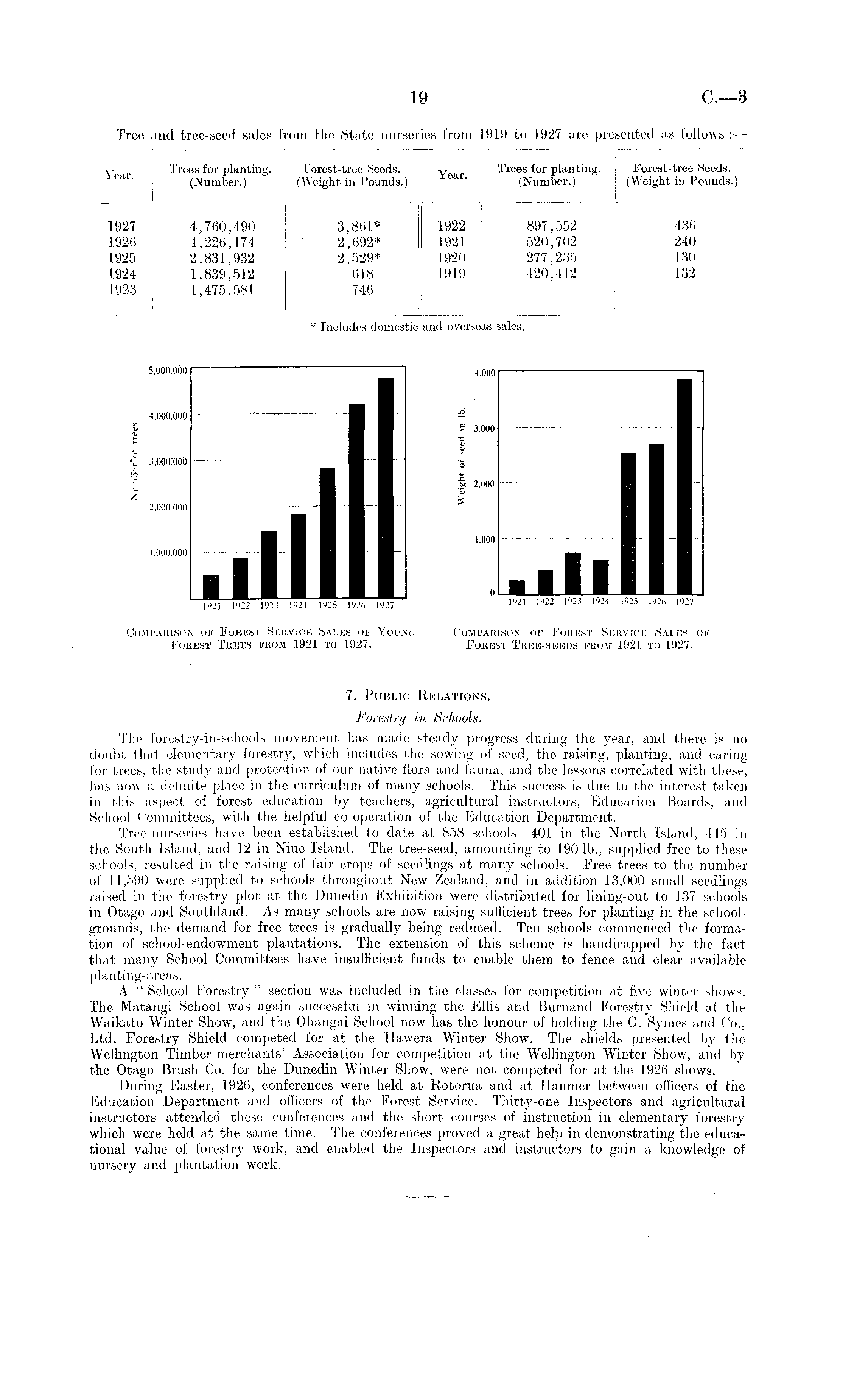 7. Public Relations. Forestry in Schools. The forestry-in-schools movement has made steady progress during the year, and there is no doubt that elementary forestry, which includes the sowing of seed, the raising, planting, and caring for trees, the study and protection of our native flora and fauna, and the lessons correlated with these, has now a definite place in the curriculum of many schools. This success is due to the interest taken in this aspect of forest education by teachers, agricultural instructors, Education Boards, and School Committees, with the helpful co-operation of the Education Department. Tree-nurseries have been established to date at 858 schools—4ol in the North Island, 445 in the South Island, and 12 in Niue Island. The tree-seed, amounting to 1901b., supplied free to these schools, resulted in the raising of fair crops of seedlings at many schools. Free trees to the number of 11,590 were supplied to schools throughout New Zealand, and in addition 13,000 small seedlings raised in the forestry plot at the Dunedin Exhibition were distributed for lining-out to 137 schools in Otago and Southland. As many schools are now raising sufficient trees for planting in the schoolgrounds, the demand for free trees is gradually being reduced. Ten schools commenced the formation of school-endowment plantations. The extension of this scheme is handicapped by the fact that many School Committees have insufficient funds to enable them to fence and clear available planting-areas. A " School Forestry " section was included in the classes for competition at five winter shows. The Matangi School was again successful in winning the Ellis and Burnand Forestry Shield at the Waikato Winter Show, and the Ohangai School now has the honour of holding the G. Symes and Co., Ltd. Forestry Shield competed for at the Hawera Winter Show. The shields presented by the Wellington Timber-merchants' Association for competition at the Wellington Winter Show, and by the Otago Brush Co. for the Dunedin Winter Show, were not competed for at the 1926 shows. During Easter, 1926, conferences were held at Rotorua and at Hanmer between officers of the Education Department and officers of the Forest Service. Thirty-one Inspectors and agricultural instructors attended these conferences and the short courses of instruction in elementary forestry which were held at the same time. The conferences proved a great help in demonstrating the educational value of forestry work, and enabled the Inspectors and instructors to gain a knowledge of nursery and plantation work.