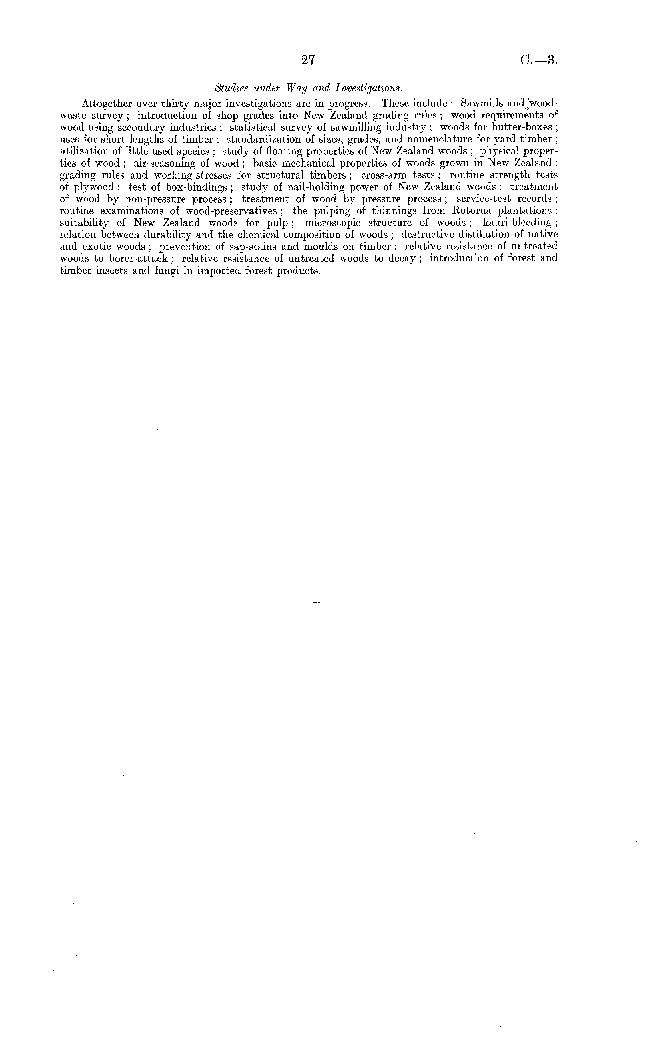 Studies under Way and Investigations. Altogether over thirty major investigations are in progress. These include : Sawmills and "woodwaste survey; introduction of shop grades into New Zealand grading rules ; wood requirements of wood-using secondary industries ; statistical survey of sawmilling industry ; woods for butter-boxes ; uses for short lengths of timber ; standardization of sizes, grades, and nomenclature for yard timber ; utilization of little-used species ; study of floating properties of New Zealand woods ; physical properties of wood ; air-seasoning of wood ; basic mechanical properties of woods grown in New Zealand ; grading rules and working-stresses for structural timbers; cross-arm tests ; routine strength tests of plywood ; test of box-bindings ; study of nail-holding power of New Zealand woods ; treatment of wood by non-pressure process ; treatment of wood by pressure process ; service-test records ; routine examinations of wood-preservatives ; the pulping of thinnings from Rotorua plantations ; suitability of New Zealand woods for pulp; microscopic structure of woods; kauri-bleeding; relation between durability and the chemical composition of woods ; destructive distillation of native and exotic woods ; prevention of sap-stains and moulds on timber ; relative resistance of untreated woods to borer-attack; relative resistance of untreated woods to decay ; introduction of forest and timber insects and fungi in imported forest products.