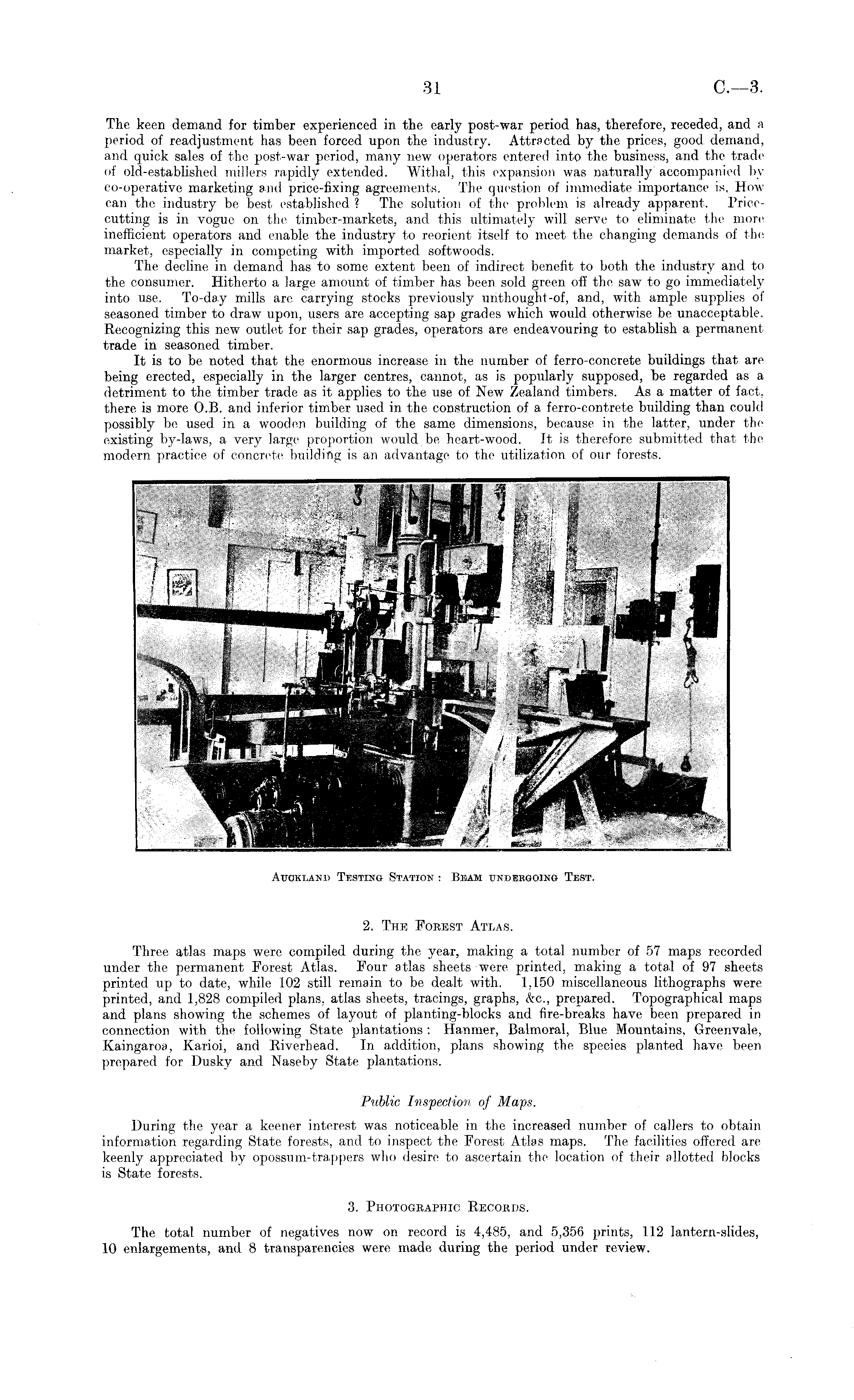 2. The Forest Atlas. Three atlas maps were compiled during the year, making a total number of 57 maps recorded under the permanent Forest Atlas. Four atlas sheets were printed, making a total of 97 sheets printed up to date, while 102 still remain to be dealt with. 1,150 miscellaneous lithographs were printed, and 1,828 compiled plans, atlas sheets, tracings, graphs, &c., prepared. Topographical maps and plans showing the schemes of layout of planting-blocks and fire-breaks have been prepared in connection with the following State plantations : Hanmer, Balmoral, Blue Mountains, Greenvale, Kaingaroa, Karioi, and Riverhead. In addition, plans showing the species planted have been prepared for Dusky and Naseby State plantations. Public Inspection of Maps. During the year a keener interest was noticeable in the increased number of callers to obtain information regarding State forests, and to inspect the Forest Atlas maps. The facilities offered are keenly appreciated by opossum-trappers who desire to ascertain the location of their allotted blocks is State forests. 3. Photographic Records. The total number of negatives now on record is 4,485, and 5,356 prints, 112 lantern-slides, 10 enlargements, and 8 transparencies were made during the period under review.