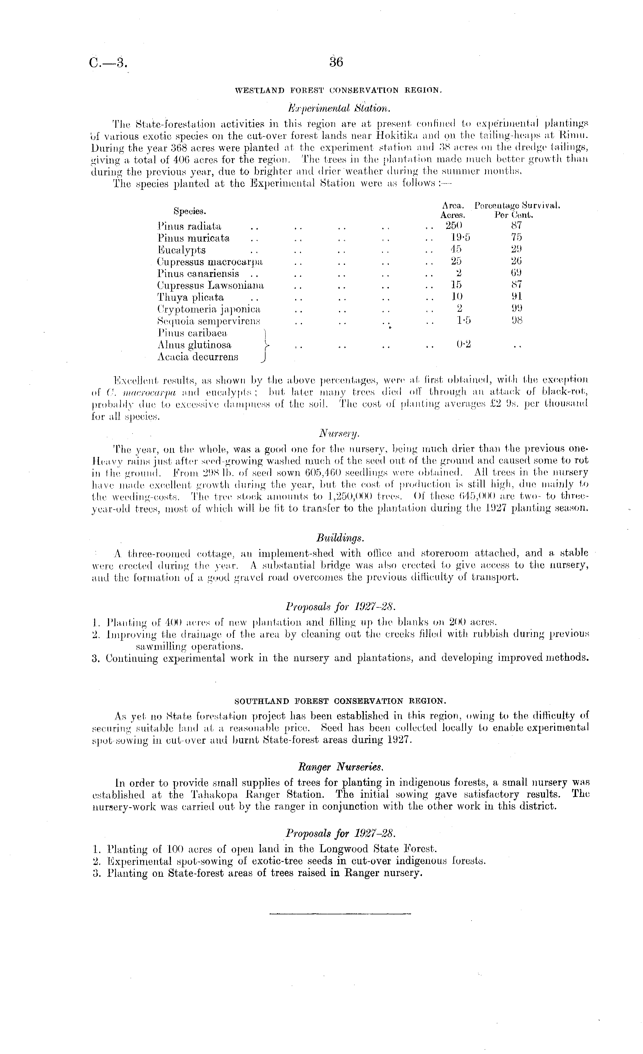 WESTLAND FOREST CONSERVATION REGION. Experimental Station. The State-forestation activities in this region are at present confined to experimental plantings of; various exotic species on the cut-over forest lands near Hokitika and on the tailing-heaps at Rimu. During the year 368 acres were planted at the experiment station and 38 acres on the dredge tailings, giving a total of 406 acres for the region. The trees in the plantation made much better growth than during the previous year, due to brighter and drier weather during the summer months, The species planted at the Experimental Station were as follows : — „ . Area. Percentage Survival, S P 6t!ies - Acres. Per Cent. Pinus radiata .. .. .. .. .. 250 87 Pinus muricata .. .. .. .. .. 19*5 75 Eucalypts .. .. .. .. 4.5 29 Cupressus macrocarpa .. .. .. 25 26 Pinus canariensis .. . . .. .. . . 2 69 Cupressus Lawsoniana .. .. .. 15 87 Thuya plicata .. . . .. .. 10 91 Cryptomeria japonica .. .. .. .. 2 99 Sequoia sempervirens .. .. . . .. T5 98 Pinus caribaea ] Alnus glutinosa )■ .. .. .. .. 0-2 Acacia decurrens J Excellent results, as shown by the above percentages, were at first obtained, with the exception of 0. macrocarpa and eucalypts ; but later many trees died off through an attack of black-rot, probably due to excessive dampness of the soil. The cost of planting averages £2 9s. per thousand for all species. Nursery. The year, on the whole, was a good one for the nursery, being much drier than the previous one. Heavy rains just after seed-growing washed much of the seed out of the ground and.caused some to rot in the ground. From 298 Ib. of seed sown 605,460 seedlings were obtained. All trees in the nursery have made excellent growth during the year, but the cost of production is still high, due mainly to the weeding-costs. The tree stock amounts to 1,250,000 trees. Of these 645,000 are two- to three-year-old trees, most of which will be fit to transfer to the plantation during the 1927 planting season. Buildings. A three-roomed cottage, an implement-shed with office and storeroom attached, and a stable were erected during the year. A substantial bridge was also erected to give access to the nursery, and the formation of a good gravel road overcomes the previous difficulty of transport. Proposals for 1927-28. 1. Planting of 400 acres of new plantation and filling up the blanks on 200 acres. 2. Improving the drainage of the area by cleaning out the creeks filled with rubbish during previous sawmilling operations. 3. Continuing experimental work in the nursery and plantations, and developing improved methods. SOUTHLAND FOREST CONSERVATION REGION. As yet no State forestation project has been established in this region, owing to the difficulty of securing suitable land at a- reasonable price. Seed has been collected locally to enable experimental spot-sowing in cut-over and burnt State-forest areas during 1927. Ranger Nurseries. In order to provide small supplies of trees for planting in indigenous forests, a small nursery was established at the Tahakopa Ranger Station. The initial sowing gave satisfactory results. The nursery-work was carried out by the ranger in conjunction with the other work in this district. Proposals for 1927-28. 1. Planting of 100 acres of open land in the Longwood State Forest. 2. Experimental spot-sowing of exotic-tree seeds in cut-over indigenous forests. 3. Planting on State-forest areas of trees raised in Ranger nursery.