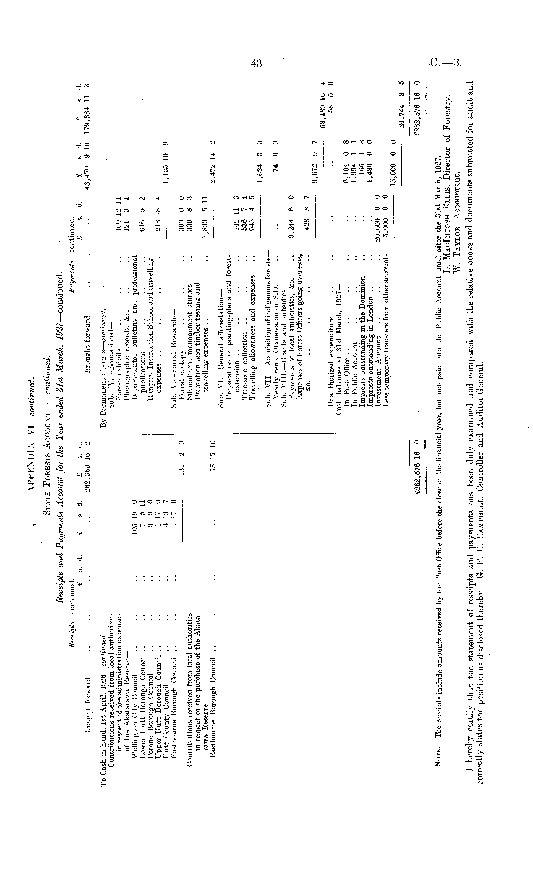 , APPENDIX VI— continued. State Forests Account continued. Receipts and Payments Account for the Year ended 31st March, 1927— continued. lieceipts —continued. Payments — continued. £ s. d. £ s. d. £ s. d. £ s. d. £ s. d. £ s. d. Brought forward .. .. .. .. 262,369 16 2 Brought forward .. .. .. 43,470 9 10 179,334 11 3 To Cash in hand, 1st April, 1926— continued. By Permanent charges— continued. Contributions received from local authorities Sub. IV.— Educational— in respect of the administration expenses Forest exhibits .. .. .. 169 12 11 of the Akatarawa Reserve— Photographic records, &c. .. .. 121 3 4 Wellington City Council .. .. .. 105 19 0 Departmental bulletins and professional Lower Hutt Borough Council .. .. .. 7 5 11 publications .. .. .. 616 5 2 Petone Borough Council .. .. .. 9 9 6 Rangers' Instruction School and travellingUpper Hutt Borough Council .. .. .. 1 17 0 expenses .. .. .. .. 218 18 4 Hutt County Council .. .. .. 4 13 7 1,125 19 9 Eastbourne Borough Council .. .. .. 1 17 0 Sub. V.— Forest Research— 131 2 0 Forest ecology .. .. .. 300 0 0 Contributions received from local authorities Silvicultural management studies .. 339 8 3 in respect of the purchase of the Akata- Utilization and timber-testing and rawa Reserve— travelling-expenses .. .. .. 1,833 5 11 Eastbourne Borough Council .. .. .. .. 75 17 10 2,472 14 2 Sub. VI. —General afforestation— Preparation of planting-plans and forestextension .. .. .. .. 142 11 3 Tree-seed collection .. .. .. 536 7 4 Travelling allowances and expenses .. 945 4 5 1,624 3 0 Sub. VII.— Acquisition of indigenous forests— Yearly rent, Otanewainuku S.D. .. .. 74 0 0 Sub. VIII.— Grants and subsidies— Payments to local authorities, &c. .. 9,244 6 0 Expenses of Forest Officers going overseas, &c. .. .. .. v. 428 3 7 9,672 9 7 58,439 16 4 Unauthorized expenditure .. .. .. .. 58 5 0 Cash balances at 31st March, 1927— In Post Office .. .. .. .. .. 6,104 0 8 In Public Account .. .. .. .. 1,994 1 1 Imprests outstanding in the Dominion .. .. 166 1 8 Imprests outstanding in London .. .. .. 1,480 0 0 Investment Account .. .. .. 20,000 0 0 Less temporary transfers from other accounts 5,000 0 0 15,000 0 0 24,744 3 5 £262,576 16 0 . £262,576 16 0 Note.—The receipts include amounts received by the Post Office before the close of the financial year, but not paid into the Public Account until after the 31st March, 1927. L. MacIntosh Ellis, Director of Forestry. W. Taylor, Accountant. I hereby certify that the statement of receipts and payments has been duly examined and compared with the relative books and documents submitted for audit and correctly states the position as disclosed thereby.— G. F. C. Campbell, Controller and Auditor-General.