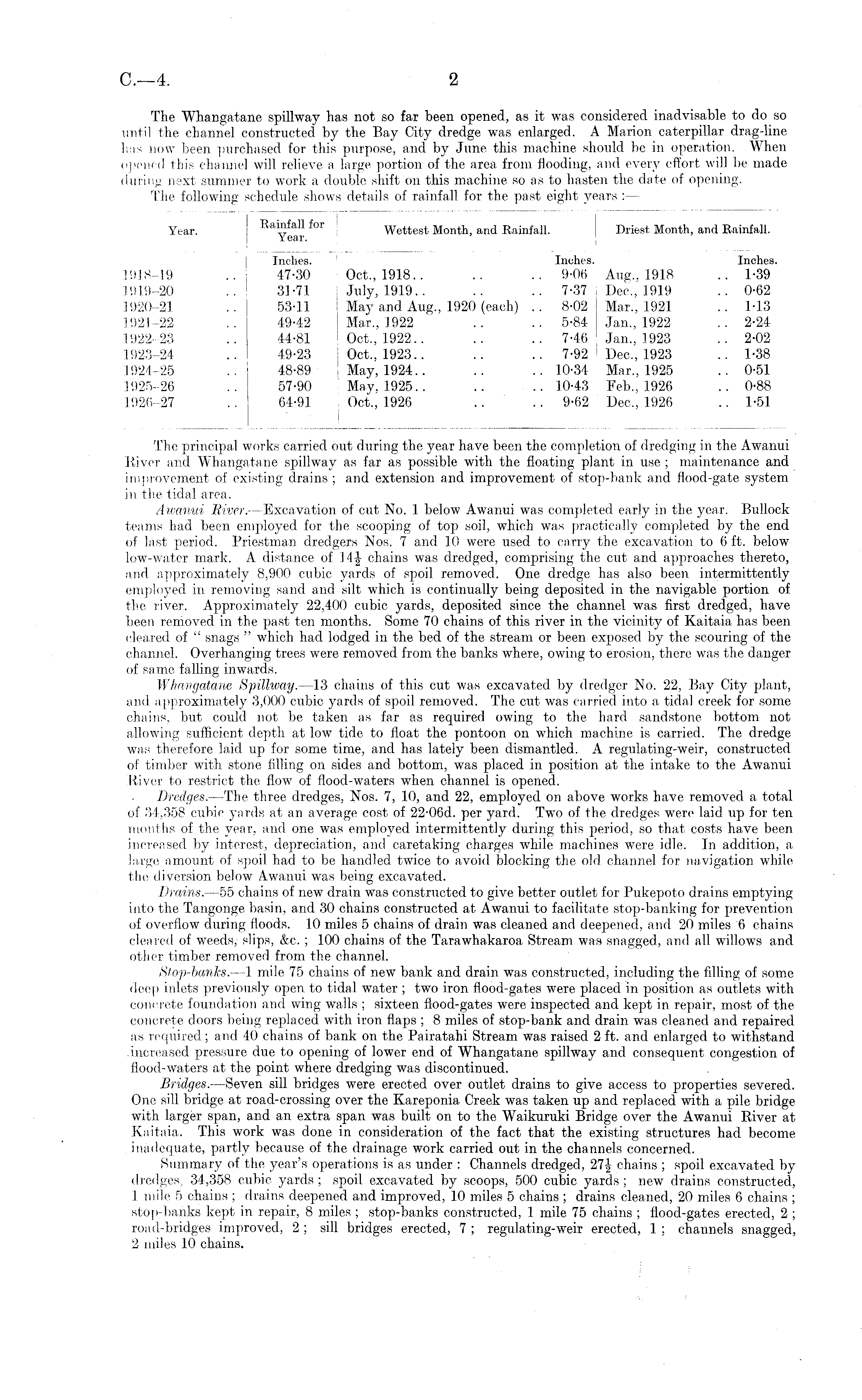 The Whangatane spillway has not so far been opened, as it was considered inadvisable to do so until the channel constructed by the Bay City dredge was enlarged. A Marion caterpillar drag-line has now been purchased for this purpose, and by June this machine should be in operation. When opened this channel will relieve a large portion of the area from flooding, and every effort will be made during next summer to work a double shift on this machine so as to hasten the date of opening. The following schedule shows details of rainfall for the past eight years : —