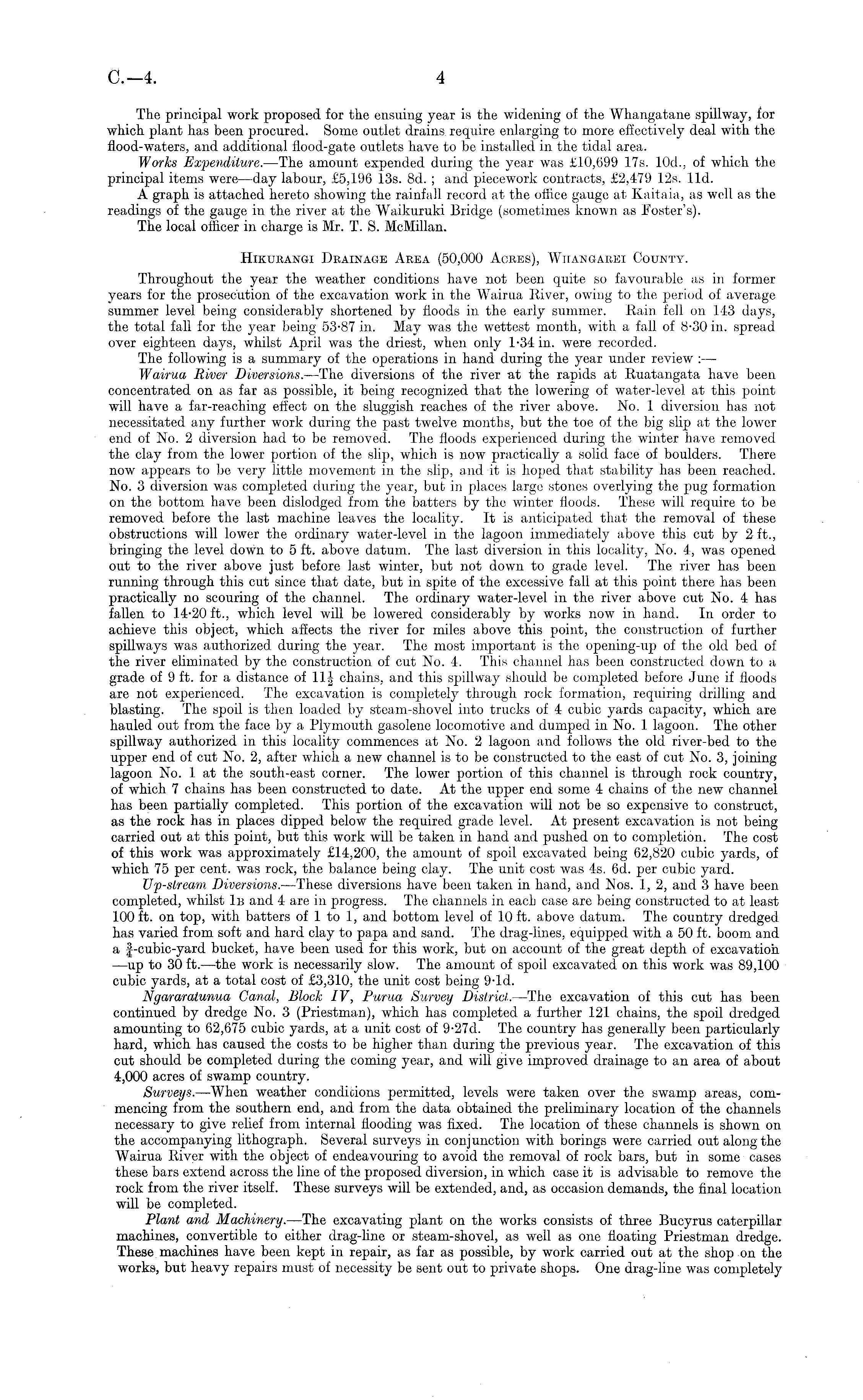 The principal work proposed for the ensuing year is the widening of the Whangatane spillway, for which plant has been procured. Some outlet drains require enlarging to more effectively deal with the flood-waters, and additional flood-gate outlets have to be installed in the tidal area. Works Expenditure. —The amount expended during the year was £10,699 17s. 10d., of which the principal items were —day labour, £5,196 13s. Bd. ; and piecework contracts, £2,479 12s. lid. A graph is attached hereto showing the rainfall record at the office gauge at Kaitaia, as well as the readings of the gauge in the river at the Waikuruki Bridge (sometimes known as Foster's). The local officer in charge is Mr. T. S. McMillan. Hikurangi Drainage Area (50,000 Acres), Wiiangarei County. Throughout the year the weather conditions have not been quite so favourable as in former years for the prosecution of the excavation work in the Wairua River, owing to the period of average summer level being considerably shortened by floods in the early summer. Rain fell on 143 days, the total fall for the year being 53-87 in. May was the wettest month, with a fall of 8-30 in. spread over eighteen days, whilst April was the driest, when only 1-34 in. were recorded. The following is a summary of the operations in hand during the year under review : — Wairua River Diversions. —The diversions of the river at the rapids at Ruatangata have been concentrated on as far as possible, it being recognized that the lowering of water-level at this point will have a far-reaching effect on the sluggish reaches of the river above. No. 1 diversion has not necessitated any further work during the past twelve months, but the toe of the big slip at the lower end of No. 2 diversion had to be removed. The floods experienced during the winter have removed the clay from the lower portion of the slip, which is now practically a solid face of boulders. There now appears to be very little movement in the slip, and it is hoped that stability has been reached. No. 3 diversion was completed during the year, but in places large stones overlying the pug formation on the bottom have been dislodged from the batters by the winter floods. These will require to be removed before the last machine leaves the locality. It is anticipated that the removal of these obstructions will lower the ordinary water-level in the lagoon immediately above this cut by 2 ft., bringing the level down to 5 ft. above datum. The last diversion in this locality, No. 4, was opened out to the river above just before last winter, but not down to grade level. The river has been running through this cut since that date, but in spite of the excessive fall at this point there has been practically no scouring of the channel. The ordinary water-level in the river above cut No. 4 has fallen to 14-20 ft., which level will be lowered considerably by works now in hand. In order to achieve this object, which affects the river for miles above this point, the construction of further spillways was authorized during the year. The most important is the opening-up of the old bed of the river eliminated by the construction of cut No. 4. This channel has been constructed down to a grade of 9 ft. for a distance of 11J chains, and this spillway should be completed before June if floods are not experienced. The excavation is completely through rock formation, requiring drilling and blasting. The spoil is then loaded by steam-shovel into trucks of 4 cubic yards capacity, which are hauled out from the face by a Plymouth gasolene locomotive and dumped in No. 1 lagoon. The other spillway authorized in this locality commences at No. 2 lagoon and follows the old river-bed to the upper end of cut No. 2, after which a new channel is to be constructed to the east of cut No. 3, joining lagoon No. lat the south-east corner. The lower portion of this channel is through rock country, of which 7 chains has been constructed to date. At the upper end some 4 chains of the new channel has been partially completed. This portion of the excavation will not be so expensive to construct, as the rock has in places dipped below the required grade level. At present excavation is not being carried out at this point, but this work will be taken in hand and pushed on to completion. The cost of this work was approximately £14,200, the amount of spoil excavated being 62,820 cubic yards, of which 75 per cent, was rock, the balance being clay. The unit cost was 4s. 6d. per cubic yard. Up-stream Diversions.—These diversions have been taken in hand, and Nos. 1, 2, and 3 have been completed, whilst 1b and 4 are in progress. The channels in eacl) case are being constructed to at least 100 ft. on top, with batters of Ito 1, and bottom level of 10 ft. above datum. The country dredged has varied from soft and hard clay to papa and sand. The drag-lines, equipped with aSO ft. boom and a f-cubic-yard bucket, have been used for this work, but on account of the great depth of excavation —up to 30 ft.—the work is necessarily slow. The amount of spoil excavated on this work was 89,100 cubic yards, at a total cost of £3,310, the unit cost being 9Td. Ngararatunua Canal, Block IV, Purua Survey District. —The excavation of this cut has been continued by dredge No. 3 (Priestman), which has completed a further 121 chains, the spoil dredged amounting to 62,675 cubic yards, at a unit cost of 9-27 d. The country has generally been particularly hard, which has caused the costs to be higher than during the previous year. The excavation of this cut should be completed during the coming year, and will give improved drainage to an area of about 4,000 acres of swamp country. Surveys. —When weather conditions permitted, levels were taken over the swamp areas, commencing from the southern end, and from the data obtained the preliminary location of the channels necessary to give relief from internal flooding was fixed. The location of these channels i