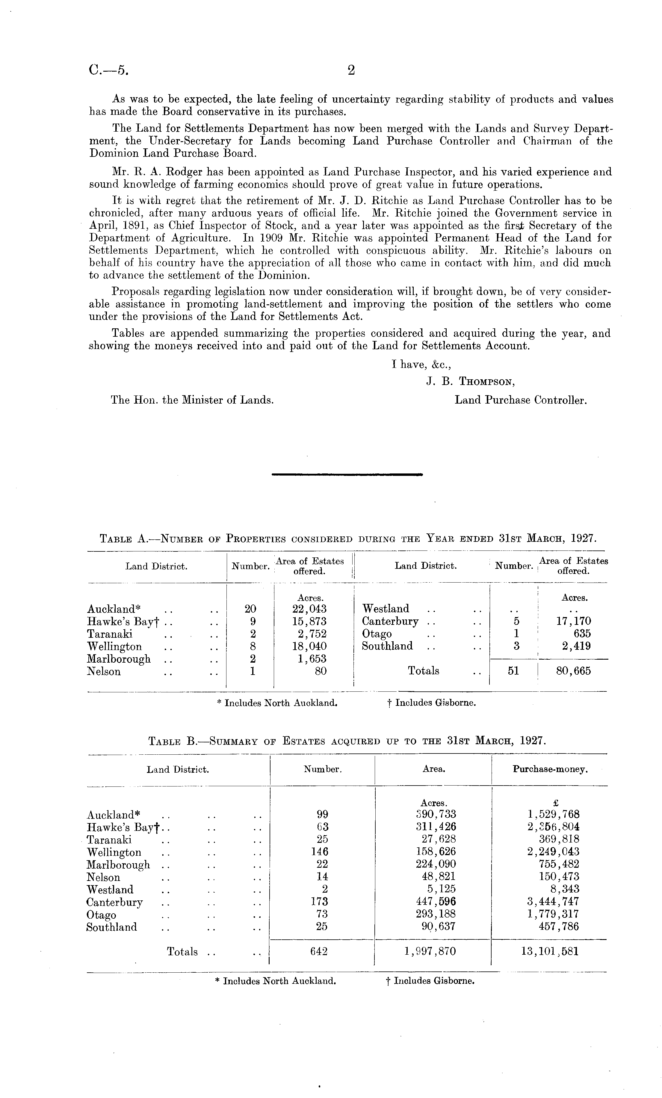 As was to be expected, the late feeling of uncertainty regarding stability of products and values has made the Board conservative in its purchases. The Land for Settlements Department has now been merged with the Lands and Survey Department, the Under-Secretary for Lands becoming Land Purchase Controller and Chairman of the Dominion Land Purchase Board. Mr. R. A. Rodger has been appointed as Land Purchase Inspector, and his varied experience and sound knowledge of farming economics should prove of great value in future operations. It is with regret that the retirement of Mr. J. D. Ritchie as Land Purchase Controller has to be chronicled, after many arduous years of official life. Mr. Ritchie joined the Government service in April, 1891, as Chief Inspector of Stock, and a year later was appointed as the first Secretary of the Department of Agriculture. In 1909 Mr. Ritchie was appointed Permanent Head of the Land for Settlements Department, which he controlled with conspicuous ability. Mr. Ritchie's labours on behalf of his country have the appreciation of all those who came in contact with him, and did much to advance the settlement of the Dominion. Proposals regarding legislation now under consideration will, if brought down, be of very considerable assistance in promoting land-settlement and improving the position of the settlers who come under the provisions of the Land for Settlements Act. Tables are appended summarizing the properties considered and acquired during the year, and showing the moneys received into and paid out of the Land for Settlements Account. I have, &c., J. B. Thompson, The Hon. the Minister of Lands. Land Purchase Controller.