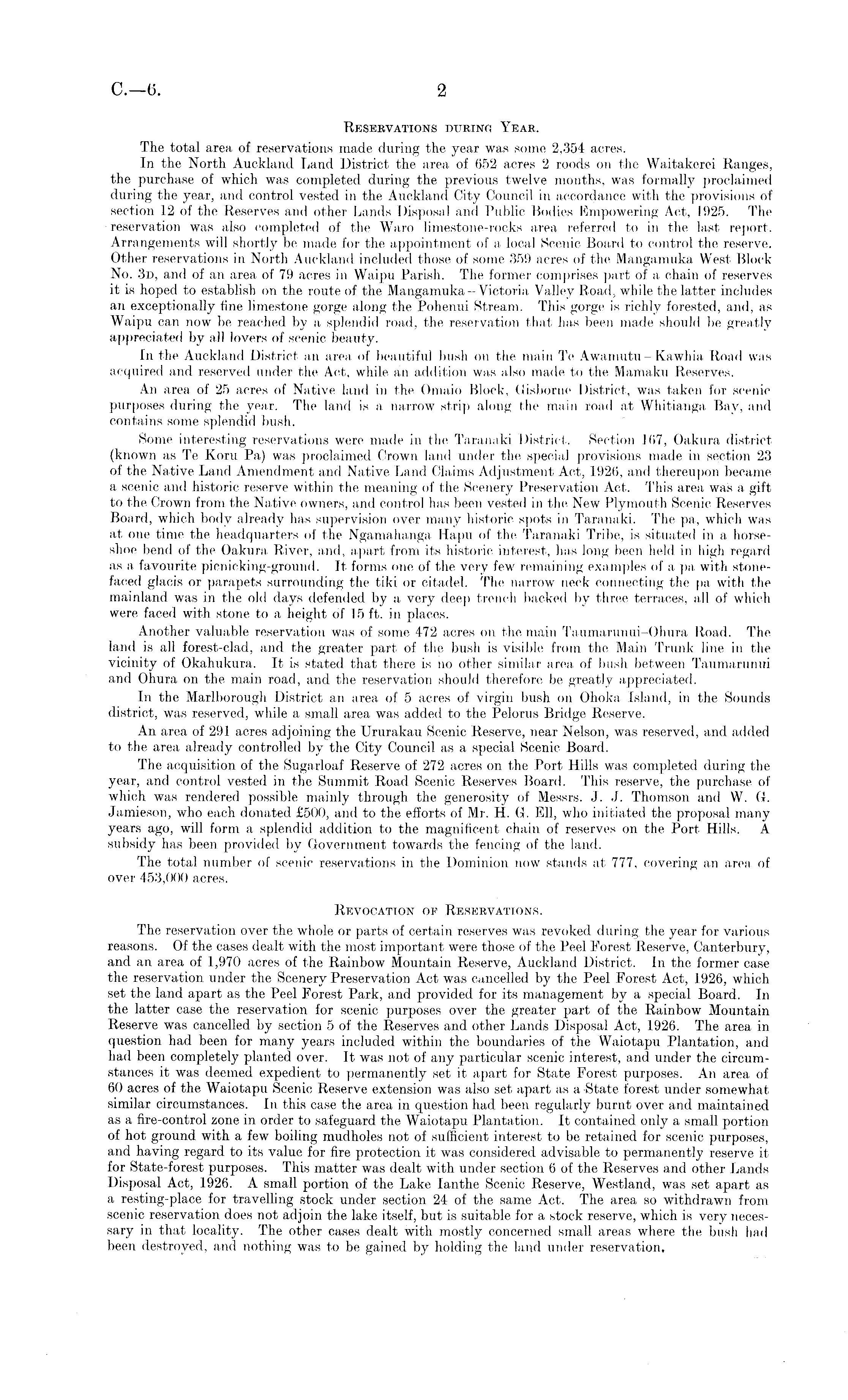 Reservations during Year. The total area of reservations made during the year was some 2,354 acres. In the North Auckland Land District the area of 652 acres 2 roods on the Waitakerei Ranges, the purchase of which was completed during the previous twelve months, was formally proclaimed during the year, and control vested in the Auckland City Council in accordance with the provisions of section 12 of the Reserves and other Lands Disposal and Public Bodies Empowering Act, 1925. The reservation was also completed of the Waro limestone-rocks area referred to in the last report. Arrangements will shortly be made for the appointment of a local Scenic Board to control the reserve. Other reservations in North Auckland included those of some 359 acres of the Manga,muka West Block No. 3d, and of an area of 79 acres in Waipu Parish. The former comprises part of a chain of reserves it is hoped to establish on the route of the Mangamuka - Victoria Valley Road, while the latter includes an exceptionally fine limestone gorge along the Pohenui Stream. This gorge is richly forested, and, as Waipu can now be reached by a splendid road, the reservation that has been made should be greatly appreciated by all lovers of scenic beauty. In the Auckland District an area of beautiful bush on the main Te Awamutu - Kawhia Road was acquired and reserved under the Act, while an addition was also made to the Mamaku Reserves. An area of 25 acres of Native land in the Omaio Block, Gisborne District, was taken for scenic purposes during the year. The land is a narrow strip along the main road at Whitianga Bay, and contains some splendid bush. Some interesting reservations were made in the Taranaki District. Section-167, Oakura district (known as Te Koru Pa) was proclaimed Crown land under the special provisions made in section 23 of the Native Land Amendment and Native Land Claims Adjustment Act, 1926, and thereupon became a scenic and historic reserve within the meaning of the Scenery Preservation Act. This area was a gift to the Crown from the Native owners, and control has been vested in the New Plymouth Scenic Reserves Board, which body already has supervision over many historic spots in Taranaki. The pa, which was at one time the headquarters of the Ngamahanga Hapu of the Taranaki Tribe, is situated in a horseshoe bend of the Oakura River, and, apart from its historic interest, has long been held in high regard as a favourite picnicking-ground. It forms one of the very few remaining examples of apa with stonefaced glacis or parapets surrounding the tiki or citadel. The narrow neck connecting the pa with the mainland was in the old days defended by a very deep trench backed by three terraces, all of which were faced with stone to a height of 15 ft. in places. Another valuable reservation was of some 472 acres on the main Taumarunui-Ohura Road. The land is all forest-clad, and the greater part of the bush is visible from the Main Trunk line in the vicinity of Okahukura. It is stated that there is no other similar area of bush between Taumarunui and Ohura on the main road, and the reservation should therefore be greatly appreciated. In the Marlborough District an area of 5 acres of virgin bush on Ohoka Island, in the Sounds district, was reserved, while a small area was added to the Pelorus Bridge Reserve. An area of 291 acres adjoining the Ururakau Scenic Reserve, near Nelson, was reserved, and added to the area already controlled by the City Council as a special Scenic Board. The acquisition of the Sugarloaf Reserve of 272 acres on the Port Hills was completed during the year, and control vested in the Summit Road Scenic Reserves Board. This reserve, the purchase of which was rendered possible mainly through the generosity of Messrs. J. J. Thomson and W. G. Jamieson, who each donated £500, and to the efforts of Mr. H. G. Ell, who initiated the proposal many years ago, will form a splendid addition to the magnificent chain of reserves on the Port Hills. A subsidy has been provided by Government towards the fencing of the land. The total number of scenic reservations in the Dominion now stands at 777, covering an area of over 453,000 acres. Revocation of Reservations. The reservation over the whole or parts of certain reserves was revoked during the year for various reasons. Of the cases dealt with the most important were those of the Peel Forest Reserve, Canterbury, and an area of 1,970 acres of the Rainbow Mountain Reserve, Auckland District. In the former case the reservation under the Scenery Preservation Act was cancelled by the Peel Forest Act, 1926, which set the land apart as the Peel Forest Park, and provided for its management by a special Board. In the latter case the reservation for scenic purposes over the greater part of the Rainbow Mountain Reserve was cancelled by section sof the Reserves and other Lands Disposal Act, 1926. The area in question had been for many years included within the boundaries of the Waiotapu Plantation, and had been completely planted over. It was not of any particular scenic interest, and under the circumstances it was deemed expedient to permanently set it apart for State Forest purposes. An area of 60 acres of the Waiotapu Scenic Reserve extension was also set apart as a State forest under somewhat similar circumstances. In this case the area in question had been regularly burnt over and maintained as a fire-control zone in order to safeguard the Waiotapu Plantation. It contained only a small portion of hot ground with a few boiling mudholes not of sufficient interest to be retained for scenic purposes, and having regard to its value for fire protection it was considered advisable to permanently reserve it for State-forest purposes. This matter was dealt with under section 6of the Reserves and other Lands Disposal Act, 1926. A small portion of the Lake lanthe Scenic Reserve, Westland, was set apart as a resting-place for travelling stock under section 24 of the same Act. The a