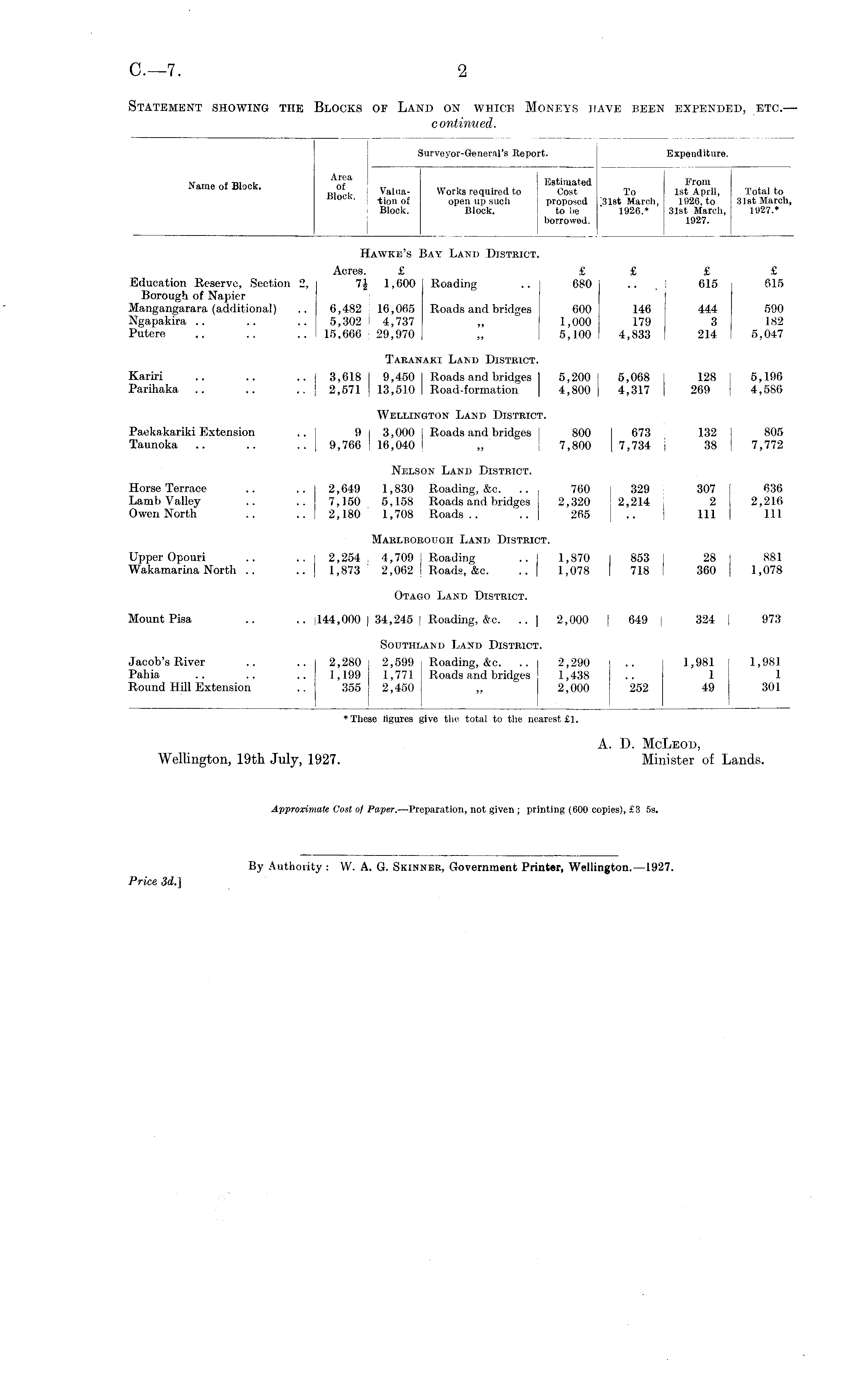 A. D. McLeod, Wellington, 19th July, 1927. Minister of Lands.