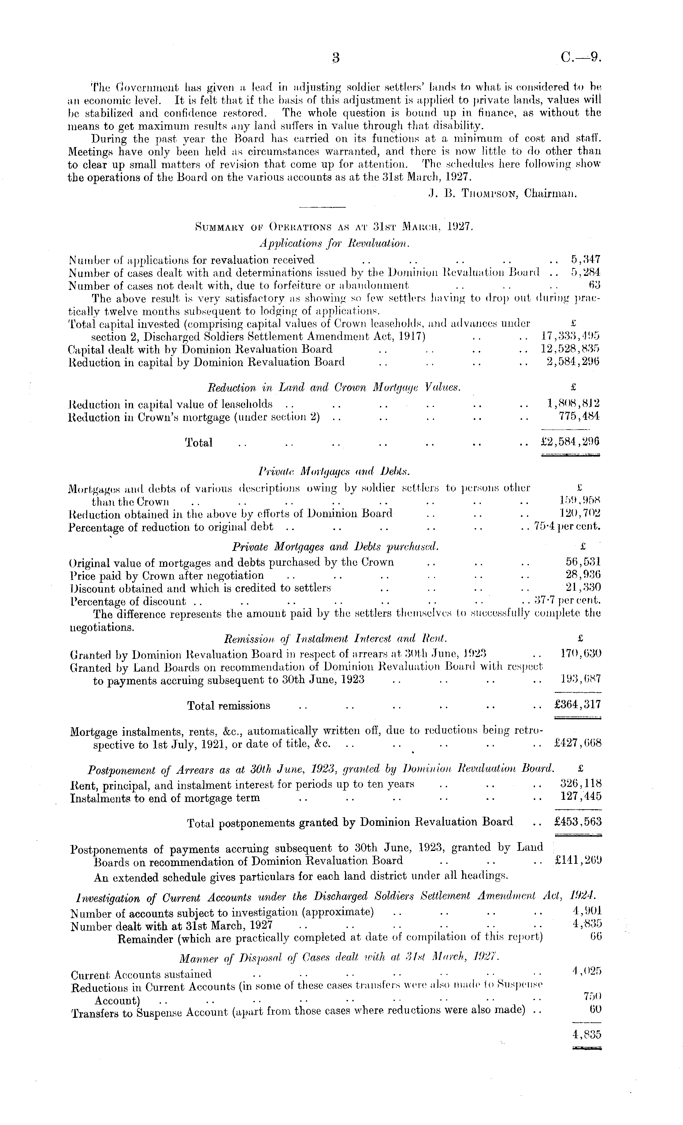 The Government lias given a lead in adjusting soldier settlers' lands to what is considered to be an economic level. It is felt that if the basis of this adjustment is applied to private lands, values will be stabilized and confidence restored. The whole question is bound up in finance, as without the means to get maximum results any land suffers in value through that disability. During the past year the Board has carried on its functions at a minimum of cost and staff. Meetings have only been held as circumstances warranted, and there is now little to do other than to clear up small matters of revision that come up for attention. The schedules here following show the operations of the Board on the Various accounts as at the 31st March, 1927. J. B. Thompson, Chairman. Summary of Operations as at 31st March, 1927. Applications for Revaluation. Number of applications for revaluation received .. .. .. .. .. 5,347 Number of cases dealt with and determinations issued by the Dominion Revaluation Board .. 5,284 Number of cases not dealt with, due to forfeiture or abandonment .. . . .. 63 The above result is very satisfactory as showing so few settlers having to drop out during practically twelve months subsequent to lodging of applications. Total capital invested (comprising capital values of Crown leaseholds, and advances under £ section 2, Discharged Soldiers Settlement Amendment Act, 1917) .. .. 17,333,495 Capital dealt with by Dominion Revaluation Board .. .. .. .. 12,528,835 Reduction in capital by Dominion Revaluation Board .. .. .. .. 2,584,296 Reduction in Land and Crown Mortgage Values. £ Reduction in capital value of leaseholds .. .. .. .. .. .. 1,808,812 Reduction in Crown's mortgage (under section 2) .. .. .. .. .. 775,484 Total £2,584,296 Private Mortgages and Debts. Mortgages and debts of various descriptions owing by soldier settlers to persons other £ than the Crown .. .. .. •• •• •• •• •• 159,958 Reduction obtained in the above by efforts of Dominion Board .. .. .. 120,702 Percentage of reduction to original debt .. .. .. .. .. .. 75-4 per cent. Private Mortgages and Debts purchased. £ Original value of mortgages and debts purchased by the Crown .. .. .. 56,531 Price paid by Crown after negotiation .. .. .. . . .. .. 28, 936 Discount obtained and which is credited to settlers .. .. .. .. 21,330 Percentage of discount .. .. .. •• .. 37-7 per cent. The difference represents the amount paid by the settlers themselves to successfully complete the negotiations. Remission of Instalment Interest and Rent. £ Granted by Dominion Revaluation Board in respect of arrears at 30fch June, 1923 . . 170,630 Granted by Land Boards on recommendation of Dominion Revaluation Board with respect to payments accruing subsequent to 30th June, 1923 .. .. .. .. 193,687 Total remissions .. .. .. .. .. .. £364,317 Mortgage instalments, rents, &c., automatically written off, due to reductions being retrospective to Ist July, 1921, or date of title, &c. .. .. .. .. .. £427,668 Postponement of Arrears as at 30th June, 1923, granted by Dominion Revaluation Board. £ Rent, principal, and instalment interest for periods up to ten years .. .. .. 326,118 Instalments to end of mortgage term .. .. .. •• •• •• 127,445 Total postponements granted by Dominion Revaluation Board .. £453,563 Postponements of payments accruing subsequent to 30th June, 1923, granted by Land Boards on recommendation of Dominion Revaluation Board .. .. .. £141,269 An extended schedule gives particulars for each land district under all headings. Investigation of Current Accounts wider the Discharged Soldiers Settlement Amendment Act, 1924. Number of accounts subject to investigation (approximate) .. .. .. .. 4,901 Number dealt with at 31st March, 1927 .. .. • • ■ ■ • • • • 4,-835 Remainder (which are practically completed at date of compilation of this report) 66 Manner of Disposal of Gases dealt with at 31st March, 1927. Current Accounts sustained .. • ■ • • • • • • • • • • 4,025 Reductions in Current Accounts (in some of these cases transfers were also made to Suspense Account) .. •• •• •• Transfers to Suspense Account (apart from those cases where reductions were also made) .. 60 4,835
