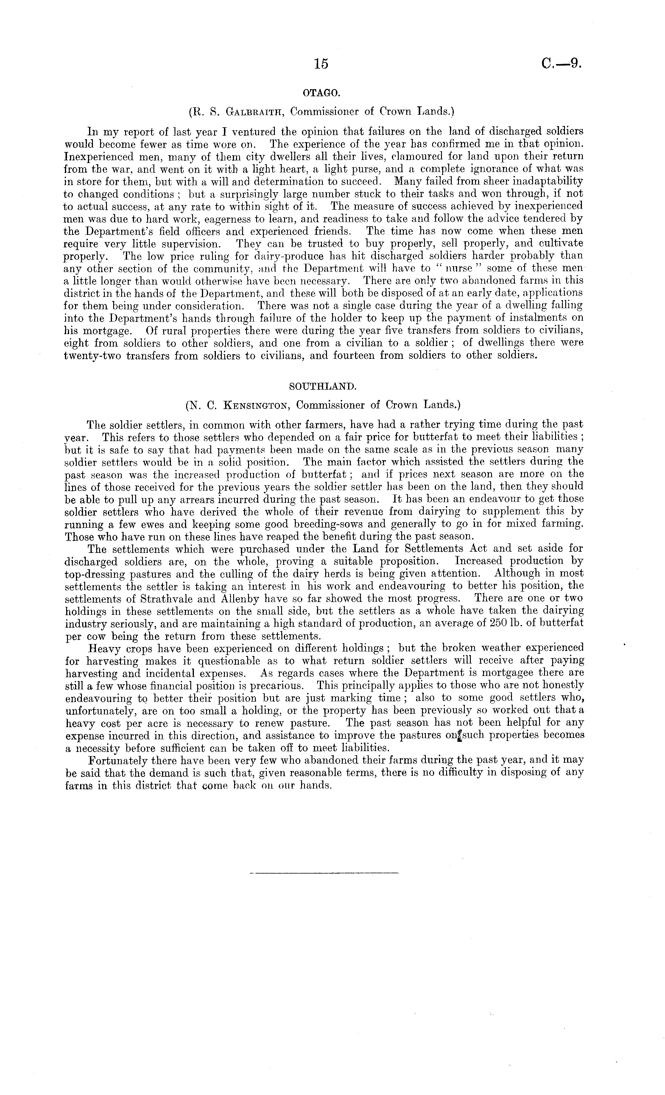 OTAGO. (R. S. Galbraith, Commissioner of Crown Lands.) In my report of last year I ventured the opinion that failures on the land of discharged soldiers would become fewer as time wore on. The experience of the year has confirmed me in that opinion. Inexperienced men, many of them city dwellers all their lives, clamoured for land upon their return from the war, and went on it with a light heart, a light purse, and a complete ignorance of what was in store for them, but with a will and determination to succeed. Many failed from sheer inadaptability to changed conditions ; but a surprisingly large number stuck to their tasks and won through, if not to actual success, at any rate to within sight of it. The measure of success achieved by inexperienced men was due to hard work, eagerness to learn, and readiness to take and follow the advice tendered by the .Department's field officers and experienced friends. The time has now come when these men require very little supervision. They can be trusted to buy properly, sell properly, and cultivate properly. The low price ruling for dairy-produce has hit discharged soldiers harder probably than any other section of the community, and the Department will have to " nurse " some of these men a little longer than would otherwise have been necessary. There are only two abandoned farms in this district in the hands of the Department, and these will both be disposed of at an early date, applications for them being under consideration. There was not a single case during the year of a dwelling falling into the Department's hands through failure of the holder to keep up the payment of instalments on his mortgage. Of rural properties there were during the year five transfers from soldiers to civilians, eight from soldiers to other soldiers, and one from a civilian to a soldier ; of dwellings there were twenty-two transfers from soldiers to civilians, and fourteen from soldiers to other soldiers. SOUTHLAND. (N. C. Kensington, Commissioner of Crown Lands.) The soldier settlers, in common with other farmers, have had a rather trying time during the past year. This refers to those settlers who depended on a fair price for butterfat to meet their liabilities ; "but it is safe to say that had payments been made on the same scale as in the previous season many soldier settlers would be in a solid position. The main factor which assisted the settlers during the past season was the increased production of butterfat; and if prices next season are more on the lines of those received for the previous years the soldier settler has been on the land, then they should be able to pull up any arrears incurred during the past season. It has been an endeavour to get those soldier settlers who have derived the whole of their revenue from dairying to supplement this by running a few ewes and keeping some good breeding-sows and generally to go in for mixed farming. Those who have run on these lines have reaped the benefit during the past season. The settlements which were purchased under the Land for Settlements Act and set aside for discharged soldiers are, on the whole, proving a suitable proposition. Increased production by top-dressing pastures and the culling of the dairy herds is being given attention. Although in most settlements the settler is taking an interest in his work and endeavouring to better his position, the settlements of Strathvale and Allenby have so far showed the most progress. There are one or two holdings in these settlements on the small side, but the settlers as a whole have taken the dairying industry seriously, and are maintaining a high standard of production, an average of 250 lb. of butterfat per cow being the return from these settlements. Heavy crops have been experienced on different holdings ; but the broken weather experienced for harvesting makes it questionable as to what return soldier settlers will receive after paying harvesting and incidental expenses. As regards cases where the Department is mortgagee there are still a few whose financial position is precarious. This principally applies to those who are not honestly endeavouring to better their position but are just marking time ; also to some good settlers who, unfortunately, are on too small a holding, or the property has been previously so worked out that a heavy cost per acre is necessary to renew pasture. The past season has not been helpful for any expense incurred in this direction, and assistance to improve the pastures onjsuch properties becomes a necessity before sufficient can be taken off to meet liabilities. Fortunately there have been very few who abandoned their farms during the past year, and it may be said that the demand is such that, given reasonable terms, there is 110 difficulty in disposing of any farms in this district that come back 011 our hands.