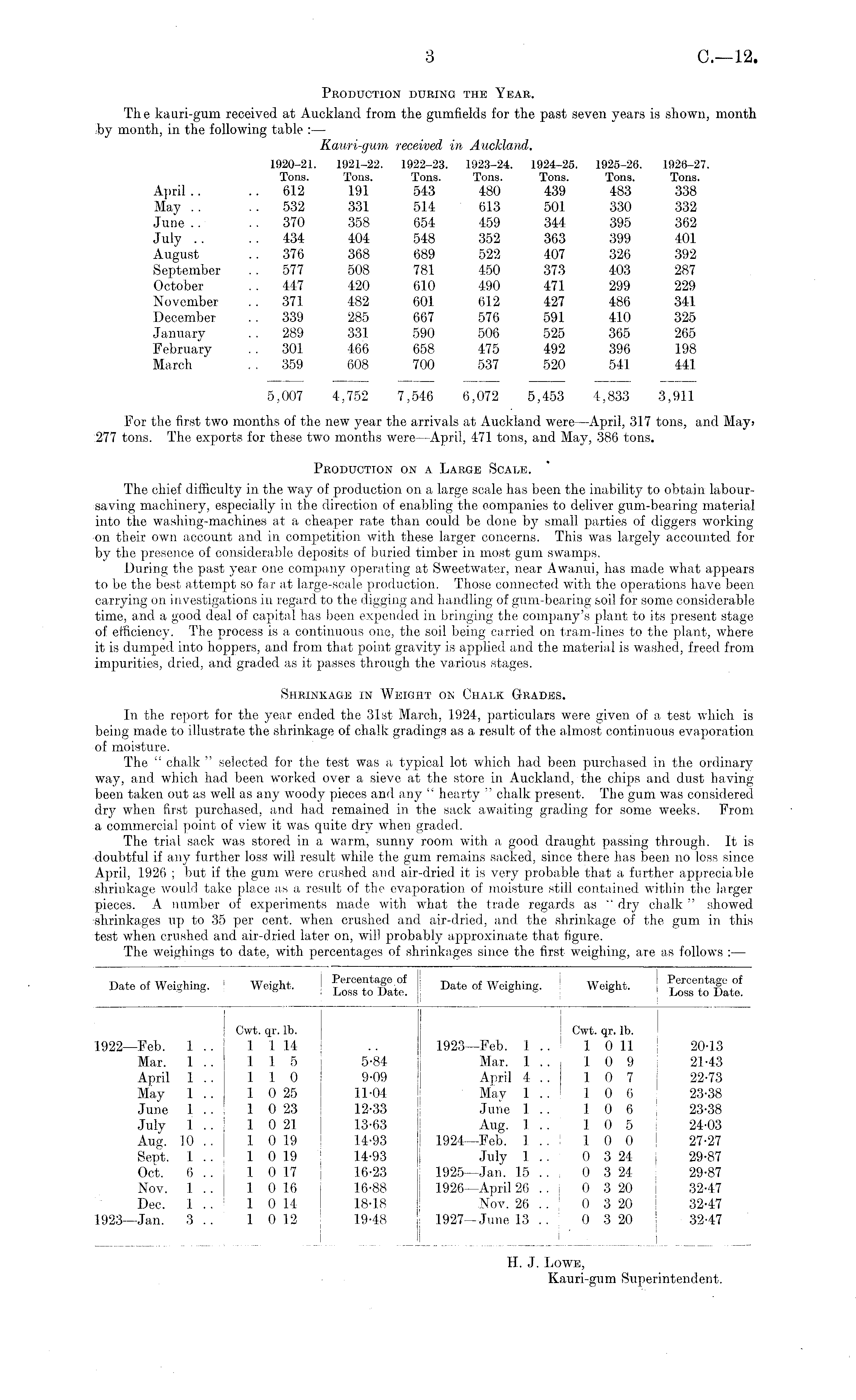 Production during the Year. The kauri-gum received at Auckland from the gumfields for the past seven years is shown, month ,by month, in the following table : — Kauri-gum received in Auckland. 1920-21. 1921-22. 1922-23. 1923-24. 1924-25. 1925-26. 1928-27. Tons. Tons. Tons. Tons. Tons. Tons. Tons. April .. .. 612 191 543 480 439 483 338 May .. .. 532 331 514 613 501 330 332 June .. .. 370 358 654 459 344 395 362 July .. .. 434 404 548 352 363 399 401 August .. 376 368 689 522 407 326 392 September .. 577 508 781 450 373 403 287 October .. 447 420 610 490 471 299 229 November . . 371 482 601 612 427 486 341 December . . 339 285 667 576 591 410 325 Januarv .. 289 331 590 506 525 365 265 February .. 301 466 658 475 492 396 198 March " . . 359 608 700 537 520 541 441 5,007 4,752 7,546 6,072 5,453 4,833 3,911 For the first two months of the new year the arrivals at Auckland were —April, 317 tons, and May> 277 tons. The exports for these two months were—April, 471 tons, and May, 386 tons. Production on a Large Scale. The chief difficulty in the way of production on a large scale has been the inability to obtain laboursaving machinery, especially in the direction of enabling the companies to deliver gum-bearing material into the washing-machines at a cheaper rate than could be done by small parties of diggers working on their own account and in competition with these larger concerns. This was largely accounted for by the presence of considerable deposits of buried timber in most gum swamps. During the past year one company operating at Sweetwater, near Awanui, has made what appears to be the best attempt so far at large-scale production. Those connected with the operations have been carrying on investigations in regard to the digging and handling of gum-bearing soil for some considerable time, and a good deal of capital has been expended in bringing the company's plant to its present stage of efficiency. The process is a continuous one, the soil being carried on tram-lines to the plant, where it is dumped into hoppers, and from that point gravity is applied and the material is washed, freed from impurities, dried, and graded as it passes through the various stages. Shrinkage in Weight on Chalk: Grades. In the report for the year ended the 31st March, 1924, particulars were given of a test which is being made to illustrate the shrinkage of chalk gradings as a result of the almost continuous evaporation of moisture. The " chalk " selected for the test was a typical lot which had been purchased in the ordinary way, and which had been worked over a sieve at the store in Auckland, the chips and dust having been taken out as well as any woody pieces and any " hearty " chalk present. The gum was considered dry when first purchased, and had remained in the sack awaiting grading for some weeks. From a commercial point of view it was quite dry when graded. The trial sack was stored in a warm, sunny room with a good draught passing through. It is doubtful if any further loss will result while the gum remains sacked, since there has been no loss since April, 1926 ; but if the gum were crushed and air-dried it is very probable that a further appreciable shrinkage would take place as a result of the evaporation of moisture still contained within the larger pieces. A number of experiments made with what the trade regards as " dry chalk " showed shrinkages up to 35 per cent, when crushed and air-dried, and the shrinkage of the gum in this test when crushed and air-dried later on, will probably approximate that figure. The weighings to date, with percentages of shrinkages since the first weighing, are as follows : —