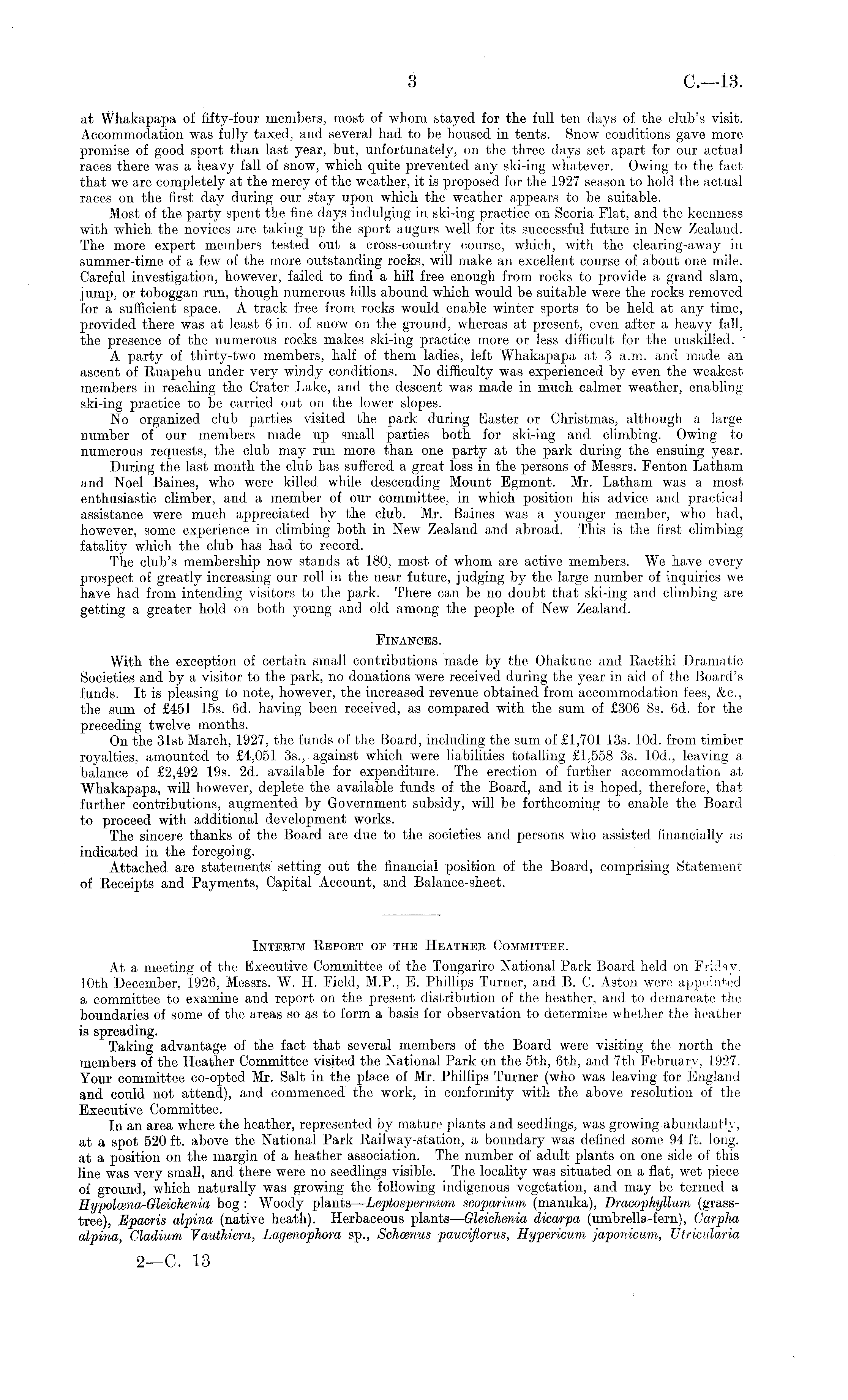 at Whakapapa of fifty-four members, most of whom stayed for the full ten days of the club's visit. Accommodation was fully taxed, and several had to be housed in tents. Snow conditions gave more promise of good sport than last year, but, unfortunately, on the three days set apart for our actual races there was a heavy fall of snow, which quite prevented any ski-ing whatever. Owing to the fact that we are completely at the mercy of the weather, it is proposed for the 1927 season to hold the actual races on the first day during our stay upon which the weather appears to be suitable. Most of the party spent the fine days indulging in ski-ing practice on Scoria Plat, and the keenness with which the novices are taking up the sport augurs well for its successful future in New Zealand. The more expert members tested out a cross-country course, which, with the clearing-away in summer-time of a few of the more outstanding rocks, will make an excellent course of about one mile. Careful investigation, however, failed to find a hill free enough from rocks to provide a grand slam, jump, or toboggan run, though numerous hills abound which would be suitable were the rocks removed for a sufficient space. A track free from rocks would enable winter sports to be held at any time, provided there was at least 6 in. of snow on the ground, whereas at present, even after a heavy fall, the presence of the numerous rocks makes ski-ing practice more or less difficult for the unskilled. " A party of thirty-two members, half of them ladies, left Whakapapa at 3 a.m. and made an ascent of Ruapehu under very windy conditions. No difficulty was experienced by even the weakest members in reaching the Crater Lake, and the descent was made in much calmer weather, enabling ski-ing practice to be carried out on the lower slopes. No organized club parties visited the park during Easter or Christmas, although a large number of our members made up small parties both for ski-ing and climbing. Owing to numerous requests, the club may run more than one party at the park during the ensuing year. During the last month the club has suffered a great loss in the persons of Messrs. Fenton Latham and Noel Baines, who were killed while descending Mount Egmont. Mr. Latham was a most enthusiastic climber, and a member of our committee, in which position his advice and practical assistance were much appreciated bv the club. Mr. Baines was a younger member, who had, however, some experience in climbing both in New Zealand and abroad. This is the first climbing fatality which the club has had to record. The club's membership now stands at 180, most of whom are active members. We have every prospect of greatly increasing our roll in the near future, judging by the large number of inquiries we have had from intending visitors to the park. There can be no doubt that ski-ing and climbing are getting a greater hold on both young and old among the people of New Zealand. Finances. With the exception of certain small contributions made by the Ohakune and Raetihi Dramatic Societies and by a visitor to the park, no donations were received during the year in aid of the Board's funds. It is pleasing to note, however, the increased revenue obtained from accommodation fees, &c., the sum of £451 15s. 6d. having been received, as compared with the sum of £306 Bs. 6d. for the preceding twelve months. On the 31st March, 1927, the funds of the Board, including the sum of £1,701 13s. lOd. from timber royalties, amounted to £4,051 35., against which were liabilities totalling £1,558 3s. 10d., leaving a balance of £2,492 19s. 2d. available for expenditure. The erection of further accommodation at Whakapapa, will however, deplete the available funds of the Board, and it is hoped, therefore, that further contributions, augmented by Government subsidy, will be forthcoming to enable the Board to proceed with additional development works. The sincere thanks of the Board are due to the societies and persons who assisted financially as indicated in the foregoing. Attached are statements' setting out the financial position of the Board, comprising Statement of Receipts and Payments, Capital Account, and Balance-sheet. Interim Report op the Heather Committee. At a meeting of the Executive Committee of the Tongariro National Park Board held on Friday, 10th December, 1926, Messrs. W. H. Field, M.P., E. Phillips Turner, and B. C. Aston were appointed a committee to examine and report on the present distribution of the heather, and to demarcate the boundaries of some of the areas so as to form a basis for observation to determine whether the heather is spreading. Taking advantage of the fact that several members of the Board were visiting the north the members of the Heather Committee visited the National Park on the sth, 6th, and 7th February, 1927. Your committee co-opted Mr. Salt in the place of Mr. Phillips Turner (who was leaving for England and could not attend), and commenced the work, in conformity with the above resolution of the Executive Committee. In an area where the heather, represented by mature plants and seedlings, was growing abundantly, at a spot 520 ft. above the National Park Railway-station, a boundary was defined some 94 ft. long, at a position on the margin of a heather association. The number of adult plants on one side of this line was very small, and there were no seedlings visible. The locality was situated on a flat, wet piece of ground, which naturally was growing the following indigenous vegetation, and may be termed a Hypolcena-Gleichenia bog : Woody plants—Leptospermum scoparium (manuka), Dracophyllum (grasstree), Epacris alpina (native heath). Herbaceous plants —Gleichenia dicarfa (umbrella-fern), Carplia alpina, Cladium Vauthiera, Lagenophora sp., Schcenus pauciflorus, Hypericum japonicum, TJtricularia