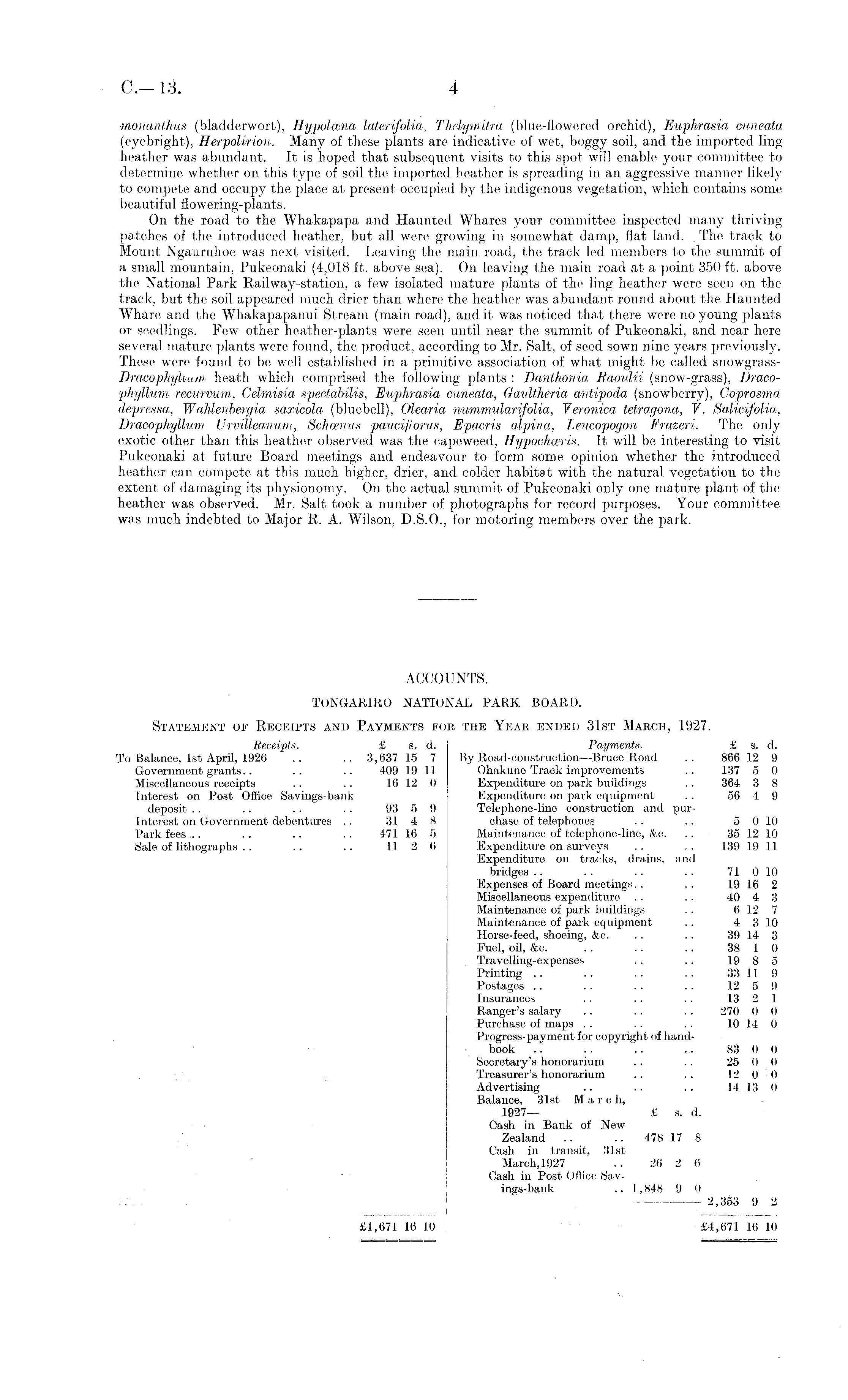 ACCOUNTS. TONGARIRO NATIONAL PARK BOARD. Statement of Receipts and Payments for. the Year ended 31st March, 1927. Receipts. £ s. d. Payments. £ 8. d. To Balance, Ist April, 1926 .. .. 3,637 15 7 By Road-construction —Bruce Road .. 866 12 9 Government grants.. .. .. 409 19 11 Ohakune Track improvements .. 137 5 0 Miscellaneous receipts .. .. 16 12 0 Expenditure on park buildings . . 364 3 8 Interest on Post Office Savings-bank Expenditure on park equipment .. 56 4 9 deposit .. .. .. .. 93 5 9 Telephone-line construction and purInterest on Government debentures .. 31 4 8 chase of telephones .. .. 5 0 10 Park fees.. . .. .. .. 471 16 5 Maintenance of telephone-line, &c. .. 35 12 10 Sale of lithographs .. .. .. 11 2 6 Expenditure on surveys .. .. 139 19 11 Expenditure on tracks, drains, and bridges .. . . .. .. 71 010 Expenses of Board meetings.. .. 19 16 2 Miscellaneous expenditure .. . . 40 4 3 Maintenance of park buildings . . 6 12 7 Maintenance of park equipment .. 4 3 10 Horse-feed, shoeing, &c. .. .. 39 14 3 Fuel, oil, &c. .. .. .. 38 1 0 Travelling-expenses . . .. 19 8 5 Printing .. .. .. .. 33 11 9 Postages .. .. . . . . 12 5 9 Insurances .. .. . . 13 2 1 Ranger's salary .. .. .. 270 0 0 Purchase of maps .. . . . . 10 14 0 Progress-payment for copyright of handbook .. .. .. .. 83 0 0 Secretary's honorarium .. .. 25 0 0 Treasurer's honorarium .. .. 12 0 0 Advertising .. .. .. 14 13 0 Balance, 31st March, 1927— £ s. d. Cash in Bank of New Zealand .. .. 478 17 8 Cash in transit, 31st March, 1927 .. 26 2 6 Cash in Post Office Sav-ings-bank .. 1,848 9 0 — 2,353 9 2 £4,671 16 10 £4,671 16 10
