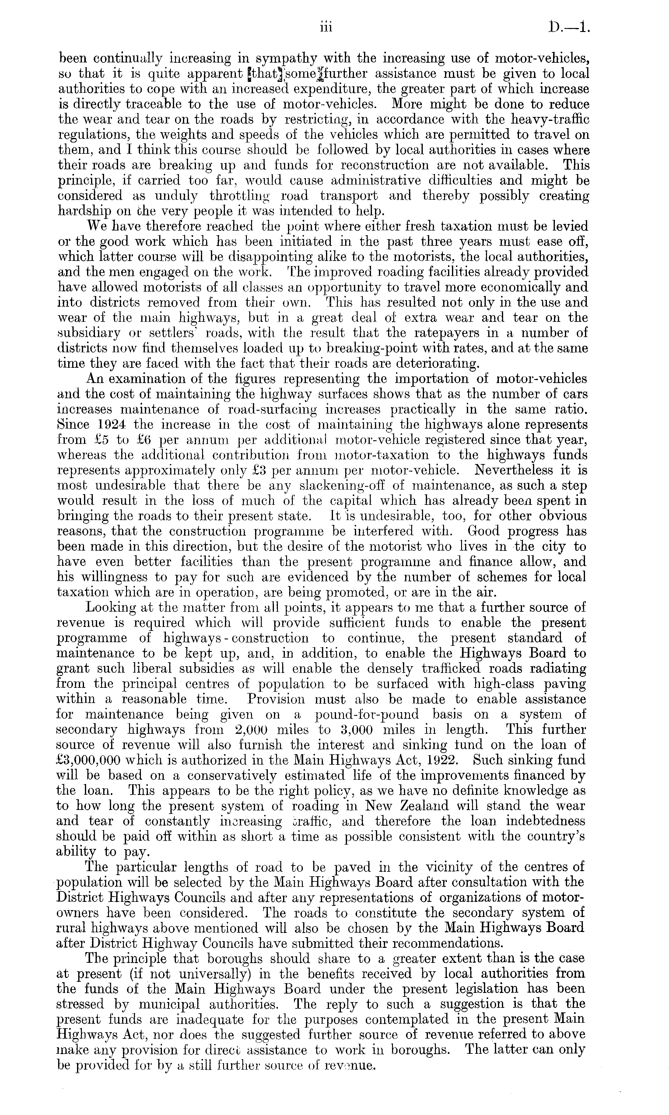 been continually increasing in sympathy with the increasing use of motor-vehicles, so that it is quite apparent |that] someffurther assistance must be given to local authorities to cope with an increased expenditure, the greater part of which increase is directly traceable to the use of motor-vehicles. More might be done to reduce the wear and tear 011 the roads by restricting, in accordance with the heavy-traffic regulations, the weights and speeds of the vehicles which are permitted to travel on them, and I think this course should be followed by local authorities in cases where their roads are breaking up and funds for reconstruction are not available. This principle, if carried too far, would cause administrative difficulties and might be considered as unduly throttling road transport and thereby possibly creating hardship 011 the very people it was intended to help. We have therefore reached the point where either fresh taxation must be levied or the good work which has been initiated in the past three years must ease off, which latter course will be disappointing alike to the motorists, the local authorities, and the men engaged on the work. The improved roading facilities already provided have allowed motorists of all classes an opportunity to travel more economically and into districts removed from their own. This has resulted not only in the use and wear of the main highways, but in a great deal of extra wear and tear 011 the subsidiary or settlers' roads, with the result that the ratepayers in a number of districts now find themselves loaded up to breaking-point with rates, and at the same time they are faced with the fact that their roads are deteriorating. An examination of the figures representing the importation of motor-vehicles and the cost of maintaining the highway surfaces shows that as the number of cars increases maintenance of road-surfacing increases practically in the same ratio. Since 1924 the increase in the cost of maintaining the highways alone represents from £5 to £(5 per annum per additional motor-vehicle registered since that year, whereas the additional contribution from motor-taxation to the highways funds represents approximately only £3 per annum per motor-vehicle. Nevertheless it is most undesirable that there be any slackening-off of maintenance, as such a step would result in the loss of much of the capital which has already been spent in bringing the roads to their present state. It is undesirable, too, for other obvious reasons, that the construction programme be interfered with. Good progress has been made in this direction, but the desire of the motorist who lives in the city to have even better facilities than the present programme and finance allow, and his willingness to pay for such are evidenced by the number of schemes for local taxation which are in operation, are being promoted, or are in the air. Looking at the matter from all points, it appears to me that a further source of revenue is required which will provide sufficient funds to enable the present programme of highways - construction to continue, the present standard of maintenance to be kept up, and, in addition, to enable the Highways Board to grant such liberal subsidies as will enable the densely trafficked roads radiating from the principal centres of population to be surfaced with high-class paving within a reasonable time. Provision must also be made to enable assistance for maintenance being given 011 a pound-for-pound basis on a system of secondary highways from 2,000 miles to 3,000 miles in length. This further source of revenue will also furnish the interest and sinking fund 011 the loan of £3,000,000 which is authorized in the Main Highways Act, 1922. Such sinking fund will be based on a conservatively estimated life of the improvements financed by the loan. This appears to be the right policy, as we have 110 definite knowledge as to how long the present system of roading in New Zealand will stand the wear and tear of constantly increasing traffic, and therefore the loan indebtedness should be paid off within as short a time as possible consistent with the country's ability to pay. The particular lengths of road to be paved in the vicinity of the centres of population will be selected by the Main Highways Board after consultation with the District Highways Councils and after any representations of organizations of motorowners have been considered. The roads to constitute the secondary system of rural highways above mentioned will also be chosen by the Main Highways Board after District Highway Councils have submitted their recommendations. The principle that boroughs should share to a greater extent than is the case at present (if not universally) in the benefits received by local authorities from the funds of the Main Highways Board under the present legislation has been stressed by municipal authorities. The reply to such a suggestion is that the present funds are inadequate for the purposes contemplated in the present Main Highways Act, nor does the suggested further source of revenue referred to above make any provision for direct assistance to work in boroughs. The latter can only be provided for by a still further source of revenue.