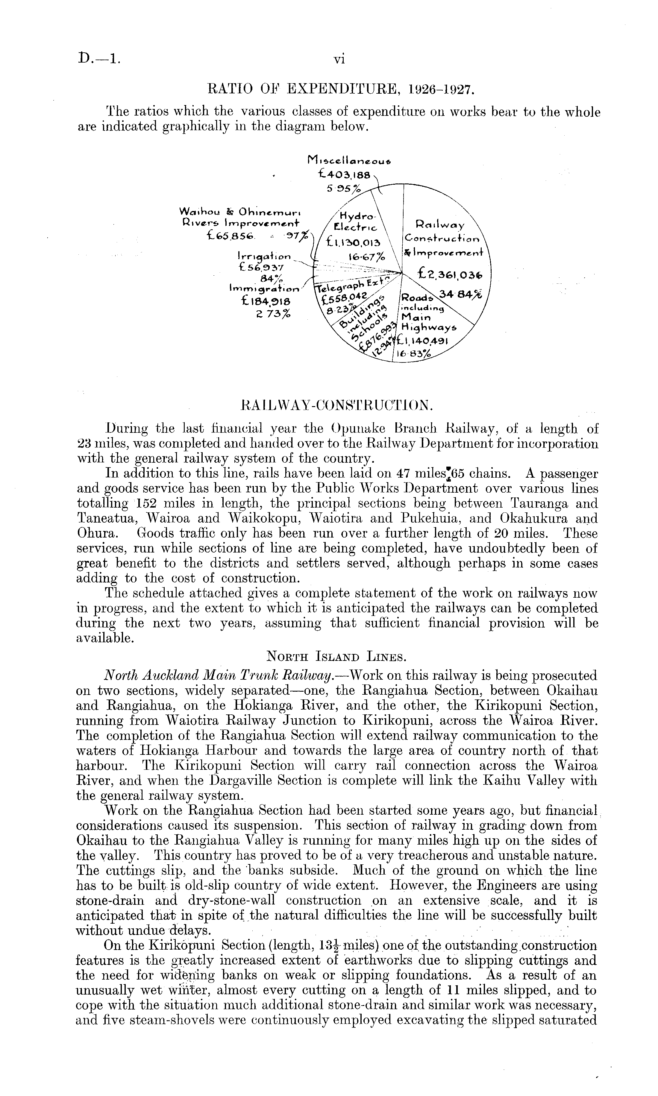 RAIL WAY-CONSTRUCTION. During the last financial year the Opunake Branch Railway, of a length of 23 miles, was completed and handed over to the Railway Department for incorporation with the general railway system of the country. In addition to this line, rails have been laid on 47 miles*6s chains. A passenger and goods service has been run by the Public Works Department over various lines totalling 152 miles in length, the principal sections being between Tauranga and Taneatua, Wairoa and Waikokopu, Waiotira and Pukehuia, and Okahukura and Ohura. Goods traffic only has been run over a further length of 20 miles. These services, run while sections of line are being completed, have undoubtedly been of great benefit to the districts and settlers served, although perhaps in some cases adding to the cost of construction. The schedule attached gives a complete statement of the work on railways now in progress, and the extent to which it is anticipated the railways can be completed during the next two years, assuming that sufficient financial provision will be available. North Island Lines. North Auckland Main Trunk Railway.—Work on this railway is being prosecuted on two sections, widely separated —one, the Rangiahua Section, between Okaihau and Rangiahua, on the Hokianga River, and the other, the Kirikopuni Section, running from Waiotira Railway Junction to Kirikopuni, across the Wairoa River. The completion of the Rangiahua Section will extend railway communication to the waters of Hokianga Harbour and towards the large area of country north of that harbour. The Kirikopuni Section will carry rail connection across the Wairoa River, and when the Dargaville Section is complete will link the Kaihu Valley with the general railway system. Work on the Rangiahua Section had been started some years ago, but financial considerations caused its suspension. This section of railway in grading down from Okaihau to the Rangiahua Valley is running for many miles high up on the sides of the valley. This country has proved to be of a very treacherous and unstable nature. The cuttings slip, and the banks subside. Much of the ground on which the line has to be built is old-slip country of wide extent. However, the Engineers are using stone-drain and dry-stone-wall construction on an extensive scale, and it is anticipated that in spite of the natural difficulties the line will be successfully built without undue delays. On the Kirikopuni Section (length, 18J miles) one of the outstanding construction features is the greatly increased extent of earthworks due to slipping cuttings and the need for widening banks on weak or slipping foundations. As a result of an unusually wet winter, almost every cutting on a length of 11 miles slipped, and to cope with the situation much additional stone-drain and similar work was necessary, and five steam-shovels were continuously employed excavating the slipped saturated