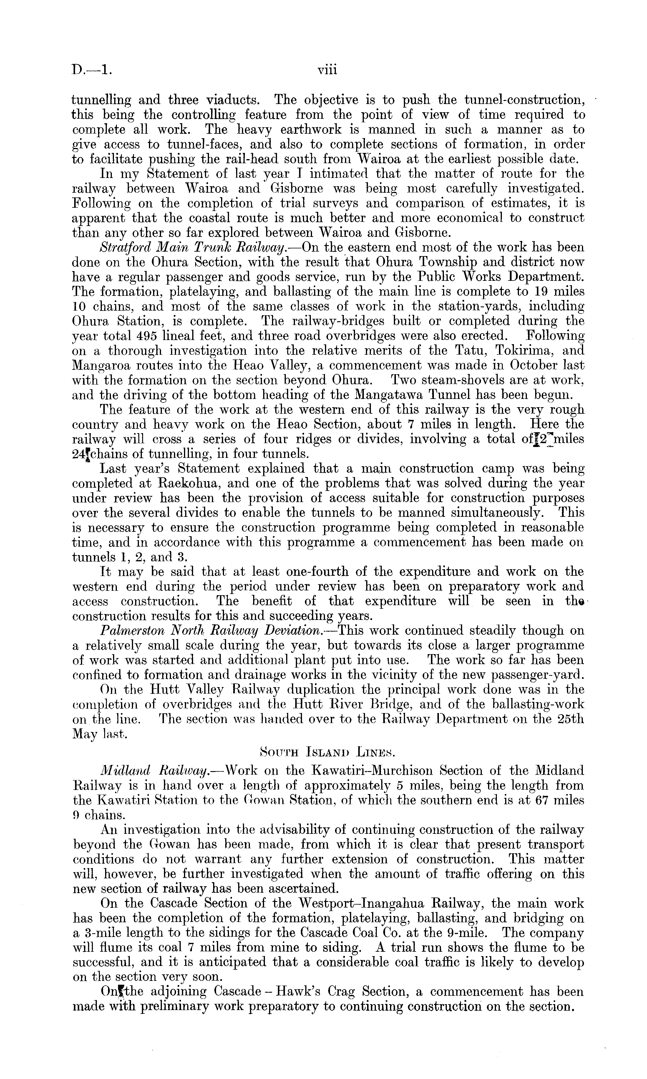 tunnelling and three viaducts. The objective is to push the tunnel-construction, this being the controlling feature from the point of view of time required to complete all work. The heavy earthwork is manned in such a manner as to give access to tunnel-faces, and also to complete sections of formation, in order to facilitate pushing the rail-head south from Wairoa at the earliest possible date. In my Statement of last year I intimated that the matter of route for the railway between Wairoa and Gisborne was being most carefully investigated. Following on the completion of trial surveys and comparison of estimates, it is apparent that the coastal route is much better and more economical to construct than any other so far explored between Wairoa and Gisborne. Stratford Main Trunk Railway. —On the eastern end most of the work has been done on the Ohura Section, with the result that Ohura Township and district now have a regular passenger and goods service, run by the Public Works Department. The formation, platelaying, and ballasting of the main line is complete to 19 miles 10 chains, and most of the same classes of work in the station-yards, including Ohura Station, is complete. The railway-bridges built or completed during the year total 495 lineal feet, and three road overbridges were also erected. Following on a thorough investigation into the relative merits of the Tatu, Tokirima, and Mangaroa routes into the Heao Valley, a commencement was made in October last with the formation on the section beyond Ohura. Two steam-shovels are at work, and the driving of the bottom heading of the Mangatawa Tunnel has been begun. The feature of the work at the western end of this railway is the very rough country and heavy work on the Heao Section, about 7 miles in length. Here the railway will cross a series of four ridges or divides, involving a total of|2 jniles 24|chains of tunnelling, in four tunnels. Last year's Statement explained that a main construction camp was being completed at Raekohua, and one of the problems that was solved during the year under review has been the provision of access suitable for construction purposes over the several divides to enable the tunnels to be manned simultaneously. This is necessary to ensure the construction programme being completed in reasonable time, and in accordance with this programme a commencement has been made on tunnels 1, 2, and 3. It may be said that at least one-fourth of the expenditure and work on the western end during the period under review has been on preparatory work and access construction. The benefit of that expenditure will be seen in the construction results for this and succeeding years. Palmerston North Railway Deviation.—This work continued steadily though on a relatively small scale during the year, but towards its close a larger programme of work was started and additional plant put into use. The work so far has been confined to formation and drainage works in the vicinity of the new passenger-yard. On the Hutt Valley Railway duplication the principal work done was in the completion of overbridges and the Hutt River Bridge, and of the ballasting-work on the line. The section was handed over to the Railway Department on the 25th May last. South Island Links. Midland Railway.—Work on the Kawatiri-Murchison Section of the Midland Railway is in hand over a length of approximately 5 miles, being the length from the Kawatiri Station to the Gowan Station, of which the southern end is at 67 miles 9 chains. An investigation into the advisability of continuing construction of the railway beyond the Gowan has been made, from which it is clear that present transport conditions do not warrant any further extension of construction. This matter will, however, be further investigated when the amount of traffic offering on this new section of railway has been ascertained. On the Cascade Section of the Westport-Inangahua Railway, the main work has been the completion of the formation, platelaying, ballasting, and bridging on a 3-mile length to the sidings for the Cascade Coal Co. at the 9-mile. The company will flume its coal 7 miles from mine to siding. A trial run shows the flume to be successful, and it is anticipated that a considerable coal traffic is likely to develop on the section very soon. Onfthe adjoining Cascade - Hawk's Crag Section, a commencement has been made with preliminary work preparatory to continuing construction on the section.