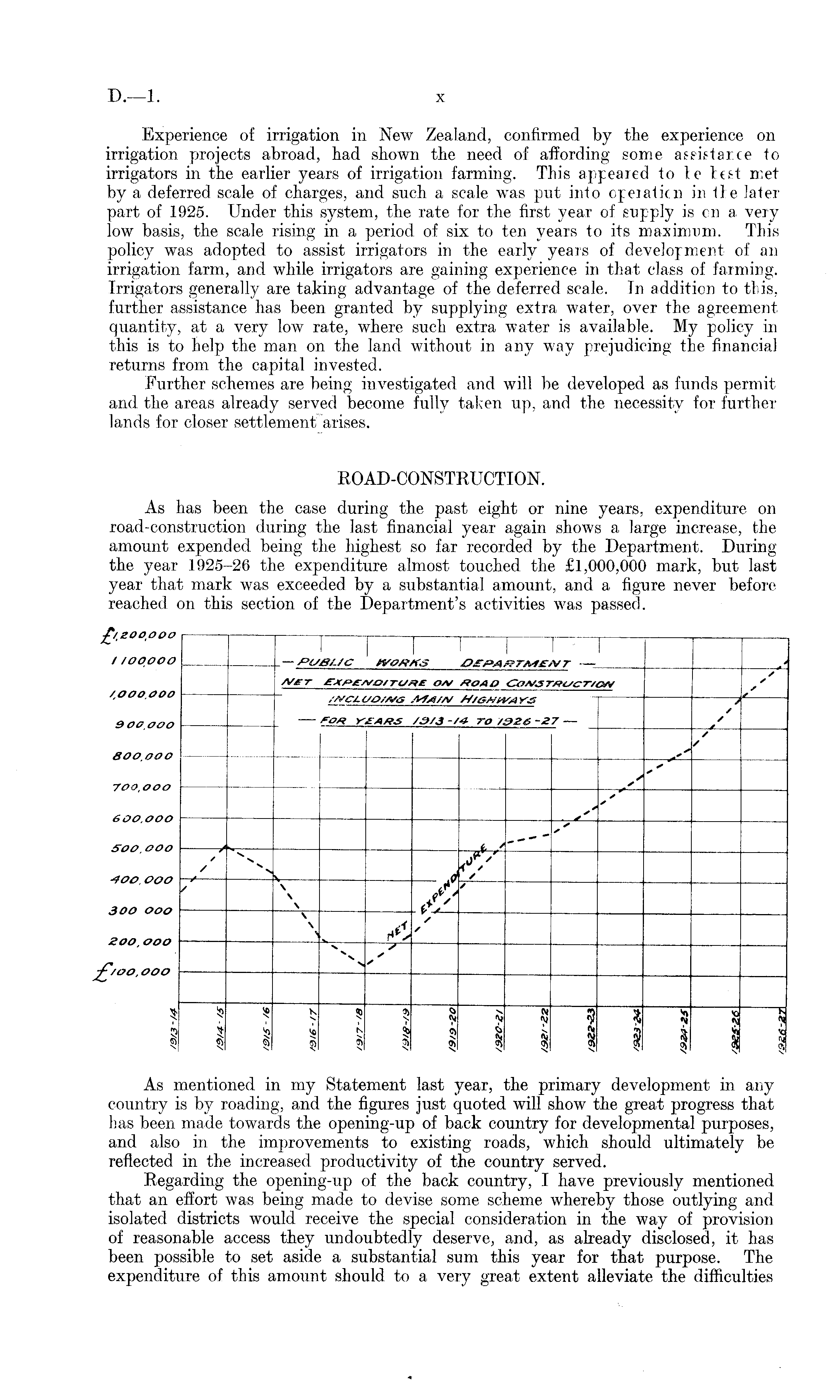 Experience of irrigation in New Zealand, confirmed by the experience on irrigation projects abroad, had shown the need of affording some ai-sistarce to irrigators in the earlier years of irrigation farming. This appealed to le te&t met by a deferred scale of charges, and such a scale was put into operation in tie later part of 1925. Under this system, the rate for the first year of supply is cn a very low basis, the scale rising in a period of six to ten years to its maximum. This policy was adopted to assist irrigators in the early years of development of an irrigation farm, and while irrigators are gaining experience in that class of farming. Irrigators generally are taking advantage of the deferred scale. Tn addition to this, further assistance has been granted by supplying extra water, over the agreement quantity, at a very low rate, where such extra water is available. My policy in this is to help the man on the land without in any way prejudicing the financial returns from the capital invested. Further schemes are being investigated and will be developed as funds permit and the areas already served become fully taken up, and the necessity for further lands for closer settlement arises. ROAD-CONSTRUCTION. As has been the case during the past eight or nine years, expenditure on road-construction during the last financial year again shows a large increase, the amount expended being the highest so far recorded by the Department. During the year 1925-26 the expenditure almost touched the £1,000,000 mark, but last year that mark was exceeded by a substantial amount, and a figure never before reached on this section of the Department's activities was passed.