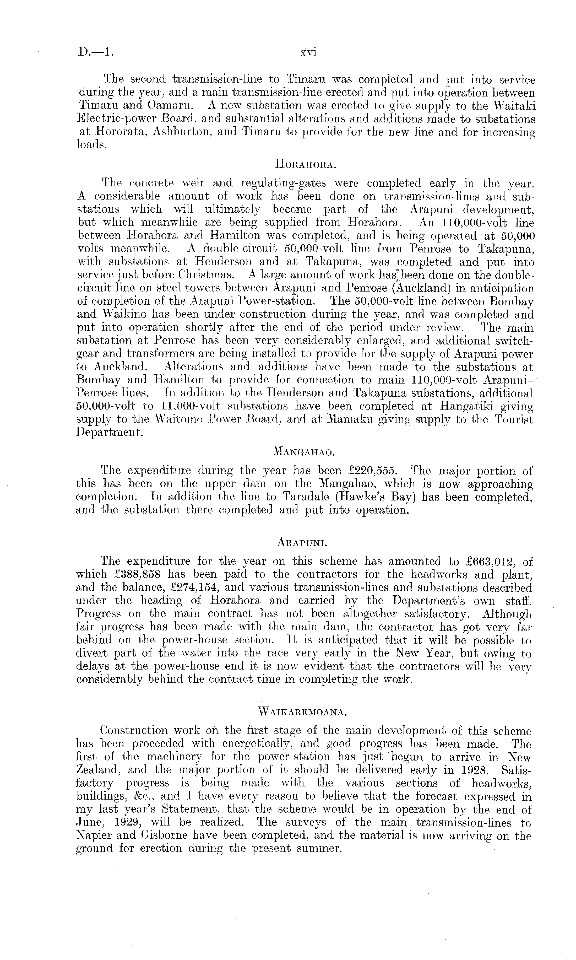 The second transmission-line to Timaru was completed and put into service during the year, and a main transmission-line erected and put into operation between Timaru and Oamaru. A new substation was erected to give supply to the Waitaki Electric-power Board, and substantial alterations and additions made to substations at Hororata, Ashburton, and Timaru to provide for the new line and for increasing loads. Horahora. The concrete weir and regulating-gates were completed early in the year. A considerable amount of work has been done on transmission-lines and substations which will ultimately become part of the Arapuni development, but which meanwhile are being supplied from Horahora. An 110,000-volt line between Horahora and Hamilton was completed, and is being operated at 50,000 volts meanwhile. A double-circuit 50,000-volt line from Penrose to Takapuna, with substations at Henderson and at Takapuna, was completed and put into service just before Christmas. A large amount of work has-been done on the doublecircuit line on steel towers between Arapuni and Penrose (Auckland) in anticipation of completion of the Arapuni Power-station. The 50,000-volt line between Bombay and Waikino has been under construction during the year, and was completed and put into operation shortly after the end of the period under review. The main substation at Penrose has been very considerably enlarged, and additional switchgear and transformers are being installed to provide for the supply of Arapuni power to Auckland. Alterations and additions have been made to the substations at Bombay and Hamilton to provide for connection to main 110,000-volt ArapuniPenrose lines, in addition to the Henderson and Takapuna substations, additional 50,000-volt to 11,000-volt substations have been completed at Hangatiki giving supply to the Waitomo Power Board, and at Mamaku giving supply to the Tourist Department. Mangahao. The expenditure during the year has been £220,555. The major portion of this has been on the upper dam on the Mangahao, which is now approaching completion. In addition the line to Taraclale (Hawke's Bay) has been completed, and the substation there completed and. put into operation. Arapuni. The expenditure for the year on this scheme has amounted to £663,012, of which £388,858 has been paid to the contractors for the headworks and plant, and the balance, £274,154, and various transmission-lines and substations described under the heading of Horahora and carried by the Department's own staff. Progress on the main contract has not been altogether satisfactory. Although fair progress has been made with the main dam, the contractor has got very far behind on the power-house section. It is anticipated that it will be possible to divert part of the water into the race very early in the New Year, but owing to delays at the power-house end it is now evident that the contractors will be very considerably behind the contract time in completing the work. Waikaremoana. Construction work on the first stage of the main development of this scheme has been proceeded with energetically, and good progress has been made. The first of the machinery for the power-station has just begun to arrive in New Zealand, and the major portion of it should be delivered early in 1928. Satisfactory progress is being made with the various sections of headworks, buildings, &c., and I have every reason to believe that the forecast expressed in my last year's Statement, that the scheme would be in operation by the end of June, 1929, will be realized. The surveys of the main transmission-lines to Napier and Grisborne have been completed, and the material is now arriving on the ground for erection during the present summer.