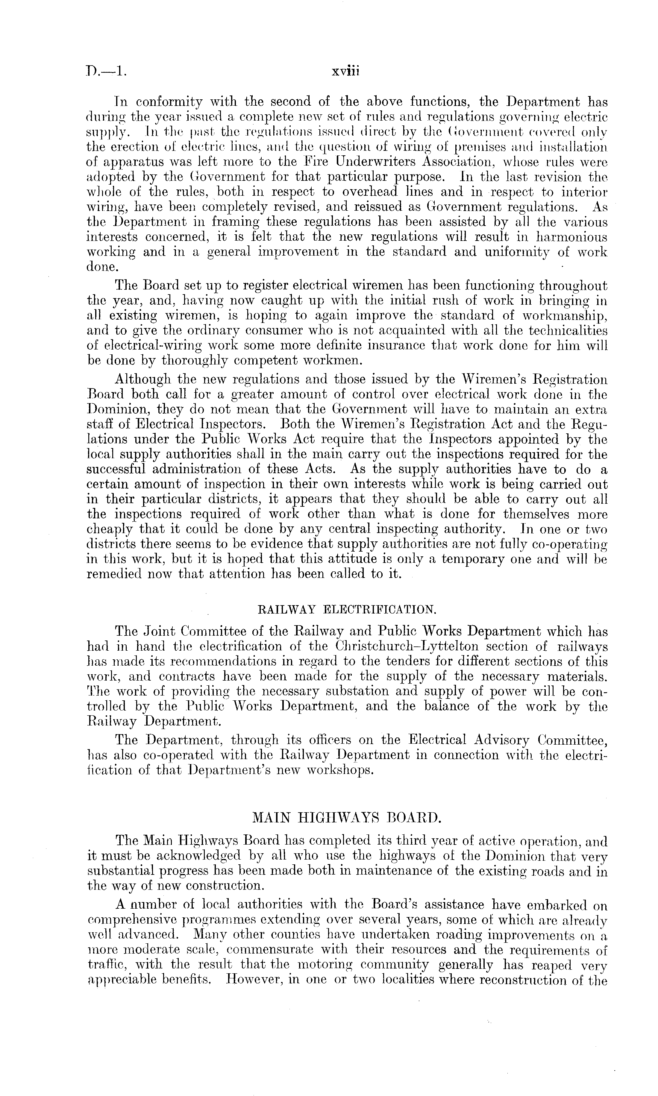 In conformity with the second of the above functions, the Department has during the year issued a complete new set of rules and regulations governing electric supply, in the past the regulations issued direct by the Government covered only the erection of electric lines, and the question of wiring of premises and installation of apparatus was left more to the Fire Underwriters Association, whose rules were adopted by the Government for that particular purpose. In the last revision the whole of the rules, both in respect to overhead lines and in respect to interior wiring, have been completely revised, and reissued as Government regulations. As the Department in framing these regulations has been assisted by all the various interests concerned, it is felt that the new regulations will result in harmonious working and in a general improvement in the standard and uniformity of work done. The Board set up to register electrical wiremen has been functioning throughout the year, and, having now caught up with the initial rush of work in bringing in all existing wiremen, is hoping to again improve the standard of workmanship, and to give the ordinary consumer who is not acquainted with all the technicalities of electrical-wiring work some more definite insurance that work done for him will be done by thoroughly competent workmen. Although the new regulations and those issued by the Wiremen's Registration Board both call for a greater amount of control over electrical work done in the Dominion, they do not mean that the Government will have to maintain an extra staff of Electrical Inspectors. Both the Wiremen's Registration Act and the Regulations under the Public Works Act require that the Inspectors appointed by the local supply authorities shall in the main carry out the inspections required for the successful administration of these Acts. As the supply authorities have to do a certain amount of inspection in their own interests while work is being carried out in their particular districts, it appears that they should be able to carry out all the inspections required of work other than what is done for themselves more cheaply that it could be done by any central inspecting authority. In one or two districts there seems to be evidence that supply authorities are not fully co-operating in this work, but it is hoped that this attitude is only a temporary one and will be remedied now that attention has been called to it. RAILWAY ELECTRIFICATION. The Joint Committee of the Railway and Public Works Department which has had in hand the electrification of the Christchurch-Lyttelton section of railways has made its recommendations in regard to the tenders for different sections of this work, and contracts have been made for the supply of the necessary materials. The work of providing the necessary substation and supply of power will be controlled by the Public Works Department, and the balance of the work by the Railway Department. The Department, through its officers on the Electrical Advisory Committee, has also co-operated with the Railway Department in connection with the electrification of that Department's new workshops. MAIN HIGHWAYS BOARD. The Main Highways Board has completed its third year of active operation, and it must be acknowledged by all who use the highways of the Dominion that very substantial progress lias been made both in maintenance of the existing roads and in the way of new construction. A number of local authorities with the Board's assistance have embarked on comprehensive programmes extending over several years, some of which are already well advanced. Many other counties have undertaken roading improvements on a more moderate scale, commensurate with their resources and the requirements of traffic, with the result that the motoring community generally has reaped very appreciable benefits, However, in one or two localities where reconstruction of the