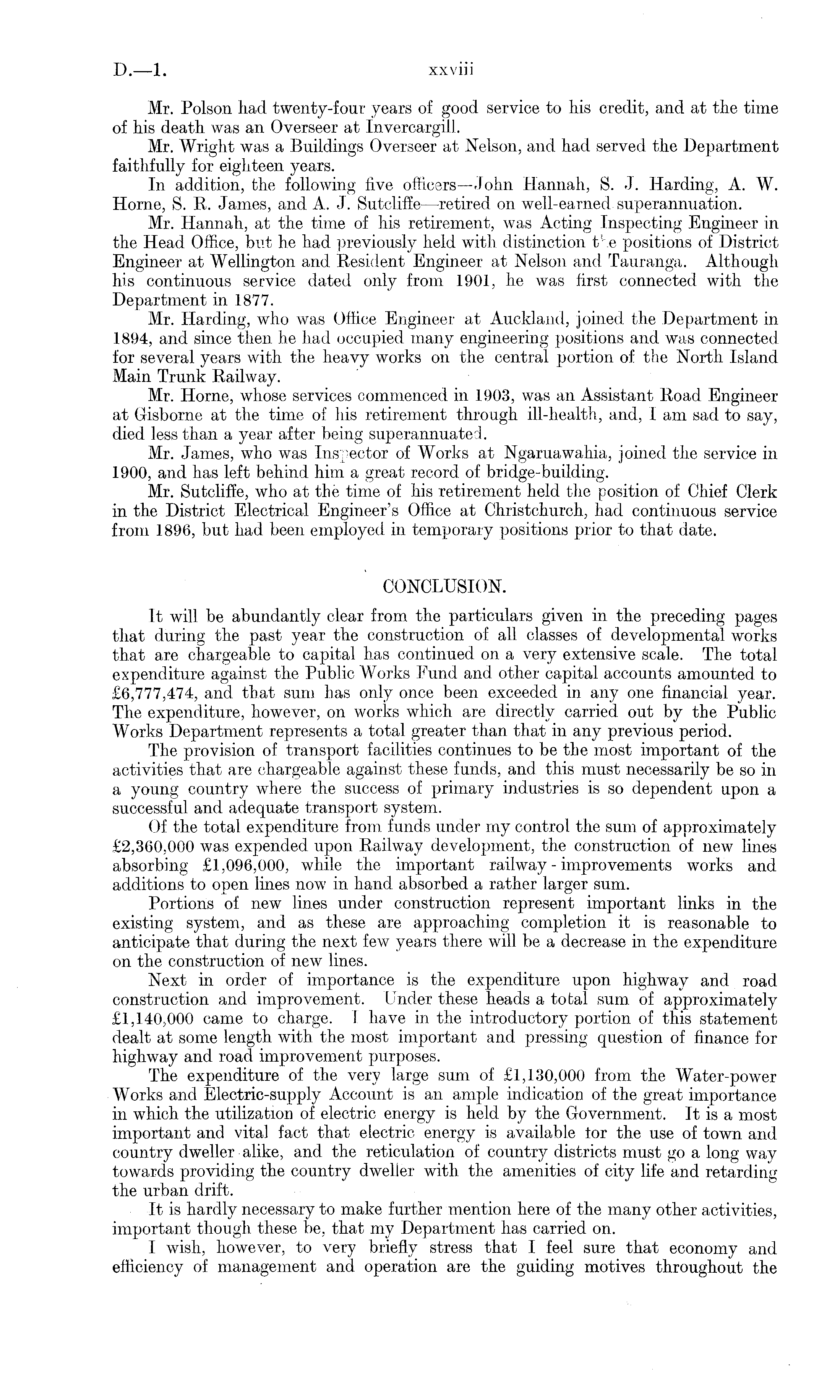 Mr. Poison had twenty-four years of good service to his credit, and at the time of his death was an Overseer at Invercargill. Mr. Wright was a Buildings Overseer at Nelson, and had served the Department faithfully for eighteen years. In addition, the following five officers—John Hannah, S. J. Harding, A. W. Home, S. 11. James, and A. J. Sutclifle—retired on well-earned superannuation. Mr. Hannah, at the time of his retirement, was Acting Inspecting Engineer in the Head Office, but he had previously held with distinction t'.e positions of District Engineer at Wellington and Resident Engineer at Nelson and Tauranga. Although his continuous service dated only from 1901, he was first connected with the Department in 1877. Mr. Harding, who was Office Engineer at Auckland, joined the Department in 1894, and since then he had occupied many engineering positions and was connected for several years with the heavy works on the central portion of the North Island Main Trunk Railway. Mr. Home, whose services commenced in 1903, was an Assistant Road Engineer at Gisborne at the time of his retirement through ill-health, and, I am sad to say, died less than a year after being superannuated. Mr. James, who was Inspector of Works at Ngaruawahia, joined the service in 1900, and has left behind him a great record of bridge-building. Mr. Sutcliffe, who at the time of his retirement held the position of Chief Clerk in the District Electrical Engineer's Office at Christchurch, had continuous service from 1896, but had been employed in temporary positions prior to that date. CONCLUSION. It will be abundantly clear from the particulars given in the preceding pages that during the past year the construction of all classes of developmental works that are chargeable to capital has continued on a very extensive scale. The total expenditure against the Public Works Fund and other capital accounts amounted to £6,777,474, and that sum has only once been exceeded in any one financial year. The expenditure, however, on works which are directly carried out by the Public Works Department represents a total greater than that in any previous period. The provision of transport facilities continues to be the most important of the activities that are chargeable against these funds, and this must necessarily be so in a young country where the success of primary industries is so dependent upon a successful and adequate transport system. Of the total expenditure from funds under my control the sum of approximately £2,360,000 was expended upon Railway development, the construction of new lines absorbing £1,096,000, while the important railway - improvements works and additions to open lines now in hand absorbed a rather larger sum. Portions of new lines under construction represent important links in the existing system, and as these are approaching completion it is reasonable to anticipate that during the next few years there will be a decrease in the expenditure on the construction of new lines. Next in order of importance is the expenditure upon highway and road construction and improvement. Under these heads a tobal sum of approximately £1,140,000 came to charge. I have in the introductory portion of this statement dealt at some length with the most important and pressing question of finance for highway and road improvement purposes. The expenditure of the very large sum of £1,130,000 from the Water-power Works and Electric-supply Account is an ample indication of the great importance in which the utilization of electric energy is held by the Government. It is a most important and vital fact that electric energy is available tor the use of town and country dweller alike, and the reticulation of country districts must go a long way towards providing the country dweller with the amenities of city life and retarding the urban drift. It is hardly necessary to make further mention here of the many other activities, important though these he, that my Department has carried on. I wish, however, to very briefly stress that I feel sure that economy and efficiency of management and operation are the guiding motives throughout the