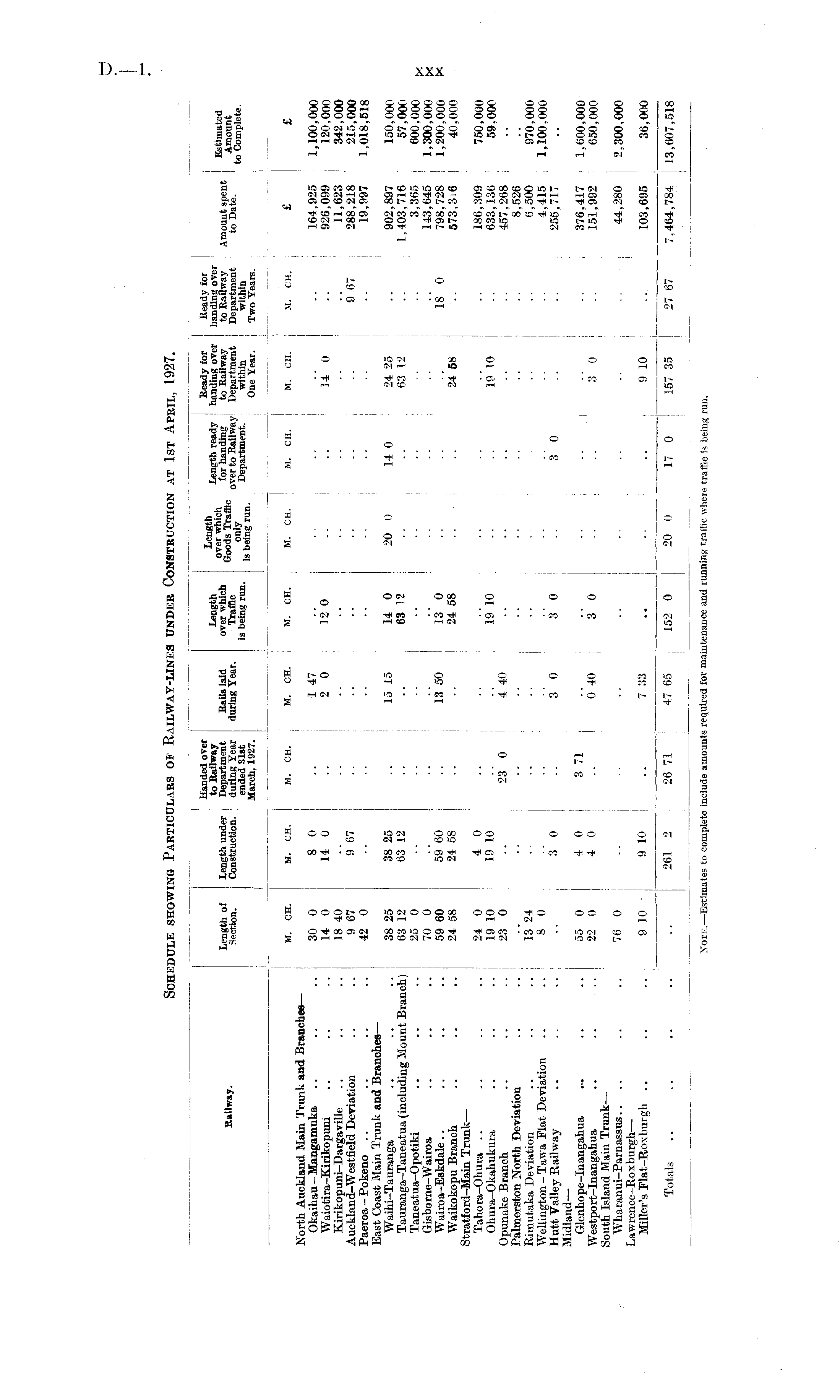 Handed over Lpntrth Ready for Heady for to Railway .Length . .Length ready handing over handing over j P „ Hl T,atert „ __ Length of length under i Department Bails laid over which T „i„ tor handing to Railway to Railway Amount spent i * L,,, wiiy. Section. Construction. during Year during Year. Traffic 0 . amc over to Railway Department Department to Date. ended 31st is being run. . . Department. within within I complete. March, 1927. 18 Demg run ' One Year. Two Years. M. CH. M. CH. M. OH. M. CH. M. CH. ! M. CH. M. OH. I M. OH. M. CH. £ £ North Auckland Main Trunk and Branches — Okaihau - Mangamuka .. .. .. 30 0 8 0 .. 1 47 .. .. .. ! .. .. 164,925 1,100,000 Waiotira-Kirikopuni .. .. .. 14 0 14 0 .. 2 0 12 0 .. .. ]4 0 .. 926,099 120,000 Kirikopuni— Dargaville .. .. .. 18 40 . - •. .. • • • • • ■ • . .. 11,623 342, 000 Auckland-Westfield Deviation .. .. 9 67 9 67 .. .. .. .. .. .. 9 67 288,218 215,000 Paeroa - Pokeno .. .. .. .. 42 0 .. .. .. .. .. .. 19,997 1,018,518 East Coast Main Trunk and Branches — Waihi-Tauranga .. .. .. 38 25 38 25 .. 15 15 14 0 20 0 14 0 24 25 .. 902,897 150,000 Tauranga-Taneatua (including Mount Branch) 63 12 63 12 .. .. 63 12 .. .. 63 12 .. 1,403,716 57,000 Taneatua-Opotiki .. .. .. 25 0 .. .. .. .. .. .. 1 .. 3,365 600,000 Gisborne-Wairoa .. .. .. 70 0 .. .. .. .. .. .. .. .. 143,645 1,300,000 Wairoa-Eskdale.. .. .. .. 59 60 59 60 .. 13 50 13 0 .. .. .. 18 0 798,728 1,200,000 Waikokopu Branch .. .. .. 24 58 24 58 .. .. 24 58 .. .. 24 58 .. 573, 3 16 40,000 Stratford— Main Trunk — Tahora-Ohura .. .. .. .. 24 0 4 0 .. .. .. .. .. .. .. 186,309 750,000 Ohura-Okahukura .. .. .. 19 10 19 10 .. .. i 19 10 .. .. 19 10 .. 633,136 | 59,000 Opunake Branch .. .. .. 23 0 .. 23 0 4 40 .. .. .. ' j .. .. 457, 268 Palmerston North Deviation .. .. .. •• •• i •• .. .. .. 8,526 Rimutaka Deviation .. .. .. 13 24 .. .. .. j .. . i .. .. 6,500 970,000 Wellington - Tawa Flat Deviation .. .. 8 0 .. •• 1 .. -• .. .. 4,415 \ 1,100,000 Hutt Valley Railway .. .. .. .. 30 .. 30 30 .. 30 .. .. 255,717 Midland — Glenhope-lnangahua ... .. .. 55 0 4 0 3 71 , .. .. .. .. .. .. 376,417 1,600,000 Westport-Inangahua .. .. .. 22 0 4 0 .. ' 0 40 3 0 .. i .. 3 0 .. 151,992 650,000 South Island Main Trunk— Wharanui-Parnassus.. .. .. .. 76 0 •• -• : .. .. .- .. .. j .. 44,280 2,300,000 Lawrence-Roxburgh— Miller's Plat-Roxburgh .. .. .. 9 10 9 10 .. 7 33 .. .. .. j 9 10 ... 103,695 36,000 Totals .. .. .. .. .. 261 2 26 71 47 65 152 0 20 0 17 0 157 35 27 67 7,464,784 13,607,518 Note. —Estimates to complete include amounts required for maintenance and running traffic where traffic is being run.