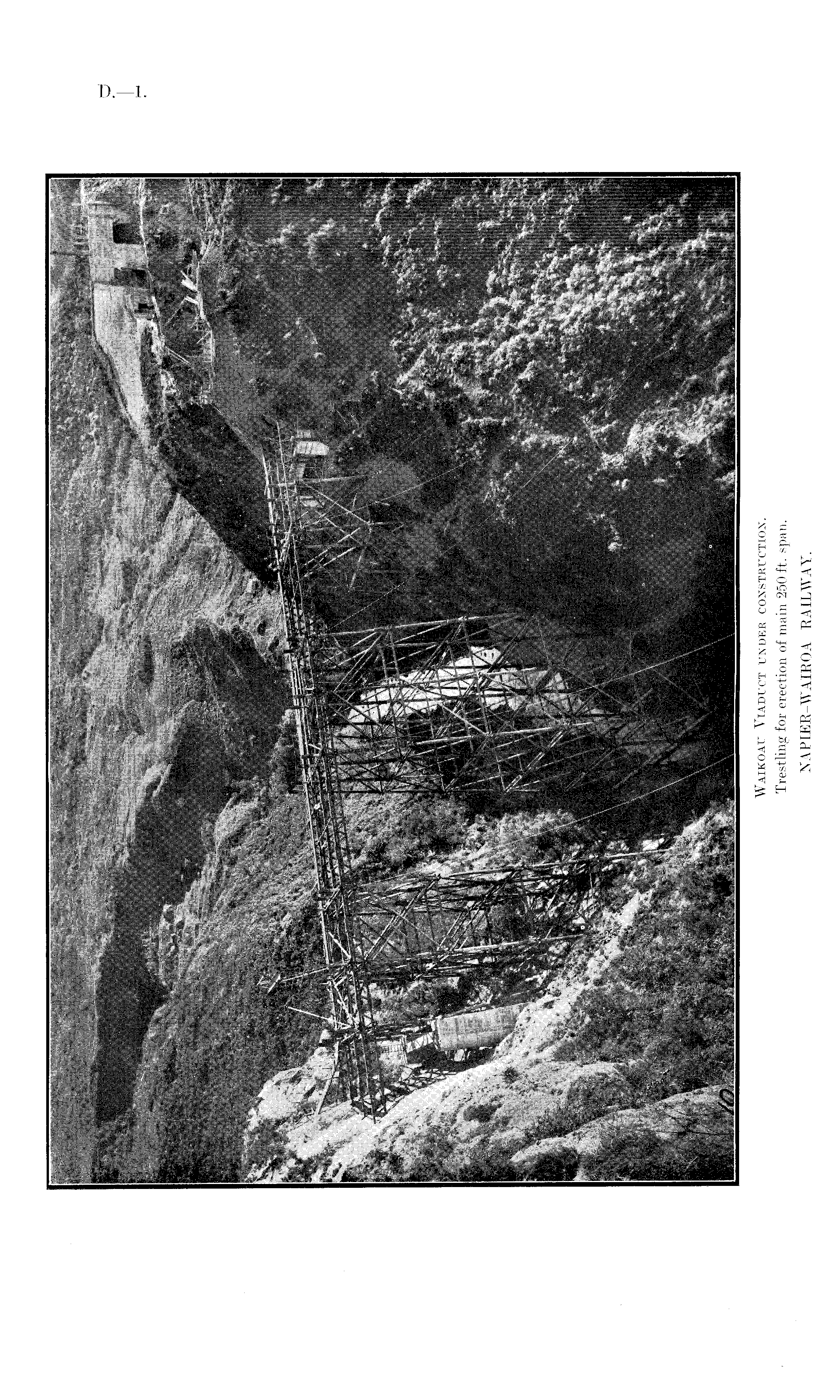 Waikoau Viaduct under construction. Trestling for erection of main 250ft. span. NAPIER-WATROA RAILWAY.