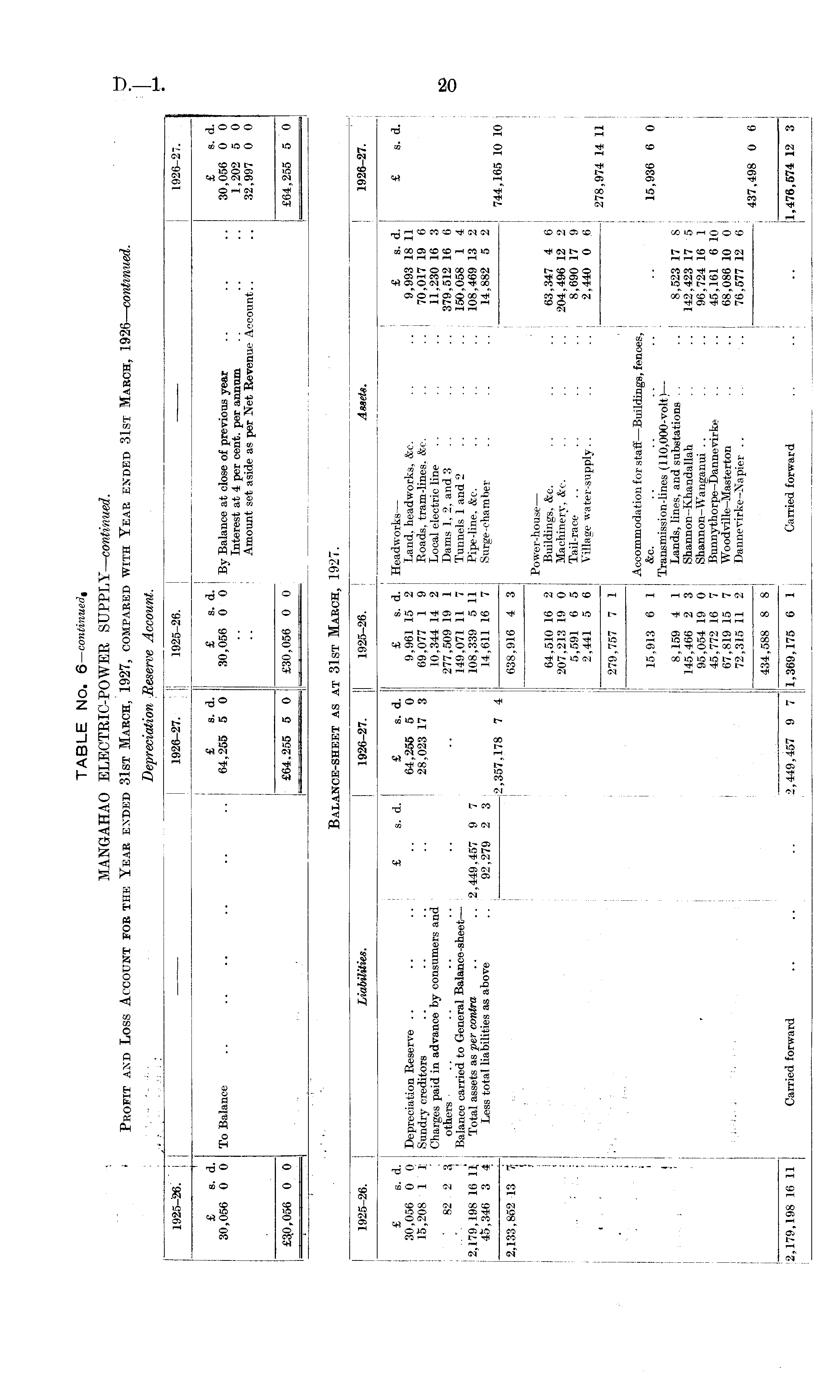 TABLE No. 6—continued. MANGAHAO ELECTRIC-POWER SUPPLY—continued. Profit and Loss Account for the Year ended 31st March, 1927, compared with Year ended 31st March, 1926—continued. Depreciation Reserve Account.