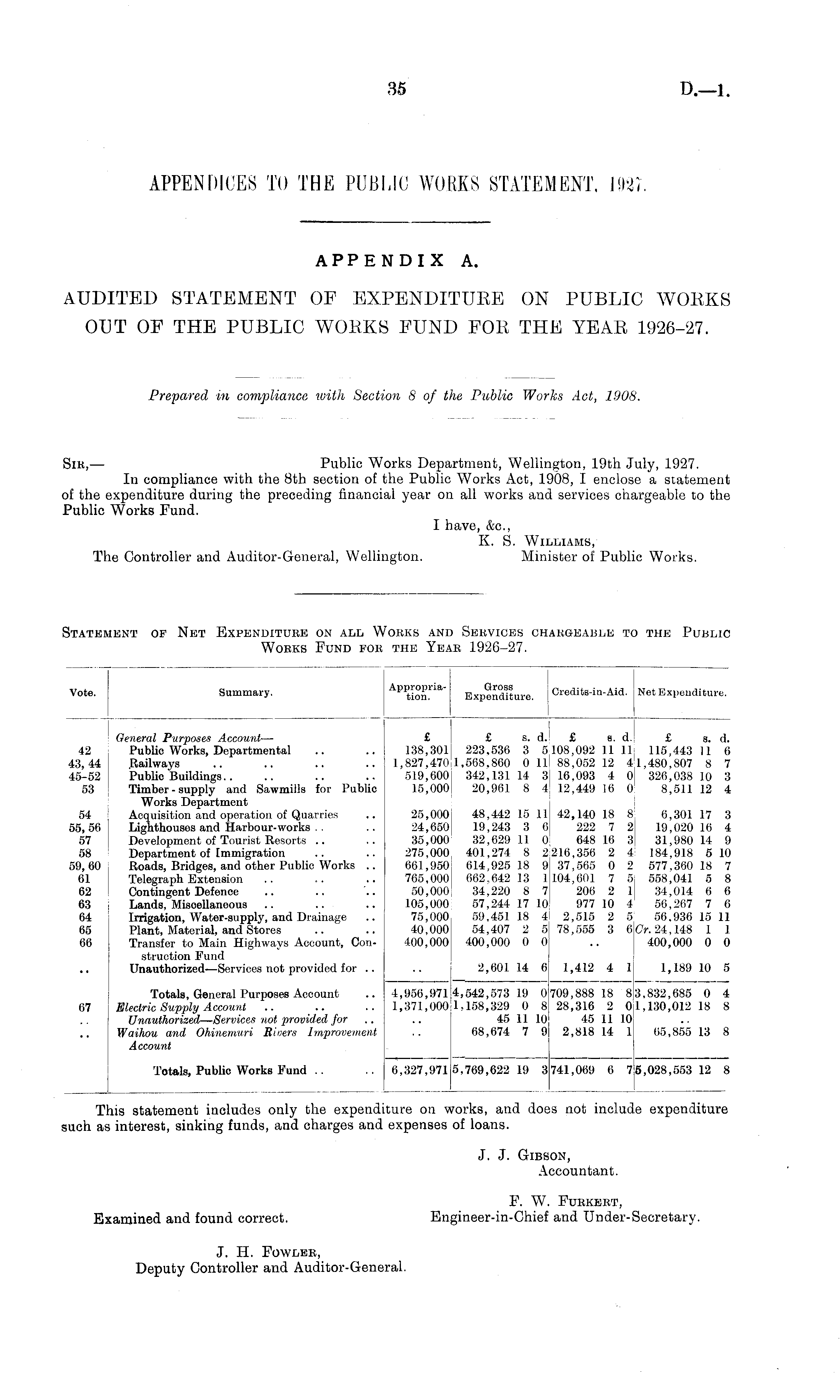 Sir, — Public Works Department, Wellington, 19th July, 1927. In compliance with the Bth section of the Public Works Act, 1908, I enclose a statement of the expenditure during the preceding financial year on all works and services chargeable to the Public Works Fund. I have, &c., K. S. Williams, The Controller and Auditor-General, Wellington. Minister of Public Works.