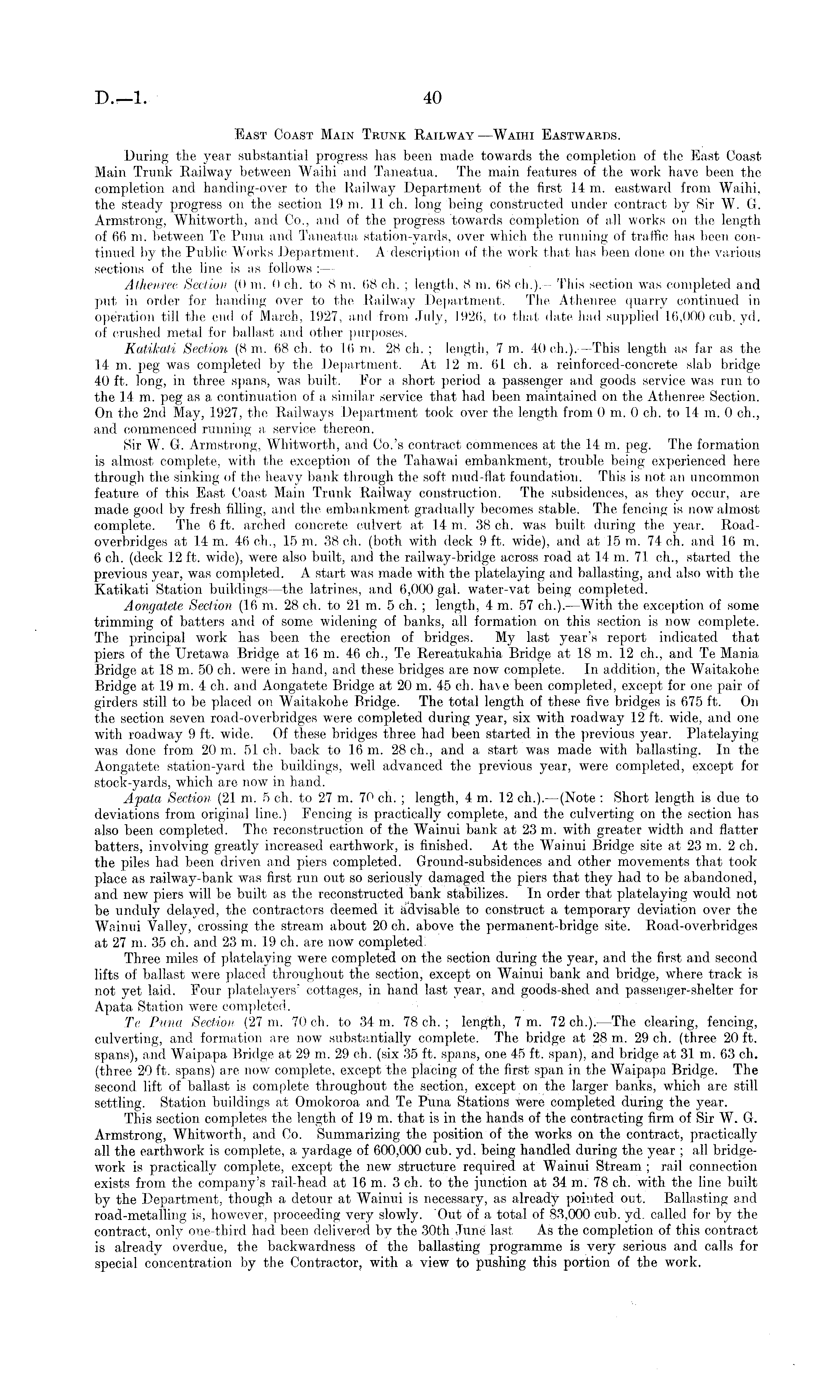 East Coast Main Trunk Railway—Waihi Eastwards. During the year substantial progress has been made towards the completion of the East Coast Main Trunk Railway between Waihi and Taneatua. The main features of the work have been the completion and handing-over to the Railway Department of the first 14 m. eastward from Waihi. the steady progress on the section 19 m. 11 ch. long being constructed under contract by Sir W. G. Armstrong, Whitworth, and Co., and of the progress towards completion of all works on the length of 66 m. between Te Puna and Taneatua station-yards, over which the running of traffic has been continued by the Public Works Department. A description of the work that has been done on the various sections of the line is as follows :— Athenree Section (0 m. 0 ch. to 8 m. 68 ch. ; length, 8 m. 68 ch.).— This section was completed and put in order for handing over to the Railway Department. The Athenree quarry continued in operation till the end of March, 1927, and from July, 1926, to that date had supplied 16,000 cub. yd. of crushed metal for ballast and other purposes. Katikati Section (8 m. 68 ch. to 16 m. 28 ch. ; length, 7m. 40 ch.). —This length as far as the 14 m. peg was completed by the Department. At 12 m. 61 ch. a reinforced-concrete slab bridge 40 ft. long, in three spans, was built. For a short period a passenger and goods service was run to the 14 m. peg as a continuation of a similar service that had been maintained on the Athenree Section. On the 2nd May, 1927, the Railways Department took over the length from 0 m. 0 ch. to 14 m. 0 ch., and commenced running a service thereon. Sir W. G. Armstrong, Whitworth, and Co.'s contract commences at the 14 m. peg. The formation is almost complete, with the exception of the Tahawai embankment, trouble being experienced here through the. sinking of the heavy bank through the soft mud-flat foundation. This is not an uncommon feature of this East Coast Main Trunk Railway construction. The subsidences, as they occur, are made good by fresh filling, and the embankment gradually becomes stable. The fencing is now almost complete. The 6 ft. arched concrete culvert at 14 m. 38 ch. was built during the year. Roadoverbridges at 14 m. 46 ch., 15 m. 38 ch. (both with deck 9 ft. wide), and at 15 m. 74 ch. and 16 m. 6 ch. (deck 12 ft. wide), were also built, and the railway-bridge across road at 14 m. 71 ch., started the previous year, was completed. A start was made with the platelaying and ballasting, and also with the Katikati Station buildings —the latrines, and 6,000 gal. water-vat being completed. Aongatete Section (16 m. 28 ch. to 21 m. 5 ch. ; length, 4 m. 57 ch.).— With the exception of some trimming of batters and of some widening of banks, all formation on this section is now complete. The principal work has been the erection of bridges. My last year's report indicated that piers of the Uretawa Bridge at 16 m. 46 ch., Te Rereatukahia Bridge at 18 m. 12 ch., and Te Mania Bridge at 18 m. 50 ch. were in hand, and these bridges are now complete. In addition, the Waitakohe Bridge at 19 m. 4 ch. and Aongatete Bridge at 20 m. 45 ch. have been completed, except for one pair of girders still to be placed on Waitakohe Rridge. The total length of these five bridges is 675 ft. On the section seven road-overbridges were completed during year, six with roadway 12 ft. wide, and one with roadway 9 ft. wide. Of these bridges three had been started in the previous year. Platelaying was done from 20 m. 51 ch. back to 16 m. 28 ch., and a start was made with ballasting. In the Aongatete station-yard the buildings, well advanced the previous year, were completed, except for stock-yards, which are now in hand. Apata Section (21 m. 5 ch. to 27 m. 70 ch. ; length, 4m. 12 ch.). —(Note : Short length is due to deviations from original line.) Fencing is practically complete, and the culverting on the section has also been completed. The reconstruction of the Wainui bank at 23 m. with greater width and flatter batters, involving greatly increased earthwork, is finished. At the Wainui Bridge site at 23 m. 2 ch. the piles had been driven and piers completed. Ground-subsidences and other movements that took place as railway-bank was first run out so seriously damaged the piers that they had to be abandoned, and new piers will be built as the reconstructed bank stabilizes. In order that platelaying would not be unduly delayed, the contractors deemed it advisable to construct a temporary deviation over the Wainui Valley, crossing the stream about 20 ch. above the permanent-bridge site. Road-overbridges at 27 m. 35 ch. and 23 m. 19 ch. are now completed; Three miles of platelaying were completed on the section during the year, and the first and second lifts of ballast were placed throughout the section, except on Wainui bank and bridge, where track is not yet laid. Four platelayers 7 cottages, in hand last year, and goods-shed and passenger-shelter for Apata Station were completed. Te Puna Section (27 m. 70 ch. to 34 m. 78 ch. ; length, 7m. 72 ch.). —The clearing, fencing, culverting, and formation are now substantially complete. The bridge at 28 m. 29 ch. (three 20 ft. spans), and Waipapa Bridge at 29 m. 29 ch. (six 35 ft. spans, one 45 ft. span), and bridge at 31 m. 63 ch. (three 20 ft. spans) are now complete, except the placing of the first span in the Waipapa Bridge. The second lift of ballast is complete throughout the section, except on the larger banks, which are still settling. Station buildings at Omokoroa and Te Puna Stations were completed during the year. This section completes the length of 19 m. that is in the hands of the contracting firm of Sir W. G. Armstrong, Whitworth, and Co. Summarizing the position of the works on the contract, practically all the earthwork is complete, a yardage of 600,000 cub. yd. being handled during the year ; all bridgework is practically complete, except the new .structure required at Wainui Stream; 