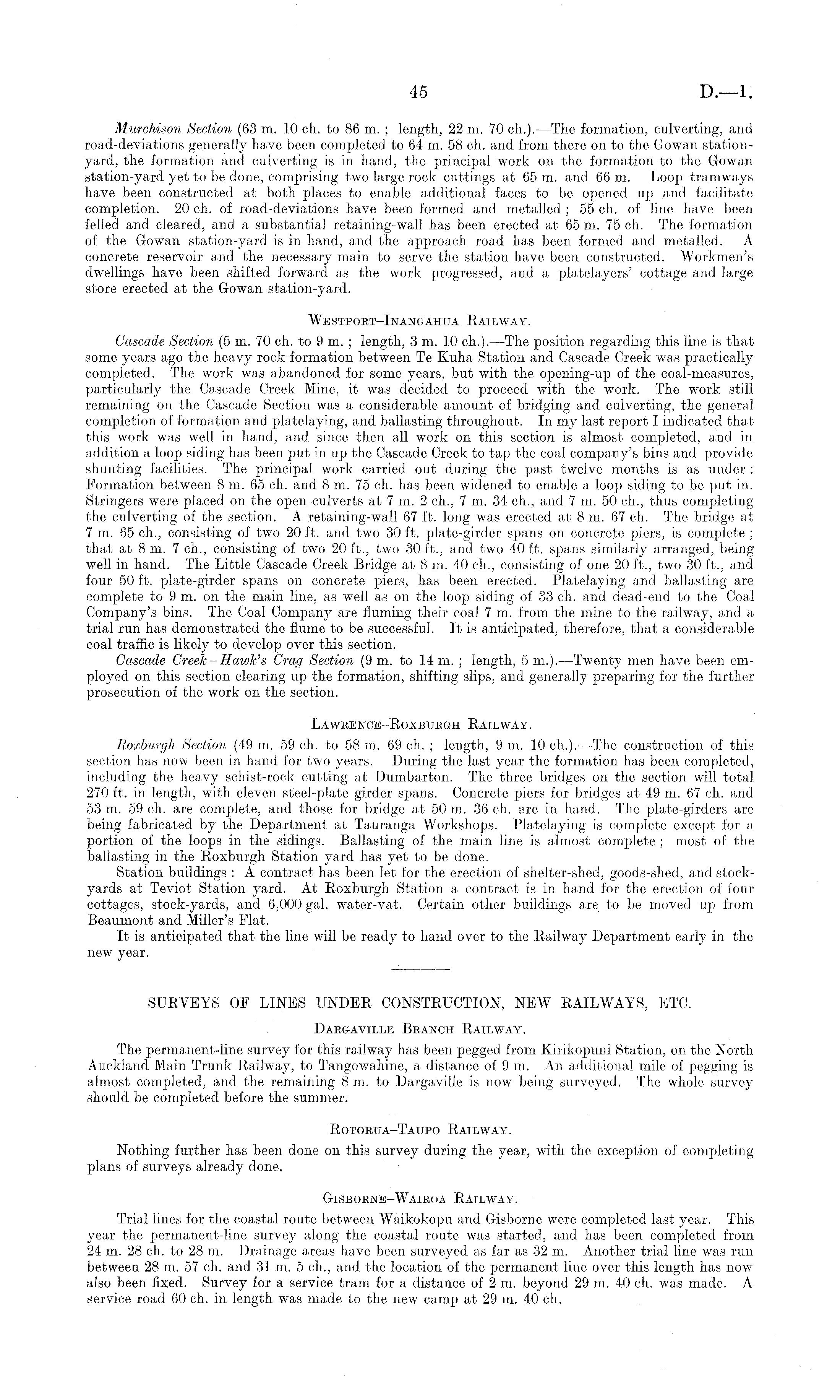Murchison Section (63 m. 10 ch. to 86 m. ; length, 22 m. 70 ch.). —The formation, culverting, and road-cleviations generally have been completed to 64 m. 58 ch. and from there on to the Gowan stationyard, the formation and culverting is in hand, the principal work on the formation to the Gowan station-yard yet to be done, comprising two large rock cuttings at 65 m. and 66 m. Loop tramways have been constructed at both places to enable additional faces to be opened up and facilitate completion. 20 ch. of road-deviations have been formed and metalled ; 55 ch. of line have been felled and cleared, and a substantial retaining-wall has been erected at 65 m. 75 ch. The formation of the Gowan station-yard is in hand, and the approach road has been formed and metalled. A concrete reservoir and the necessary main to serve the station have been constructed. Workmen's dwellings have been shifted forward as the work progressed, and a platelayers' cottage and large store erected at the Gowan station-yard. Westport-Inangahua Railway. Cascade Section (5 m. 70 ch. to 9 m. ; length, 3 m. 10 ch.). —The position regarding this line is that some years ago the heavy rock formation between Te Kuha Station and Cascade Creek was practically completed. The work was abandoned for some years, but with the opening-up of the coal-measures, particularly the Cascade Creek Mine, it was decided to proceed with the work. The work still remaining on the Cascade Section was a considerable amount of bridging and culverting, the general completion of formation and platelaying, and ballasting throughout. In my last report I indicated that this work was well in hand, and since then all work on this section is almost completed, and in addition a loop siding has been put in up the Cascade Creek to tap the coal company's bins and provide shunting facilities. The principal work carried out during the past twelve months is as under : Formation between 8 m. 65 ch. and 8 m. 75 ch. has been widened to enable a loop siding to be put in. Stringers were placed on the open culverts at 7 m. 2 ch., 7 m. 34 ch., and 7 m. 50 ch., thus completing the culverting of the section. A retaining-wall 67 ft. long was erected at Bm. 67 ch. The bridge at 7 m. 65 ch., consisting of two 20 ft. and two 30 ft. plate-girder spans on concrete piers, is complete ; that at 8 m. 7 ch., consisting of two 20 ft., two 30 ft., and two 40 ft. spans similarly arranged, being well in hand. The Little Cascade Creek Bridge at Bm. 40 ch., consisting of one 20 ft., two 30 ft., and four 50 ft. plate-girder spans on concrete piers, has been erected. Platelaying and. ballasting are complete to 9 m. on the main line, as well as on the loop siding of 33 ch. and dead-end to the Coal Company's bins. The Coal Company are fluming their coal 7m. from the mine to the railway, and a trial run has demonstrated the flume to be successful. It is anticipated, therefore, that a considerable coal traffic is likely to develop over this section. Cascade Creek-Hawk's Crag Section (9 m. to 14 m. ; length, 5 m.). —Twenty men have been employed on this section clearing up the formation, shifting slips, and generally preparing for the further prosecution of the work on the section. Lawrence-Roxburgh Railway. Roxburgh Section (49 m. 59 ch. to 58 m. 69 ch. ; length, 9m. 10 ch.). —The construction of this section has now been in hand for two years. During the last year the formation has been completed, including the heavy schist-rock cutting at Dumbarton. The three bridges on the section will total 270 ft. in length, with eleven steel-plate girder spans. Concrete piers for bridges at 49 m. 67 ch. and 53 m. 59 ch. are complete, and those for bridge at 50 m. 36 ch. are in hand. The plate-girders are being fabricated by the Department at Tauranga Workshops. Platelaying is complete except for a portion of the loops in the sidings. Ballasting of the main line is almost complete ; most of the ballasting in the Roxburgh Station yard has yet to be done. Station buildings : A contract has been let for the erection of shelter-shed, goods-shed, and stockyards at Teviot Station yard. At Roxburgh Station a contract is in hand for the erection of four cottages, stock-yards, and 6,000 gal. water-vat. Certain other buildings are to be moved up from Beaumont and Miller's Plat. It is anticipated that the line will be ready to hand over to the Railway Department early in the new year. SURVEYS OF LINES UNDER CONSTRUCTION, NEW RAILWAYS, ETC. Dargaville Branch Railway. The permanent-line survey for this railway has been pegged from Kirikopuni Station, on the North Auckland Main Trunk Railway, to Tangowahine, a distance of 9m. An additional mile of pegging is almost completed, and the remaining Bm. to Dargaville is now being surveyed. The whole survey should be completed before the summer. Rotortja-Taupo Railway. Nothing further has been done on this survey during the year, with the exception of completing plans of surveys already done. Gisborne-Wairoa Railway. Trial lines for the coastal route between Waikokopu and Gisborne were completed last year. This year the permanent-line survey along the coastal route was started, and has been completed from 24 m. 28 ch. to 28 ni. Drainage areas have been surveyed as far as 32 m. Another trial line was run between 28 m, 57 ch. and 31 m. 5 ch., and the location of the permanent line over this length has now also been fixed. Survey for a service tram for a distance of 2m. beyond 29 m. 40 ch. was made. A service road 60 ch. in length was made to the new camp at 29 m. 40 ch.