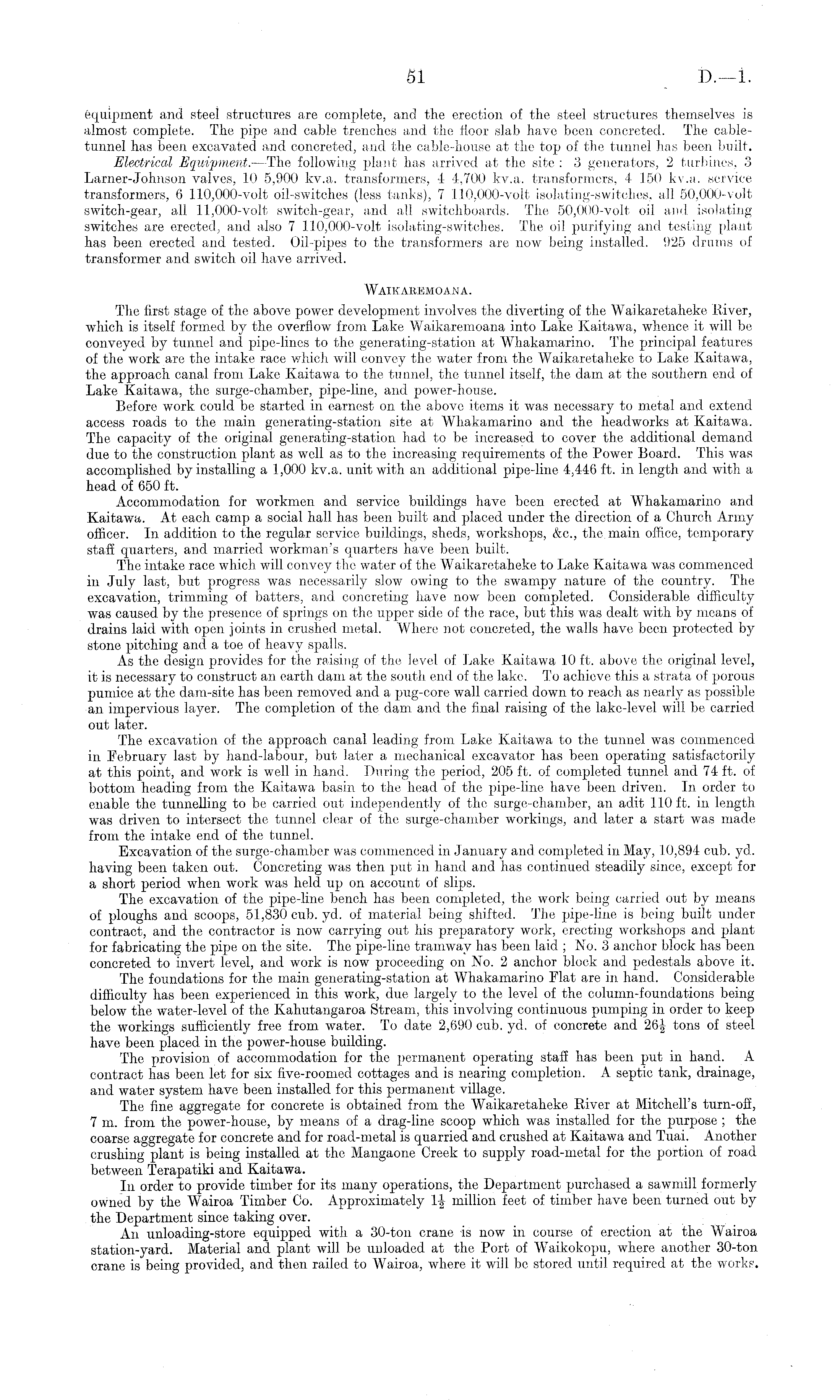 equipment and steei structures are complete, and the erection of the steel structures themselves is almost complete. The pipe and cable trenches and the floor slab have been concreted. The cabletunnel has been excavated and concreted, and the cable-house at the top of the tunnel has been built. Electrical Equipment. —The following plant has arrived at the site : 3 generators, 2 turbines, 3 Larner-Johnson valves, 10 5,900 kv.a. transformers, 4 4,700 kv.a. transformers, 4 150 kv.a. servicetransformers, 6 110,000-volt oil-switches (less tanks), 7 110,000-volt isolating-switches, all 50,000-volt switch-gear, all 11,000-volt switch-gear, and all switchboards. The 50,000-volt oil and isolating switches are erected, and also 7 110,000-volt isolating-switches. The oil purifying and testing plant has been erected and tested. Oil-pipes to the transformers are now being installed. 925 drums of transformer and switch oil have arrived. Waikaremoana. The first stage of the above power development involves the diverting of the Waikaretaheke River, which is itself formed by the overflow from Lake Waikaremoana into Lake Kaitawa, whence it will be conveyed by tunnel and pipe-lines to the generating-station at Whakamarino. The principal features of the work are the intake race which will convey the water from the Waikaretaheke to Lake Kaitawa, the approach canal from Lake Kaitawa to the tunnel, the tunnel itself, the dam at the southern end of Lake Kaitawa, the surge-chamber, pipe-line, and power-house. Before work could be started in earnest on the above items it was necessary to metal and extend access roads to the main generating-station site at Whakamarino and the headworks at Kaitawa. The capacity of the original generating-station had to be increased to cover the additional demand due to the construction plant as well as to the increasing requirements of the Power Board. This was accomplished by installing a 1,000 kv.a. unit with an additional pipe-line 4,446 ft. in length and with a head of 650 ft. Accommodation for workmen and service buildings have been erected at Whakamarino and Kaitawa. At each camp a social hall has been built and placed under the direction of a Church Army officer. In addition to the regular service buildings, sheds, workshops, &c., the main office, temporary sta.fi quarters, and married workman's quarters have been built. The intake race which will convey the water of the Waikaretaheke to Lake Kaitawa was commenced in July last, but progress was necessarily slow owing to the swampy nature of the country. The excavation, trimming of batters, and concreting have now been completed. Considerable difficulty was caused by the presence of springs on the upper side of the race, but this was dealt with by means of drains laid with open joints in crushed metal. Where not concreted, the walls have been protected by stone pitching and a toe of heavy spalls. As the design provides for the raising of the level of Lake Kaitawa 10 ft. above the original level, it is necessary to construct an earth dam at the south end of the lake. To achieve this a strata of porous pumice at the dam-site has been removed and a pug-core wall carried down to reach as nearly as possible an impervious layer. The completion of the dam and the final raising of the lake-level will be carried out later. The excavation of the approach canal leading from Lake Kaitawa to the tunnel was commenced in February last by hand-labour, but later a mechanical excavator has been operating satisfactorily at this point, and work is well in hand. During the period, 205 ft. of completed tunnel and 74 ft. of bottom heading from the Kaitawa basin to the head of the pipe-line have been driven. In order to enable the tunnelling to be carried out independently of the surge-chamber, an adit 110 ft. in length was driven to intersect the tunnel clear of the surge-chamber workings, and later a start was made from the intake end of the tunnel. Excavation of the surge-chamber was commenced in January and completed in May, 10,894 cub. yd. having been taken out. Concreting was then put in hand and has continued steadily since, except for a short period when work was held up on account of slips. The excavation of the pipe-line bench has been completed, the work being carried out by means of ploughs and scoops, 51,830 cub. yd. of material being shifted. The pipe-line is being built under contract, and the contractor is now carrying out his preparatory work, erecting workshops and plant for fabricating the pipe on the site. The pipe-line tramway has been laid ; No. 3 anchor block has been concreted to invert level, and work is now proceeding on No. 2 anchor block and pedestals above it. The foundations for the main generating-station at Whakamarino Flat are in hand. Considerable difficulty has been experienced in this work, due largely to the level of the column-foundations being below the water-level of the Kahutangaroa Stream, this involving continuous pumping in order to keep the workings sufficiently free from water. To date 2,690 cub. yd. of concrete and 26f tons of steel have been placed in the power-house building. The provision of accommodation for the permanent operating staff has been put in hand. A contract has been let for six five-roomed cottages and is nearing completion. A septic tank, drainage, and water system have been installed for this permanent village. The fine aggregate for concrete is obtained from the Waikaretaheke River at Mitchell's turn-off, 7 m. from the power-house, by means of a drag-line scoop which was installed for the purpose ; the coarse aggregate for concrete and for road-metal is quarried and crushed at Kaitawa and Tuai. Another crushing plant is being installed at the Mangaone Creek to supply road-metal for the portion of road between Terapatiki and Kaitawa. In order to provide timber for its many operations, the Department purchased a sawmill formerly owned by the Wairoa Timber Co. Approximately If million