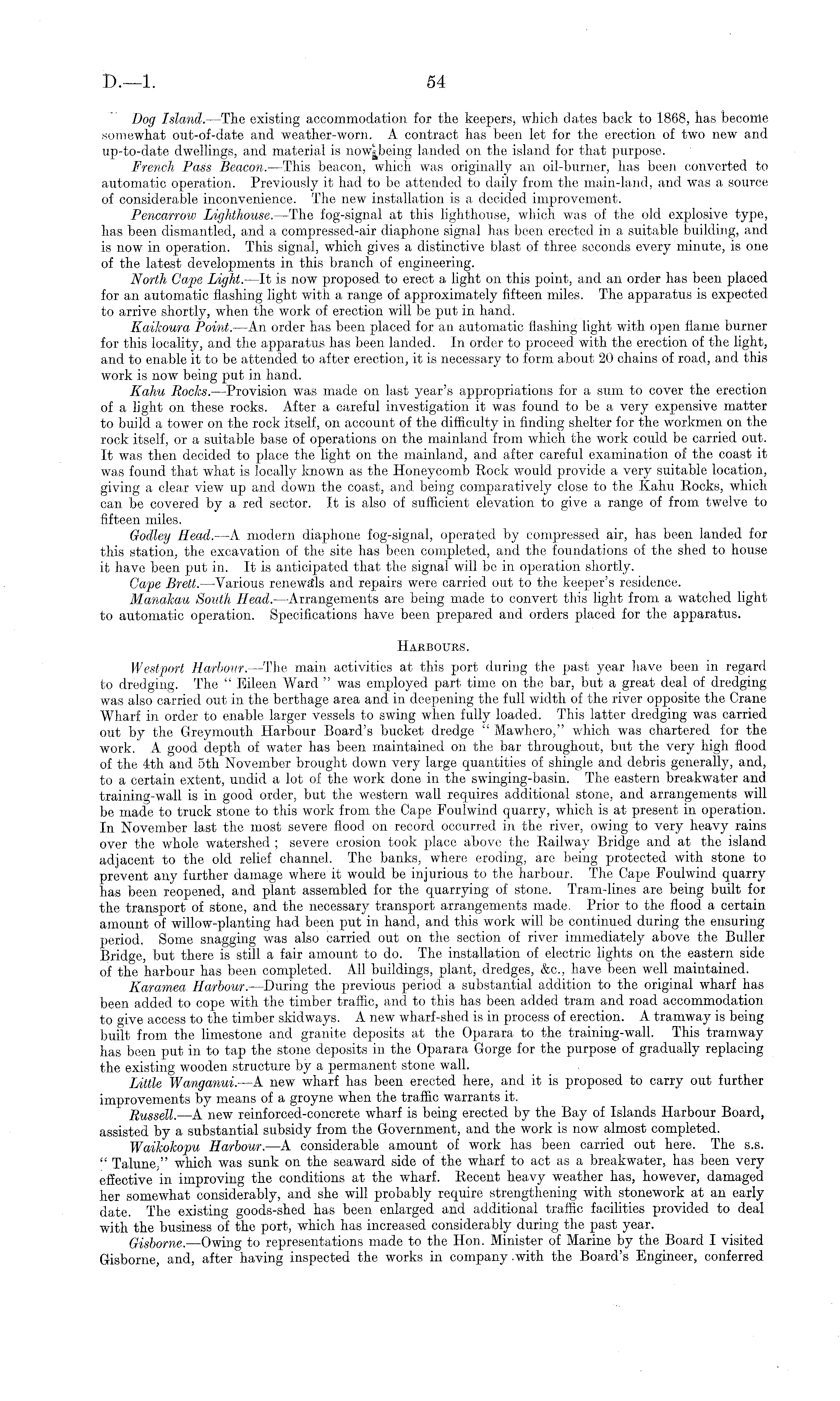 Dog Island.—Tie existing accommodation for the keepers, which dates back to 1868, has become somewhat out-of-date and weather-worn. A contract has been let for the erection of two new and up-to-date dwellings, and material is no w« being landed on the island for that purpose. French Pass Beacon. —This beacon, which was originally an oil-burner, has been converted to automatic operation. Previously it had to be attended to daily from the main-land, and was a source of considerable inconvenience. The new installation is a decided improvement. Pencarrow Lighthouse. —The fog-signal at this lighthouse, which was of the old explosive type, has been dismantled, and a compressed-air diaphone signal has been erected in a suitable building, and is now in operation. This signal, which gives a distinctive blast of three seconds every minute, is one of the latest developments in this branch of engineering. North Cape Light. —It is now proposed to erect a light 011 this point, and an order has been placed for an automatic flashing light with a range of approximately fifteen miles. The apparatus is expected to arrive shortly, when the work of erection will be put in hand. Kaikoura Point. —An order has been placed for an automatic flashing light with open flame burner for this locality, and the apparatus has been landed. In order to proceed with the erection of the light, and to enable it to be attended to after erection, it is necessary to form about 20 chains of road, and this work is now being put in hand. Kahu Rocks. —Provision was made on last year's appropriations for a sum to cover the erection of a light on these rocks. After a careful investigation it was found to be a very expensive matter to build a tower on the rock itself, on account of the difficulty in finding shelter for the workmen on the rock itself, or a suitable base of operations on the mainland from which the work could be carried out. It was then decided to place the light on the mainland, and after careful examination of the coast it was found that what is locally known as the Honeycomb Rock would provide a very suitable location, giving a clear view up and down the coast, and being comparatively close to the Kahu Rocks, which can be covered by a red sector. It is also of sufficient elevation to give a range of from twelve to fifteen miles. Godley Head. —A modern diaphone fog-signal, operated by compressed air, has been landed for this station, the excavation of the site has been completed, and the foundations of the shed to house it have been put in. It is anticipated that the signal will be in operation shortly. Cape Brett. —Various renewals and repairs were carried out to the keeper's residence. Manalcau South Head. —Arrangements are being made to convert this light from a watched light to automatic operation. Specifications have been prepared and orders placed for the apparatus. Harbours. Westport Harbour. —The main activities at this port during the past year have been in regard to dredging. The " Eileen Ward " was employed part time on the bar, but a great deal of dredging was also carried out in the berthage area and in deepening the full width of the river opposite the Crane Wharf in order to enable larger vessels to swing when fully loaded. This latter dredging was carried out by the Greymouth Harbour Board's bucket dredge " Mawhero," which was chartered for the work. A good depth of water has been maintained on the bar throughout, but the very high flood of the 4th and sth November brought down very large quantities of shingle and debris generally, and, to a certain extent, undid a lot of the work done in the swinging-basin. The eastern breakwater and training-wall is in good order, but the western wail requires additional stone, and arrangements will be made to truck stone to this work from the Cape Foulwind quarry, which is at present in operation. In November last the most severe flood on record occurred in the river, owing to very heavy rains over the whole watershed ; severe erosion took place above the Railway Bridge and at the island adjacent to the old relief channel. The banks, where eroding, are being protected with stone to prevent any further damage where it would be injurious to the harbour. The Cape Foulwind quarry has been reopened, and plant assembled for the quarrying of stone. Tram-lines are being built for the transport of stone, and the necessary transport arrangements made. Prior to the flood a certain amount of willow-planting had been put in hand, and this work will be continued during the ensuring period. Some snagging was also carried out on the section of river immediately above the Buller Bridge, but there is still a fair amount to do. The installation of electric lights 011 the eastern side of the harbour has been completed. All buildings, plant, dredges, &c., have been well maintained. Karamea Harbour. —During the previous period a substantial addition to the original wharf has been added to cope with the timber traffic, and to this has been added tram and road accommodation to give access to the timber skidways. A new wharf-shed is in process of erection. A tramway is being built from the limestone and granite deposits at the Oparara to the training-wall. This tramway has been put in to tap the stone deposits in the Oparara Gorge for the purpose of gradually replacing the existing wooden structure by a permanent stone wall. Little Wanganui. —A new wharf has been erected here, and it is proposed to carry out further improvements by means of a groyne when the traffic warrants it. Russell. —A new reinforced-concrete wharf is being erected by the Bay of Islands Harbour Board, assisted by a substantial subsidy from the Government, and the work is now almost completed. Waihohopu Harbour. —A considerable amount of work has been carried out here. The s.s. " Talune." which was sunk on the seaward side of the wharf to act as a breakwater, has been very effective in improv