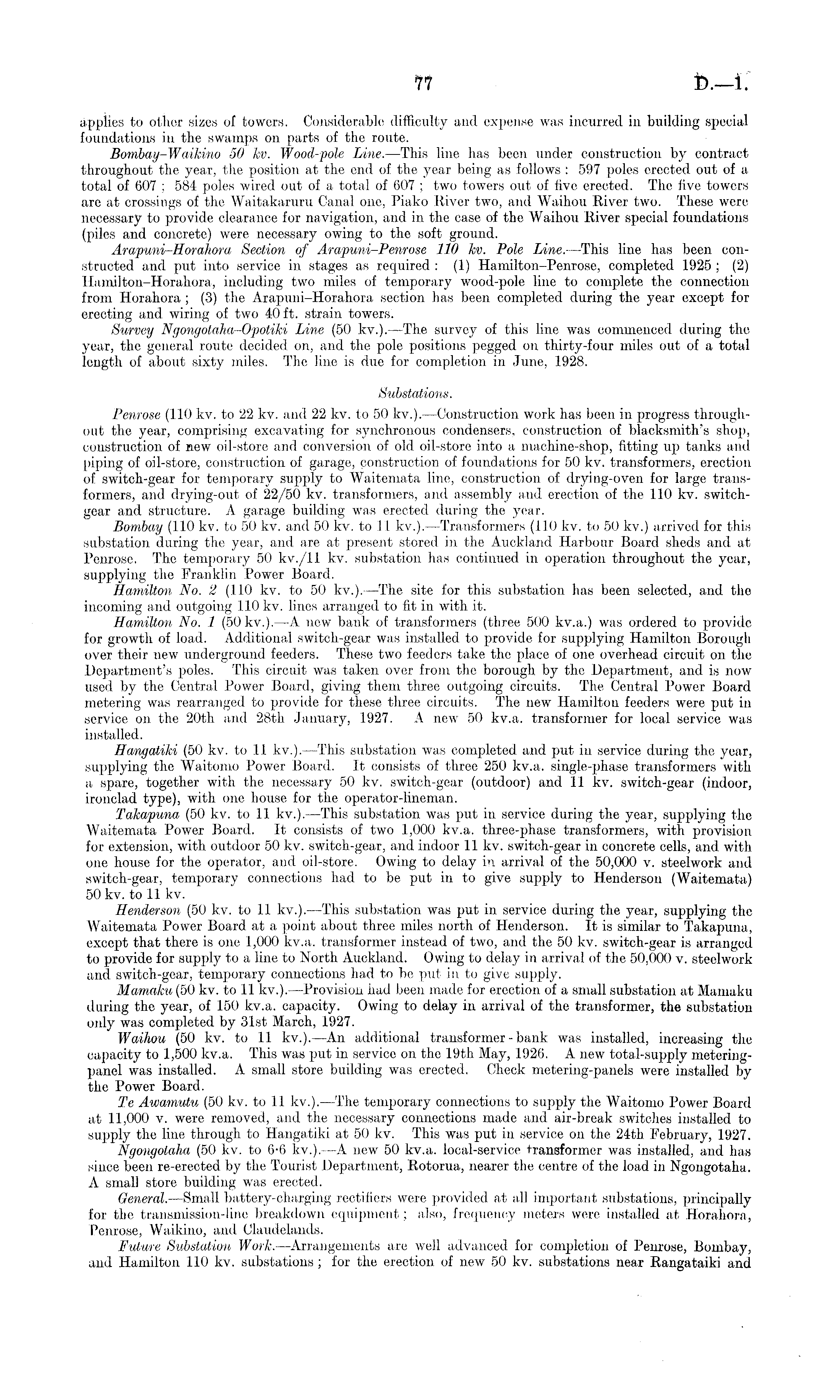 applies to other sizes of towers. Considerable difficulty and expense was incurred in building special foundations in the swamps on parts of the route. Bombay-Waikino 50 kv. Wood-pole Line. —This line has been under construction by contract throughout the year, the position at the end of the year being as follows : 597 poles erected out of a total of 607 ; 584 poles wired out of a total of 607 ; two towers out of five erected. The five towers are at crossings of the Waitakaruru Canal one, Piako River two, and Waihou River two. These were necessary to provide clearance for navigation, and in the case of the Waihou River special foundations (piles and concrete) were necessary owing to the soft ground. Arapuni-Horahora Section of Arapuni-Penrose 110 kv. Pole Line.—This line has been constructed and put into service in stages as required : (1) Hamilton-Penrose, completed 1925 ; (2) Hamilton-Horahora, including two miles of temporary wood-pole line to complete the connection from Horahora ; (3) the Arapuni-Horahora section has been completed during the year except for erecting and wiring of two 40 ft. strain towers. Survey Ngongotaha-Opotilci Line (50 kv.). —The survey of this line was commenced during the year, the general route decided on, and the pole positions pegged on thirty-four miles out of a total length of about sixty miles. The line is due for completion in June, 1928. Substations. Penrose (110 kv. to 22 kv. and 22 kv. to 50 kv.). —Construction work has been in progress throughout the year, comprising excavating for synchronous condensers, construction of blacksmith's shop, construction of new oil-store and conversion of old oil-store into a machine-shop, fitting up tanks and piping of oil-store, construction of garage, construction of foundations for 50 kv. transformers, erection of switch-gear for temporary supply to Waitemata line, construction of drying-oven for large transformers, and drying-out of 22/50 kv. transformers, and assembly and erection of the 110 kv. switchgear and structure. A garage building was erected during the year. Bombay (110 kv. to 50 kv. and 50 kv. to 11 kv.). —Transformers (110 kv. to 50 kv.) arrived for this substation during the year, and are at present stored, in the Auckland Harbour Board sheds and at Penrose. The temporary 50 kv./ll kv. substation has continued in operation throughout the year, supplying the Franklin Power Board. Hamilton No. 2 (.110 kv. to 50 kv.). —The site for this substation has been selected, and the incoming and outgoing 110 kv. lines arranged to fit in with. it. Hamilton No. 1 (50 kv.). —A new bank, of transformers (three 500 kv.a.) was ordered to provide for growth of load. Additional switch-gear was installed to provide for supplying Hamilton Borough over their new underground feeders. These two feeders take the place of one overhead circuit on the Department's poles. This circuit was taken over from the borough by the Department, and is now used by the Central Power Board, giving them three outgoing circuits. The Central Power Board metering was rearranged to provide for these three circuits. The new Hamilton feeders were put in service on the 20th and 28th January, 1927. A new 50 kv.a. transformer for local service was installed. HangatiJci (50 kv. to 11 kv.). —This substation was completed and put ill service during the year, supplying the Waitomo Power Board. It consists of three 250 kv.a. single-phase transformers with a spare, together with the necessary 50 kv. switch-gear (outdoor) and 11 kv. switch-gear (indoor, ironclad type), with one house for the operator-lineman. Takapuna (50 kv. to 11 kv.).—This substation was put in service during the year, supplying the Waitemata Power Board. It consists of two 1,000 kv.a. three-phase transformers, with provision for extension, with outdoor 50 kv. switch-gear, and indoor 11 kv. switch-gear in concrete cells, and with one house for the operator, and oil-store. Owing to delay in arrival of the 50,000 v. steelwork and switch-gear, temporary connections had to be put in to give supply to Henderson (Waitemata) 50 kv. to 11 kv. Henderson (50 kv. to 11 kv.). —This substation was put in service during the year, supplying the Waitemata Power Board at a point about three miles north of Henderson. It is similar to Takapuna, except that there is one 1,000 kv.a. transformer instead of two, and the 50 kv. switch-gear is arranged to provide for supply to a line to North Auckland. Owing to delay in arrival of the 50,000 v. steelwork and switch-gear, temporary connections had to be put in to give supply. Mamaku (50 kv. to 11 kv.). —Provision had been made for erection of a small substation at Mamaku during the year, of 150 kv.a. capacity. Owing to delay in arrival of the transformer, the substation only was completed by 31st March, 1927. Waihou (50 kv. to 11 kv.). —An additional transformer - bank was installed, increasing the capacity to 1,500 kv.a. This was put in service on the 19th May, 1926. A new total-supply meteringpanel was installed. A small store building was erected. Check metering-panels were installed by the Power Board. Te Awamutu (50 kv. to 11 kv.). —The temporary connections to supply the Waitomo Power Board at J. 1,000 v. were removed, and the necessary connections made and air-break switches installed to supply the line through to Hangatiki at 50 kv. This was put in service on the 24th February, 1927. Ngongolaha (50 kv. to 6-6 kv.). —A new 50 kv.a. local-service transformer was installed, and has since been re-erected by the Tourist Department, Rotorua, nearer the centre of the load in Ngongotaha. A small store building was erected. General. —Small battery-charging rectifiers were provided at all important substations, principally for the transmission-line breakdown equipment; also, frequency meters were installed at Horahora, Penrose, Waikino, and Claudelands. Future Substation Work.—Arrangements are well advanced for completion of Penrose,