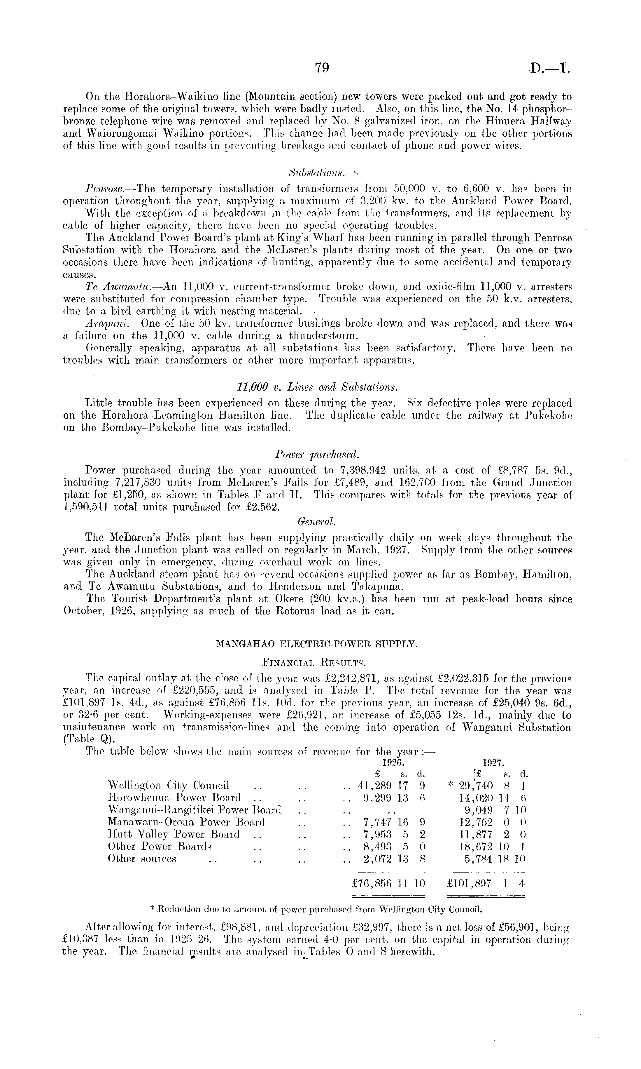 On the Horahora-Waikino line (Mountain section) new towers were packed out and got ready to replace some of the original towers, which were badly rusted. Also, on this line, the No. 14 phosphorbronze telephone wire was removed and replaced by No. 8 galvanized iron, on the Hinuera-Halfway and Waiorongomai-Waikino portions. This change liad been made previously on the other portions of this line with good results in preventing breakage and contact of phone and power wires. Substations, s Penrose. —The temporary installation of transformers from 50,000 v. to 6,600 v. has been in operation throughout the year, supplying a maximum of 3,200 kw. to the Auckland Power Board. With the exception of a breakdown in the cable from the transformers, and its replacement by cable of higher capacity, there have been no special operating troubles. The Auckland Power Board's plant at King's Wharf has been running in parallel through Penrose Substation with the Horahora, and the McLaren's plants during most of the year. On one or two occa.sions there have been indications of hunting, apparently due to some accidental and temporary causes. Te Awamutu.—An 11,000 v. current-transformer broke down, and oxide-film 11,000 v. arresters were substituted for compression chamber type. Trouble was experienced on the 50 k.v. arresters, due to a bird earthing it with nesting-material. Arapuni.—One of the 50 kv. transformer bushings broke down and was replaced, and there was a failure on the 11,000 v. cable during a thunderstorm. Generally speaking, apparatus at all substations has been satisfactory. There have been no troubles with main transformers or other more important apparatus. 11,000 v. Lines and Substations. Little trouble has been experienced on these during the year. Six defective poles were replaced on the Horahora-Leamington-Hamilton line. The duplicate cable under the railway at Pukekohe on the Bombay-Pukekohe line was installed. Power 'purchased. Power purchased during the year amounted to 7,398,942 units, at a cost of £8,787 ss. 9d., including 7,217,830 units from McLaren's Falls for. £7,489, and 162,700 from the Grand Junction plant for £1,250, as shown in Tables F and H. This compares with totals for the previous year of 1,590,511 total units purchased for £2,562. General. The McLaren's Falls plant has been supplying practically daily on week days throughout the year, and the Junction plant was called on regularly in March, 1927. Supply from the other sources was given only in emergency, during overhaul work on lines. The Auckland steam plant has on several occasions supplied power as far as Bombay, Hamilton, and Te Awamutu Substations, and to Henderson and Takapuna. The Tourist Department's plant at Okere (200 kv.a.) has been run at peak-load hours since October, 1926, supplying as much of the Rotorua load as it can. MANGAHAO ELECTRIC-POWER SUPPLY. Financial Results. The capital outlay at the close of the year was £2,242,871, as against £2,022,315 for the previous year, an increase of £220,555, and is analysed in Table P. The total revenue for the year was £101,897 Is. 4d., as against £76,856 lis. 10d. for the previous year, an increase of £25,040 9s. 6d., or 32-6 per cent. Working-expenses were £26,921, an increase of £5,055 12s. Id., mainly due to maintenance work on transmission-lines and the coming into operation of Wanganui Substation (Table Q). The table below shows the main sources of revenue for the year : — 1926. 1027. £ s. d. '£ s. d. Wellington City Council .. .. ..41,289 17 9 * 29,740 8 1 Horowhenua Power Board .. .. .. 9,299 13 6 14,020 14 6 Wanganui-Rangitikei Power Board .. .. .. 9,049 710 Manawatu-Oroua Power Board .. .. 7,747 16 9 12,752 0 0 Ilutt Valley Power Board .. .. .. 7,953 5 2 11,877 2 0 Other Power Boards .. .. .. 8,493 5 0 18,672 10 1 Other sources .. .. .. .. 2,072 13 8 5,784 18 10 £76,856 11 10 £101,897 I 4 * Reduction duo to amount of power purchased from Wellington City Council. After allowing for interest, £98,881, and depreciation £32,997, there is a net loss of £56,901, being £10,387 less than in 1925-26. The system earned 4-0 per cent, on the capital in operation during the year. The financial results are analysed inj Tables O and S herewith.