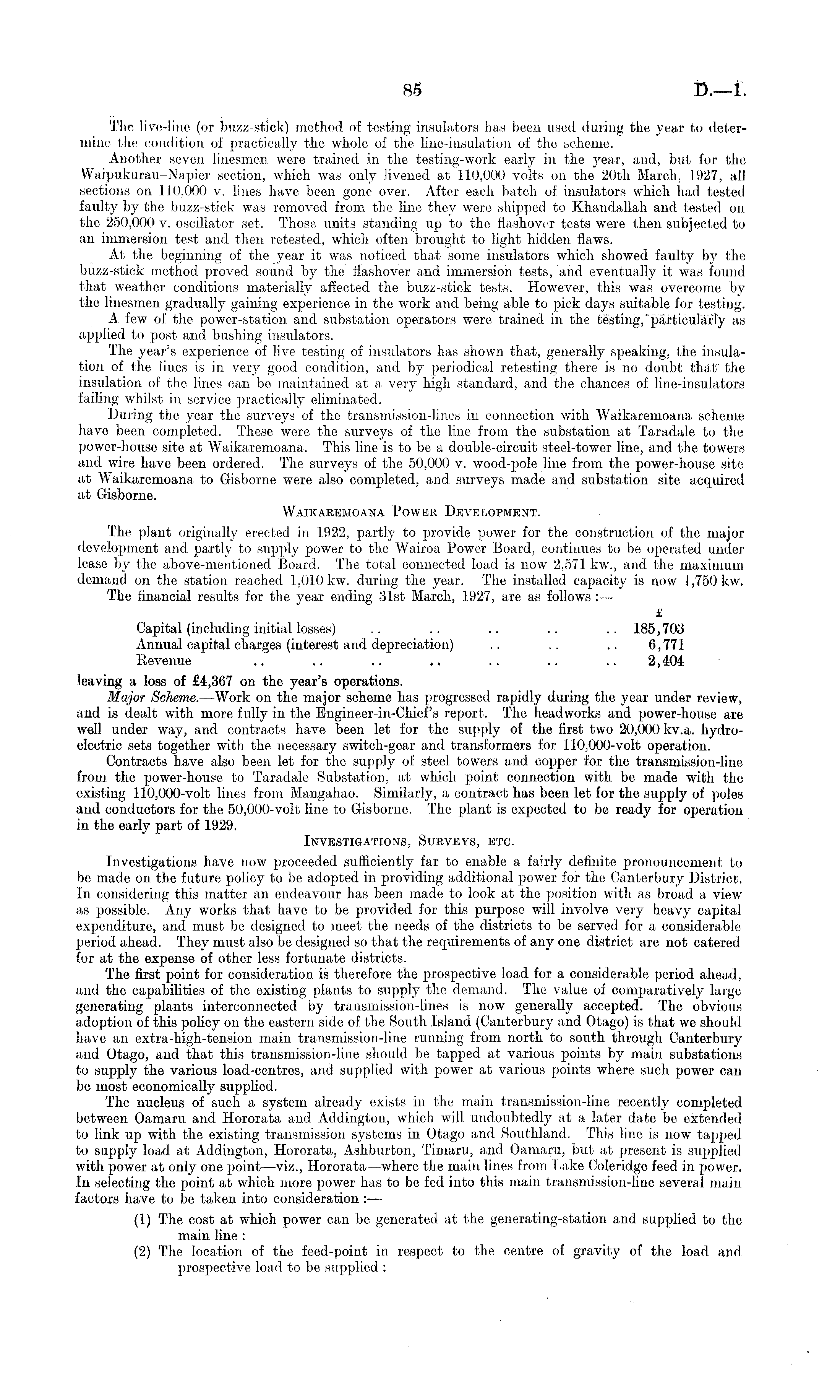 The live-line (or buzz-stick) method of testing insulators has been used during the year to determine the condition of practically the whole of the line-insulation of the scheme. Another seven linesmen were trained in the testing-work early in the year, and, but for the Waipukurau-Napier section, which was only livened at 110,000 volts on the 20th March, 1927, all sections on 110,000 v. lines have been gone over. After each batch of insulators which had tested faulty by the buzz-stick was removed from the line they were shipped to Khandallah and tested on the 250,000 v. oscillator set. Those units standing up to the flashover tests were then subjected to an immersion test and then retested, which often brought to light hidden flaws. At the beginning of the year it was noticed that some insulators which showed faulty by the buzz-stick method proved sound by the flashover and immersion tests, and eventually it was found that weather conditions materially affected the buzz-stick tests. However, this was overcome by the linesmen gradually gaining experience in the work and being able to pick days suitable for testing. A few of the power-station and substation operators were trained in the testing,"particularly as applied to post and bushing insulators. The year's experience of live testing of insulators has shown that, generally speaking, the insulation of the lines is in very good condition, and by periodical retesting there is no doubt that" the insulation of the lines can be maintained at a very high standard, and the chances of line-insulators failing whilst in service practically eliminated. During the year the surveys of the transmission-lines in connection with Waikaremoana scheme have been completed. These were the surveys of the line from the substation at Taradale to the power-house site at Waikaremoana. This line is to be a double-circuit steel-tower line, and the towers and wire have been ordered. The surveys of the 50,000 v. wood-pole line from the power-house site at Waikaremoana to Gisborne were also completed, and surveys made and substation site acquired at Gisborne. Waikaremoana Power Development. The plant originally erected in 1922, partly to provide power for the construction of the major development and partly to supply power to the Wairoa Power Board, continues to be operated under lease by the above-mentioned Board. The total connected load is now 2,571 kw., and the maximum demand on the station reached 1,010 kw. during the year. The installed capacity is now 1,750 kw. The financial results for the year ending 31st March, 1927, are as follows :— £ Capital (including initial losses) .. .. .. .. .. 185,703 Annual capital charges (interest and depreciation) .. .. .. 6,771 Revenue .. .. .. .. .. .. .. 2,404 leaving a loss of £4,367 on the year's operations. Major Scheme.—Work on the major scheme has progressed rapidly during the year under review, and is dealt with more fully in the Engineer-in-Chief's report. The headworks and power-house are well under way, and contracts have been let for the supply of the first two 20,000 kv.a. hydroelectric sets together with the necessary switch-gear and transformers for 110,000-volt operation. Contracts have also been let for the supply of steel towers and copper for the transmission-line from the power-house to Taradale Substation, at which point connection with be made with the existing 110,000-volt lines from Mangahao. Similarly, a contract has been let for the supply of poles and conductors for the 50,000-volt line to Gisborne. The plant is expected to be ready for operation in the early part of 1929. Investigations, Surveys, etc. Investigations have now proceeded sufficiently far to enable a fairly definite pronouncement to be made on the future policy to be adopted in providing additional power for the Canterbury District. In considering this matter an endeavour has been made to look at the position with as broad a view as possible. Any works that have to be provided for this purpose will involve very heavy capital expenditure, and must be designed to meet the needs of the districts to be served for a considerable period ahead. They must also be designed so that the requirements of any one district are not catered for at the expense of other less fortunate districts. The first point for consideration is therefore the prospective load for a considerable period ahead, and the capabilities of the existing plants to supply the demand. The value of comparatively large generating plants interconnected by transmission-lines is now generally accepted. The obvious adoption of this policy on the eastern side of the South Island (Canterbury and Otago) is that we should have an extra-high-tension main transmission-line running from north to south through Canterbury and Otago, and that this transmission-line should be tapped at various points by main substations to supply the various load-centres, and supplied with power at various points where such power can bo most economically supplied. The nucleus of such a system already exists in the main transmission-line recently completed between Oamaru and Hororata and Addington, which will undoubtedly at a later date be extended to link up with the existing transmission systems in Otago and Southland. This line is now tapped to supply load at Addington, Hororata, Ashburton, Timaru, and Oamaru, but at present is supplied with power at only one point —viz., Hororata —where the main lines from Lake Coleridge feed in power. In selecting the point at which more power has to be fed into this main transmission-line several main factors have to be taken into consideration — (1) The cost at which power can be generated at the generating-station and supplied to the main line : (2) The location of the feed-point in respect to the centre of gravity of the load and prospective load to be supplied :