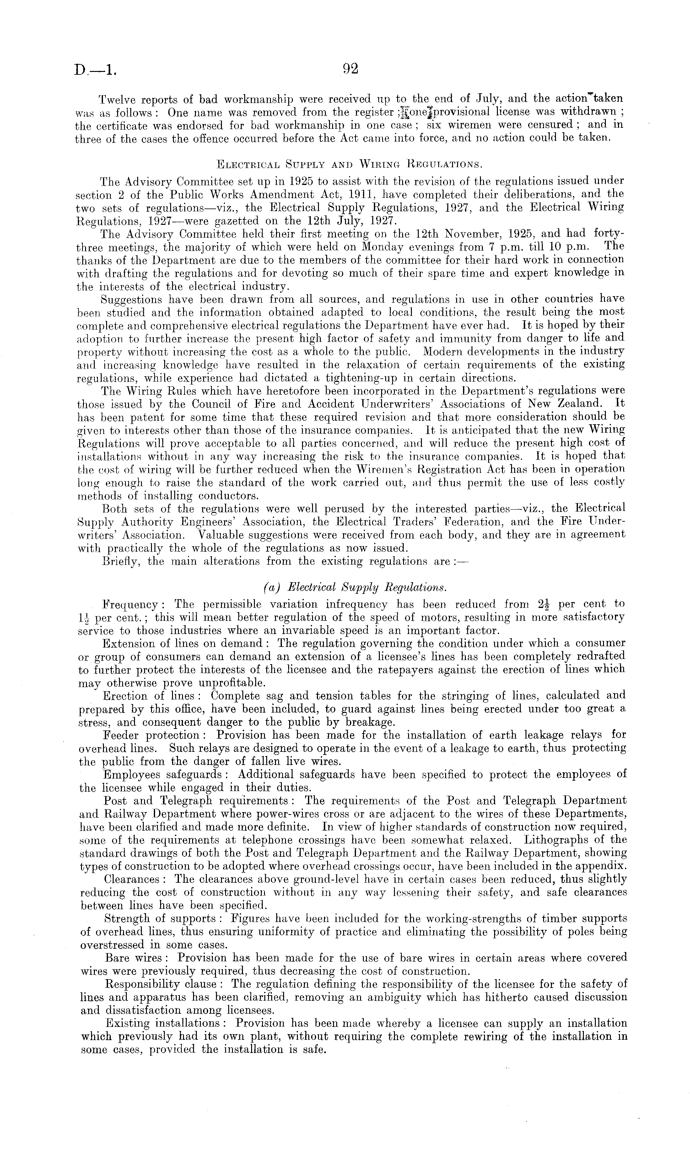 Twelve reports of bad workmanship were received up to the end of July, and the action'taken was as follows : One name was removed from the register ;||one|provisional license was withdrawn ; the certificate was endorsed for bad workmanship in one case ; six wiremen were censured ; and in three of the cases the offence occurred before the Act came into force, and no action could be taken. Electrical Supply and Wiring Regulations. The Advisory Committee set up in 1925 to assist with the revision of the regulations issued under section 2 of the Public Works Amendment Act, 1911, have completed their deliberations, and the two sets of regulations—viz., the Electrical Supply Regulations, 1927, and the Electrical Wiring Regulations, 1927 —were gazetted on the 12th July, 1927. The Advisory Committee held their first meeting on the 12th November, 1925, and had fortythree meetings, the majority of which were held on Monday evenings from 7 p.m. till 10 p.m. The thanks of the Department are due to the members of the committee for their hard work in connection with drafting the regulations and for devoting so much of their spare time and expert knowledge in the interests of the electrical industry. Suggestions have been drawn from all sources, and regulations in use in other countries have been studied and the information obtained adapted to local conditions, the result being the most complete and comprehensive electrical regulations the Department have ever had. It is hoped by their adoption to further increase the present high factor of safety and immunity from danger to life and property without increasing the cost as a whole to the public. Modern developments in the industry and increasing knowledge have resulted in the relaxation of certain requirements of the existing regulations, while experience had dictated a tightening-up in certain directions. The Wiring Rules which have heretofore been incorporated in the Department's regulations were those issued by the Council of Eire and Accident Underwriters' Associations of New Zealand. It has been patent for some time that these required revision and that more consideration should be given to interests other than those of the insurance companies. It is anticipated that the new Wiring Regulations will prove acceptable to all parties concerned, and will reduce the present high cost of installations without in any way increasing the risk to the insurance companies. It is hoped that the cost of wiring will be further reduced when the Wiremen's Registration Act has been in operation long enough to raise the standard of the work carried out, and thus permit the use of less costly methods of installing conductors. Both sets of the regulations were well perused by the interested parties—viz., the Electrical Supply Authority Engineers' Association, the Electrical Traders' Federation, and the Eire Underwriters' Association. Valuable suggestions were received from each body, and they are in agreement with practically the whole of the regulations as now issued. Briefly, the main alterations from the existing regulations are : — (a) Electrical Supply Regulations. Frequency: The permissible variation infrequency has been reduced from 2J per cent to 1J per cent.; this will mean better regulation of the speed of motors, resulting in more satisfactory service to those industries where an invariable speed is an important factor. Extension of lines on demand : The regulation governing the condition under which a consumer or group of consumers can demand an extension of a licensee's lines has been completely redrafted to further protect the interests of the licensee and the ratepayers against the erection of lines which may otherwise prove unprofitable. Erection of lines : Complete sag and tension tables for the stringing of lines, calculated and prepared by this office, have been included, to guard against lines being erected under too great a stress, and consequent danger to the public by breakage. Feeder protection : Provision has been made for the installation of earth leakage relays for overhead lines. Such relays are designed to operate in the event of a leakage to earth, thus protecting the public from the danger of fallen live wires. Employees safeguards : Additional safeguards have been specified to protect the employees of the licensee while engaged in their duties. Post and Telegraph requirements : The requirements of the Post and Telegraph Department and Railway Department where power-wires cross or are adjacent to the wires of these Departments, have been clarified and made more definite. In view of higher standards of construction now required, some of the requirements at telephone crossings have been somewhat relaxed. Lithographs of the standard drawings of both the Post and Telegraph Department and the Railway Department, showing types of construction to be adopted where overhead crossings occur, have been included in the appendix. Clearances : The clearances above ground-level have in certain cases been reduced, thus slightly reducing the cost of construction without in any way lessening their safety, and safe clearances between lines have been specified. Strength of supports : Figures have been included for the working-strengths of timber supports of overhead lines, thus ensuring uniformity of practice and eliminating the possibility of poles being overstressed in some cases. Bare wires : Provision has been made for the use of bare wires in certain areas where covered wires were previously required, thus decreasing the cost of construction. Responsibility clause : The regulation defining the responsibility of the licensee for the safety of lines and apparatus has been clarified, removing an ambiguity which has hitherto caused discussion and dissatisfaction among licensees. Existing installations : Provision has been made whereby a licensee can supply an installation which previously had its own plant, without requiring the complete rewiring of