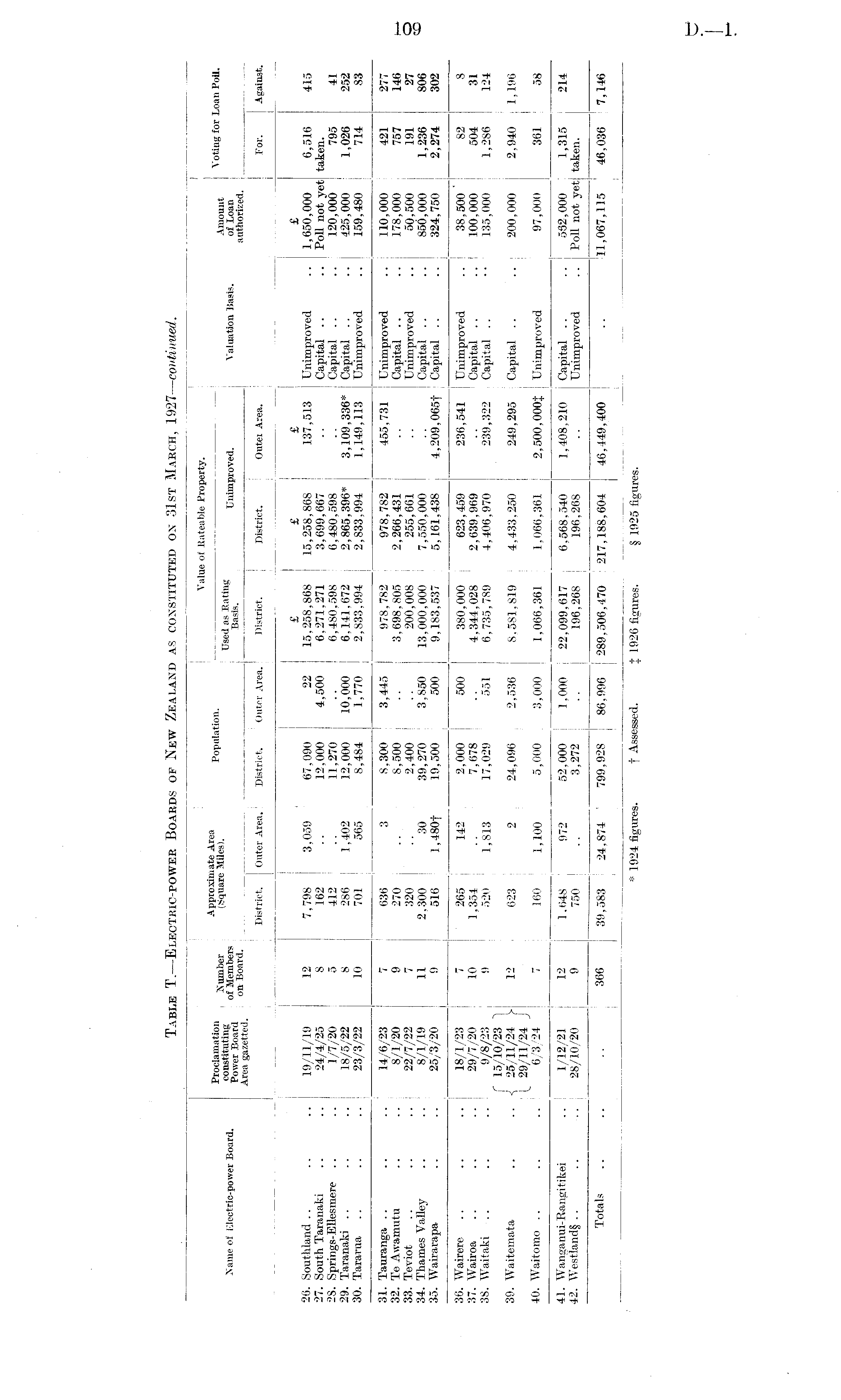 Value of Rateable Property. C S, a tw xumber A fsquaK Mnefr Population. — -j Amount Voting for Loan Poll. Name of Electric-power Board. i of Members usea asitaung Unimproved. Valuation Basis. of Loan ™ Board. ; _ _ __ _ _ 1 j j authorized. District, j Outer Area. District. Outer Area. District. | District. Outer Area. For. Against. ! I 1 | j I I I i I £ ! £ £ £ 26. Southland.. .. .. 19/11/10 12 7,798 3.059 67,090 22 15,258,868 i 15,258,868 137,513 Unimproved .. 1,650,000 6,516 415 27. South Taranaki .. .. 24/4/25 8 162 .. 12,000 4,500 6,271,271 3,699,667 .. Capital .. .. Poll not yet taken. 28. Springs-EIlcsmere .. .. 1/7/20 5 412 .. 11,270 .. 6,480,598 6,480,598 .. Capital .. .. 120,000 795 41 29. Taranaki .. .. .. 18/5/22 8 286 1,402 12,000 10,000 6,141,672 2,865,396* 3,109,336* Capital .. .. 425,000 1,026 252 30. Tararua .. .. .. 23/3/22 10 701 565 8,484 1,770 2,833,994 : 2,833,994 1,149,113 Unimproved .. 159,480 714 83 ! 1 1 ! 31. Tauranga .. .. .. 14/6/23 7 636 3 8,300 3,445 : 978,782 978,782 455,731 Unimproved .. 110,000 421 277 32. TeAwamutu .. .. 8/1/20 9 270 .. 8,500 .. 3,698.805 2,266,431 .. Capital .. .. 178,000 757 146 33. Teviot .. .. .. 22/7/22 7 320 .. 2,400 .. j 200,008 255,661 .. Unimproved .. 50,500 191 27 34. Thames Valley .. .. 8/1/19 11 2,300 30 39,270 3,850 1 13,000,000 7,550,000 .. Capital .. .. 850,000 1,236 806 35. Wairarapa .. .. 25/3/20 9 516 l,480f 19,500 500 ; 9,183,537 5,161,438 4,209,065f Capital .. .. 324,750 2,274 302 36. Wairere .. .. .. 18/1/23 7 265 142 2,000 500 j 380,000 623,459 236,541 Unimproved .. 38,500 82 8 37. Wairoa .. .. .. 29/7/20 10 1,354 .. 7,678 .. I 4,344,028 2,639,969 .. Capital .. .. 100,000 504 31 38. Waitaki .. .. .. 9/8/23 9 520 1,813 17,029 551 I 6,735,789 4,406,970 239,322 Capital .. •• 135,000 1,286 124 | f 15/10/23 "} 39. Waitemata .. .. 25/11/24 )■ 12 623 2 24,096 2,536 j S,581, 819 4,433,250 249,295 Capital .. .. 200,000 2,940 1,196 L 29/11/24 J 40. Waitomo .. .. .. 6/3/24 7 160 1,100 5,000 3,000 ' 1,066,361 1,066,361 2,500,000j Unimproved 97,000 361 58 41. Wanganui-Rangitikei .. 1/12/21 12 1.648 972 52,000 1,000 22,099,617 6,568,540 1,408,210 Capital .. .. 582,000 1,315 214 42. Westland§ .. .. .. 28/10/20 9 750 .. 3,272 .. I 196,268 196,268 .. Unimproved .. Poll not yet taken. Totals .. .. .. 366 39,583 24,874 799,928 86,996 289,506,470 217,188,604 46,449,400 .. 11,067,115 46,036 7,146 * 1924 figures. t Assessed. t 1926 figures. § 1925 figures.