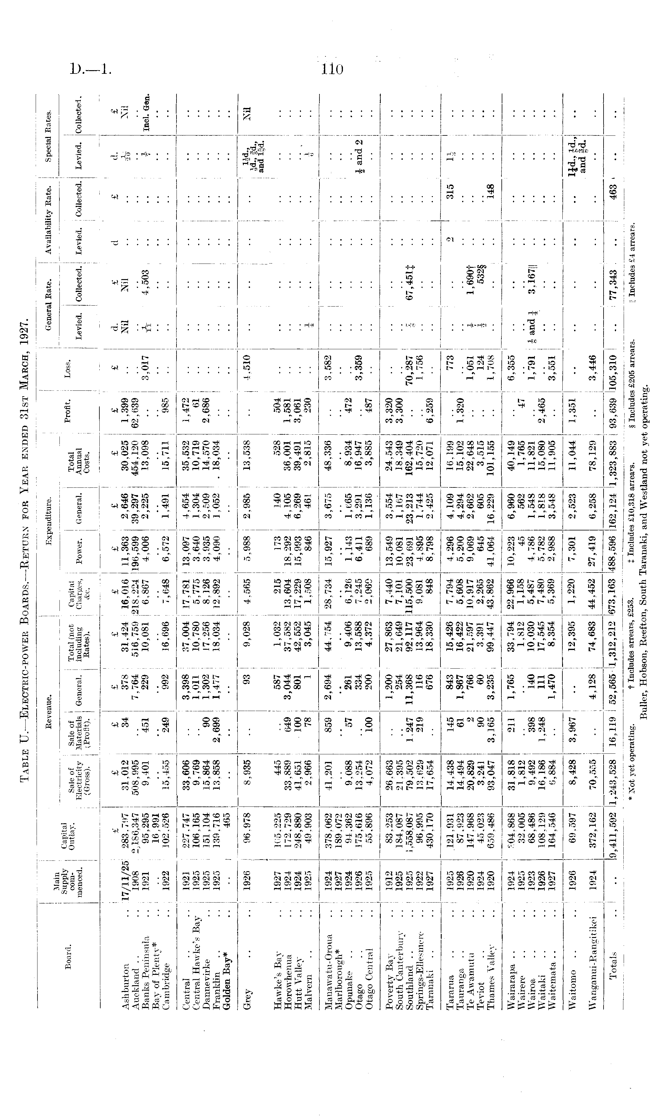 Revenue. Expenditure. General Rate. Availability Rate. Special Rates. Main I : | Supply Capital | 1 Profit Tn« I ■ BoarcU com- Outlay. Sale of , Sale of j j Total (not j Capital i | Total r * -L-os^. menced. Electricity J Materials i General. ! including 1 Charges, 1 Power. ! General, j Annual Levied. Collected. Levied. I Collected. Levied. (Collected. (Gross)/ i (Profit), j j Rates). &c. j j j Costs. . . r j £ £ £ £ £ £'£ £ I £ £ £ d. £ d £d. £ Ashburton .. 17/11/25 283,797 31,012 34 378 31,424 16,016 11,363 2,646 30,025 1,399 .. Nil Nil .. .. Nil Auckland.. .. 1908 2,186,347 508,995 .. 7,764 516,759 218,224 196,599 39,297 454.120 62,639 Banks Peninsula .. 1921 95,295 9,401 451 229 10,081 6,867 4.006 2,225 13,098 .. j 3,017 4,503 .. .. \ Bid. Gen. Bay Of Plenty* .. .. 16,991 Cambridge ' .. 1922 102,526 15,455 249 992 16.696 7,648 6,572 1.491 15,711 985 Central .. .. 1921 227,747 33,606 3,398 37,004 17,781 13,097 4,654 35,532 1,472 Central Hawke's Bay 1925 106.165 9.769 .. 1.011 10,780 5,775 3.640 1.304 10,719 61 .. .. .. j Dannevirke j 1925 151.104 15.864 90 1,302 17.256 8,126 3.935 2,509 14,570 2,686 .. .. Franklin .. .. 1925 139.716 13.858 2,699 1,477 18.034 12.892 4,090 1,052 . 18,034 Golden Bay* .. .. | 465 Grey .. .. 1926 96.978 8.935 .. 93 9,028 4,565 5,988 2.985 13,538 .. 4.510 .. .. .. .. lid-, Nil J i | | j id., -id., and l§d. Hawke's Bay .. 1927 105,225 445 .. 587 1,032 215 173 140 528 504 .. .. .. .. Horowhenua .. 1924 172.729 33.889 649 3,044 37,582 13,604 18,292 4,105 36,001 1,581 Hutt Valley .. 1924 248,880 41,651 100 801 42,552 17,229 15,993 6,269 39,491 3,061 Malvern ... 1925 49.903 2.966 78 1 , 3,045 1,508 846 461 2,815 230 .. | .. .. .. } s Manawatu-Oroua .. | 1924 378.062 41.201 859 2,694 44,754 28,734 15,927 3,675 48.336 .. j 3,582 J Marlborough* .. 1927 189.072 .. .. .. .. .. .. .. .. .. .. .... Opunake .. .. 1924 94.362 9.088 57 261 9,406 6,126 1,143 1,665 8,934 472 .. .. .. .. .. .. Otago .. .. 1926 175,616 13.254 .. 334 13,588 7,245 6.411 3,291 16,947 .. 3,359 .. .. .. .. i and 2 Otago Central .. ! 1925 55.896 4,072 100 200 4.372 2,060 689 1,136 3,885 487 .. .. .. .. .. .. j : : , : J Poverty Bay .. ! 1912 83,253 26.663 .. 1,200 27,863 7,440 13,549 3,554 24.543 3,320 South Canterbury .. 1925 184,087 21.395 .. 254 21,649 7,101 10,081 1,167 18,349 3,300 Southland .. ' .. 1925 1,558.087 79,502 1.247 11,368 92.117 115,500 23,691 23,213 162,404 .. 70,287 g 67,451{ Springs-EUesmere .. j 1922 96,995 13,629 219 116 13,964 9,081 4,895 1,744 15,720 .. 1,756 Taranaki .. ... 1927 430,170 17,654 .. 676 18,330 848 8.798 2.425 12,071 6,259 .. .. .. .. j .. Tararua .. .. I 1925 121,931 14,438 145 843 15,426 7.794 4,296 4,109 16.199 .. 773 .. .. 2 ' 315 1J Tauranga .. .. 1926 87.923 14.494 61 1,867 16,422 5,608 5,200 4,294 15,102 1.320 TeAwamutu .. 1920 147.968 20.829 2 766 21,597 10,917 9,069 2,662 22,648 .. 1,051 i 1,690+ Teviot .. .. 1924 45.023 3,241 90 60 3,391 2,265 645 605 3,515 .. 124 J 532§ Thames Valley .. 1920 659.486 93,047 3,165 3,235 99,447 43.862 41,064 16,229 101,155 .. 1,708 .. .. .. 148 Wairarapa .. .. 1924 - 04.868 31,818 211 1,765 33,794 22.966 10,223 6,960 40,149 .. 6,355 Wairere .. .. 1925 32.005 1,812 .. .. 1.812 1,158 45 562 1.765 47 Wairoa .. .. 1923 68,486 9,492 398 140 10.030 5,487 4,786 1,548 11,821 .. 1,791 J and J 3.167|| Waitaki .. .. 1926 108.129 16,186 1.248 111 17,545 7,480 5,782 1,818 15,080 2,465 .. .. Waitemata.. .. 1927 164,546 6,884 .. 1,470 8,354 5,369 2,988 3,548 11,905 .. 3,551 Waitomo .. .. 1926 69.597 8,428 3,967 .. 12,395 1,220 7,301 2,523 11,044 1,351 .. .. .. .. .. l£d., Jd., and §d. Wanganui-Rangitikei j 1924 372,162 70,555 .. 4,128 74,683 44.452 27,419 6,258 78,129 .. 3,446 Totals .. 1 .. 9,411,592 1,243,528 16,119 i 52,565 1,312,212 673,163 488,596 162,124 1,323,883 93,639 105,310 .. 77,343 .. 463' * Not yet operating. t Includes arrears, £253. i Includes £10,318 arrears. § Includes £205 arrears. || Includes £4 arrears. Buller, Hobson, Reefton, South Taranaki, and Westland not yet operating.