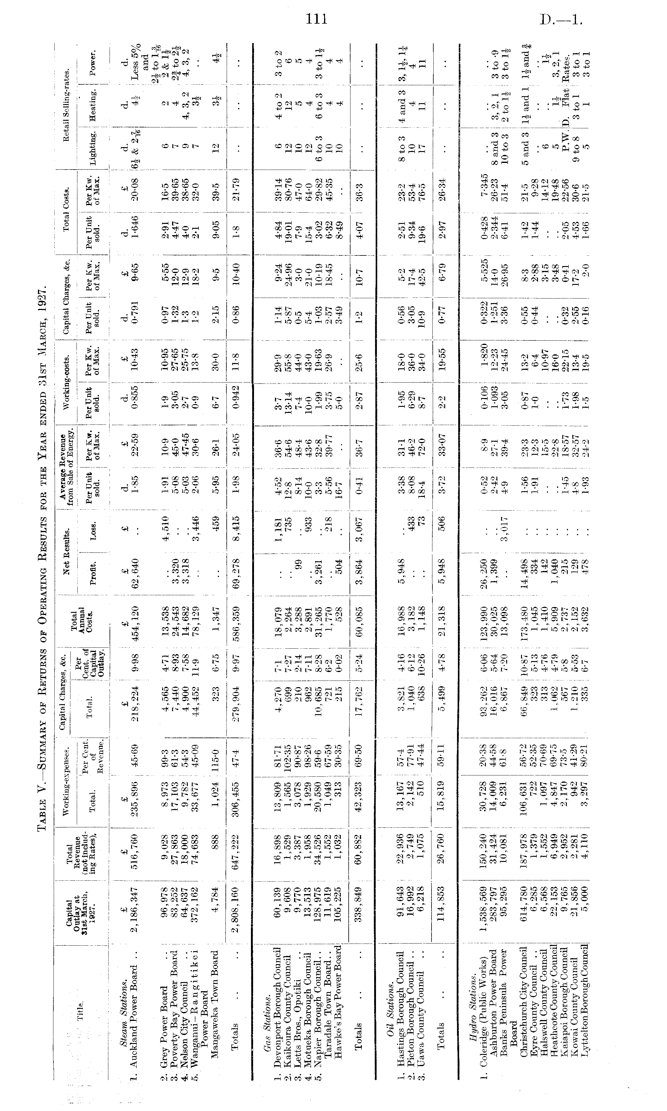 Table V.—Summary of Returns of Operating Results for the Year ended 31st March, 1927.