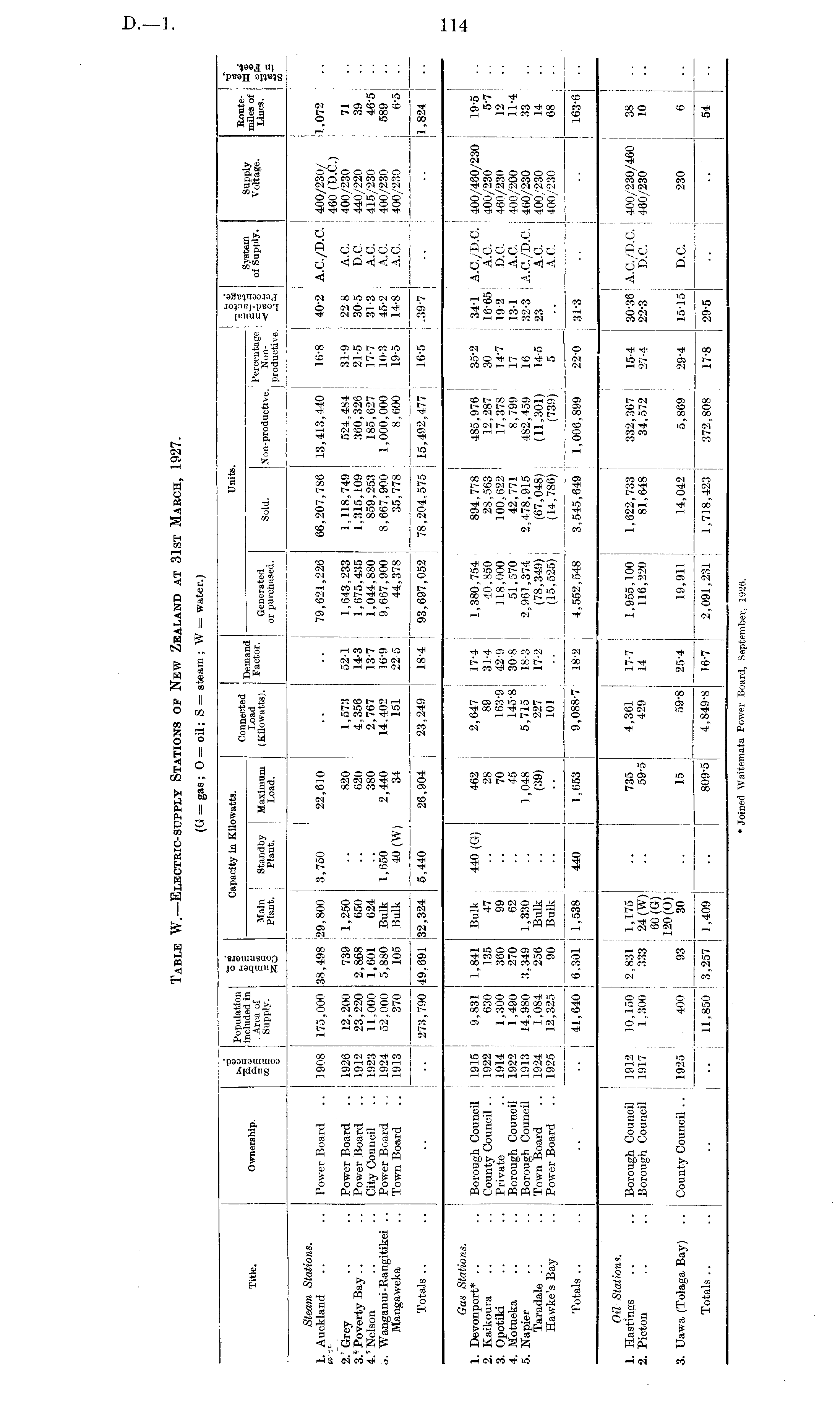 (G — gas; O = oil; S = steam ; W = water.) "S t> o £ Capacity in Kilowatts. Units. to >,o Population a> PnnriAPtpH « o « Routerr-*.! § ! included in £ : Demand : ; =.® a System Supply mllM of W © Title. Ownership, o<c Arpa of e m Faotnr i Percentage ? rl* 13 of SuddIv. Voltacrp iv. &i tupply 1| »* ai ? St p r d ? y ® e St e A Sold- Non-productive. Ton 8 -§H °' Supp y " olta « e ' Lmes. S» | Plant. Plant. Load. or purchased. r productive. 3S I I " ? Steam, Stations. 1. Auckland .. .. Power Board .. 1908 175,000 38,498 29,800 3,750 22,610 .. .. 79,621,226 66,207,786 13,413,440 16-8 40-2 A.C./D.C. 400/230/ 1,072 ** "• 460 (D.C.) 2." Grey .. .. Power Board .. 1926 12,200 739 1,250 .. 820 1,573 52 1 1,643,233 1,118,749 524,484 31-9 22 8 A.C. 400/230 71 3.'Poverty Bay.. .. Power Board .. 1912 23,220 2,868 650 .. 620 4,356 14-3 1,675,435 1,315,109 360,326 21-6 30-5 D.C 440/220 39 4."Nelson .. .. City Council .. 1923 11.000 1,601 624 .. 380 2,767 13-7 1,044,880 859,253 185,627 17-7 31-3 A.C. 415/230 46*5 .. •j. Wanganui-Rangitikei .. Power Board . .. 1924 52,000 5,880 Bulk 1,650 2,440 14,402 16*9 9,667,900 8,667,900 1,000,000 10-3 45-2 A.C. 400/230 589 Mangaweka .. Town Board .. 1913 370 105 Bulk 40 (W) 34 151 22 5 44,378 35,778 8,600 19-5 14-8 A.C. 400/230 6'5 .. Totals.. .. .. .. 273,790 49,691 32,324 5,440 j 26,904 23,249 18-4 93,697,052 78,204,575 15,492,477 16-5 .39-7 .. .. 1,824 - - ■ - ■ ■ ■ — ■ — ■ ■ 1 " ™ ' 1 Gas Stations. 1. Devonport* .. .. Borough Council 1915 9,831 1,841 Bulk 440(G) 462 2,647 17-4 1,380,754 894,778 485,976 35-2 34-1 A.C./D.C. 400/460/230 19-5 2. Kaikoura .. .. County Council .. 1922 630 135 47 28 89 31-4 40,850 28,563 12,287 30 : 16-65 A.C. 400/230 5-7 3. Opotiki .. .. Private .. 1914 1,300 360 99 70 163-9 42-9 118,000 100,622 17,378 14*7 19-2 D.C. 460/230 12 4. Motueka .. .. Borough Council 1922 1,490 270 62 45 145-8 30*8 51,570 42,771 8,799 17 13-1 A.C. 400/200 11-4 5. Napier .. .. Borough Council 1913 14,980 3,349 1,330 .. 1,048 5,715 18-3 2,961,374 2,478,915 482,459 16 32-3 | A.C./D.C. 460/230 33 Taradale .. .. Town Board .. 1924 1,084 256 Bulk .. ! (39) 227 17-2 (78,349) (67,048) (11,301) 14-5 23 A.C. 400'230 14 Hawke's Bay .. Power Board .. 1925 12,325 90 Bulk .. .. 101 .. (15,525)1 (14,786) (739) 5 .. A.C. 400/230 68 1 ! ] 1 1 Totals.. .. .. .. 41,640 I 6,301 1,538 440 1,653 9,088-7 18-2 4,552,548 3,545,649 1,006,899 22-0 31-3 .. .. 163-6 „ [ | i Oil Stations. 1. Hastings .. .. Borough Council 1912 10,150 2,831 1,175 .. 735 4,361 17-7 1,955,100 1,622,733 332,367' 15-4 30-36 A.C./D.C. 1 400/230/460 38 2. Picton .. .. Borough Council 1917 1.300 333 24 (W) .. 59-5 429 14 116,220 ! 81,648 34,572 27-4 22*3 D.C. 460/230 10 ; 1 60(G) : 120(0) 3. TJawa (Tolaga Bay) .. County Council .. 1925 400 93 30 .. 15 59*8 25-4 19,911 14,042 5,869 29-4 15-15 D.C. 230 6 : — ! — 1 Totals.. .. .. .. 11,850 13,257 1,409 .. 809-5 4,849-8 16-7 2,091,231 1,718,423 372,808 17-8 29-5 .. .. 54 _____ _ * Joined Waitemata Power Board, September, 1926.