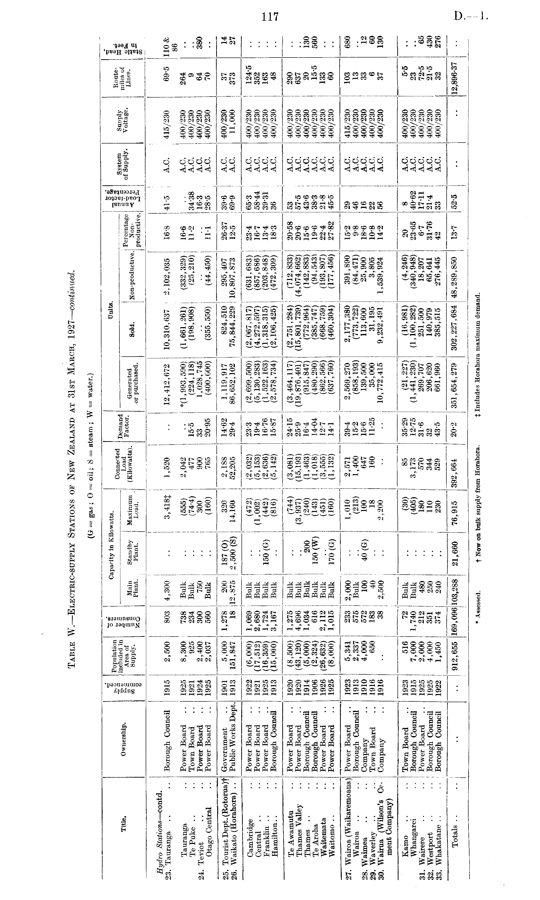Table W.—Electric-supply Stations of New Zealand at 31st March, 1927—continued.
