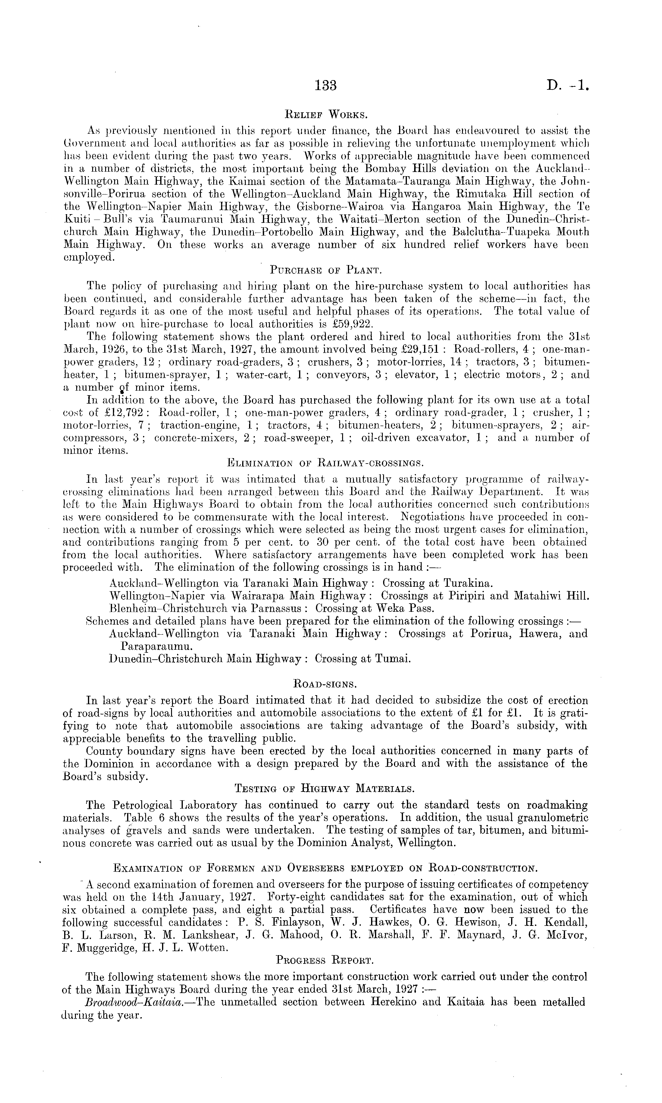 Relief Works. As previously mentioned in this report under finance, the Board has endeavoured to assist the Government and local authorities as far as possible in relieving the unfortunate unemployment which has been evident during the past two years. Works of appreciable magnitude have been commenced in a number of districts, the most important being the Bombay Hills deviation on the AucklandWellington Main Highway, the Kaimai section of the Matamata-Tauranga Main Highway, the John-sonville-Porirua section of the Wellington-Auckland Main Highway, the Rimutaka Hill section of the Wellington-Napier Main Highway, the G-isborne-Wairoa via Hangaroa Main Highway, the Te Kuiti - Bull's via Taumarunui Main Highway, the Waitati-Merton section of the Dunedin-Christ-church Main Highway, the Dunedin-Portobello Main Highway, and the Balclutha-Tuapeka Mouth Main Highway. On these works an average number of six hundred relief workers have been employed. Purchase op Plant. The policy of purchasing and hiring plant on the hire-purchase system to local authorities has been continued, and considerable further advantage has been taken of the scheme—in fact, the Board regards it as one of the most useful and helpful phases of its operations. The total value of plant now on hire-purchase to local authorities is £59,922. The following statement shows the plant ordered and hired to local authorities from the 31st March, 1926, to the 31st March, 1927, the amount involved being £29,151 : Road-rollers, 4 ; one-man-power graders, 12 ; ordinary road-graders, 3 ; crushers, 3 ; motor-lorries, 14 ; tractors, 3 ; bitumenheater, 1 ; bitumen-sprayer, 1 ; water-cart, 1 ; conveyors, 3 ; elevator, 1 ; electric motors, 2 ; and a number yf minor items. In addition to the above, the Board has purchased the following plant for its own use at a total cost of £12,792 : Road-roller, 1 ; one-man-power graders, 4 ; ordinary road-grader, 1 ; crusher, 1 ; motor-lorries, 7 ; traction-engine, 1 ; tractors, 4 ; bitumen-heaters, 2 ; bitumen-sprayers, 2 ; aircompressors, 3 ; concrete-mixers, 2 ; road-sweeper, 1 ; oil-driven excavator, 1 ; and a number of minor items. Elimination of Railway-crossings. In last year's report it was intimated that a mutually satisfactory programme of railwaycrossing eliminations had been arranged between this Board and the Railway Department. It was left to the Main Highways Board to obtain from the local authorities concerned such contributions as were considered to be commensurate with the local interest. Negotiations have proceeded in connection with a number of crossings which were selected as being the most urgent cases for elimination, and contributions ranging from 5 per cent, to 30 per cent, of the total cost have been obtained from the local authorities. Where satisfactory arrangements have been completed work has been proceeded with. The elimination of the following crossings is in hand : — Auckland-Wellington via Taranaki Main Highway : Crossing at Turakina. Wellington-Napier via Wairarapa Main Highway : Crossings at Piripiri and Matahiwi Hill. Blenheim-Christchurch via Parnassus : Crossing at Weka Pass. Schemes and detailed plans have been prepared for the elimination of the following crossings : — Auckland-Wellington via Taranaki Main Highway : Crossings at Porirua, Hawera, and Paraparaumu. Dunedin-Christchurch Main Highway : Crossing at Tumai. Road-signs. In last year's report the Board intimated that it had decided to subsidize the cost of erection of road-signs by local authorities and automobile associations to the extent of £1 for £1. It is gratifying to note that automobile associations are taking advantage of the Board's subsidy, with appreciable benefits to the travelling public. County boundary signs have been erected by the local authorities concerned in many parts of the Dominion in accordance with a design prepared by the Board and with the assistance of the Board's subsidy. Testing of Highway Materials. The Petrological Laboratory has continued to carry out the standard tests on roadmaking materials. Table 6 shows the results of the year's operations. In addition, the usual granulometric analyses of gravels and sands were undertaken. The testing of samples of tar, bitumen, and bituminous concrete was carried out as usual by the Dominion Analyst, Wellington. Examination of Foremen and Overseers employed on Road-construction. A second examination of foremen and overseers for the purpose of issuing certificates of competency was held on the 14th January, 1927. Forty-eight candidates sat for the examination, out of which six obtained a complete pass, and eight a partial pass. Certificates have now been issued to the following successful candidates : P. S. Finlayson, W. J. Hawkes, 0. G. Hewison, J. H. Kendall, B. L. Larson, R. M. Lankshear, J. G. Mahood, 0. R. Marshall, F. F. Maynard, J. G. Mclvor, F. Muggeridge, H. J. L. Wotten. Progress Report. The following statement shows the more important construction work carried out under the control of the Main Highways Board during the year ended 31st March, 1927 : — Broadwood-Kaitaia. —The unmetalled section between Herekino and Kaitaia has been metalled during the year.