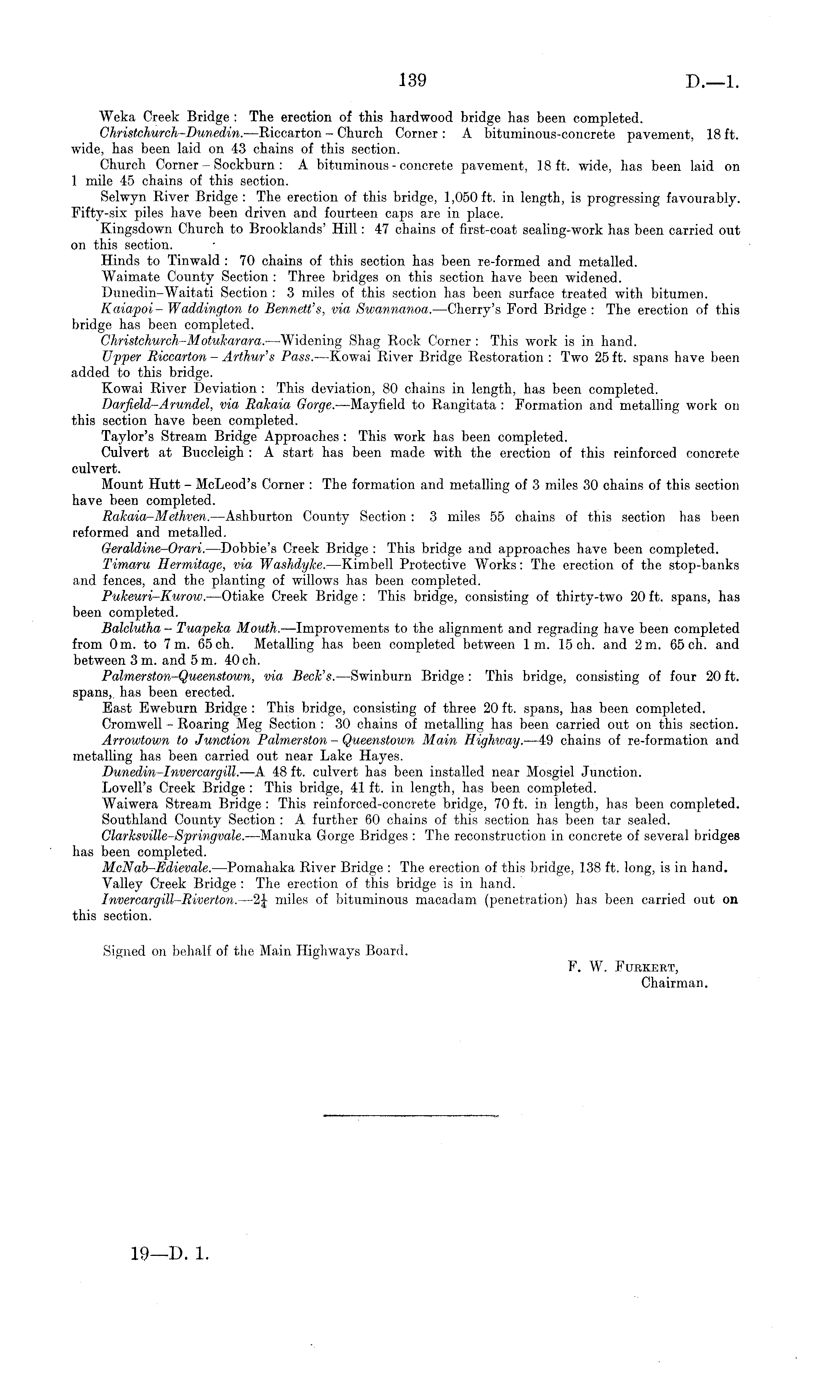 Weka Creek Bridge : The erection of this hardwood bridge has been completed. Christchurch-Dunedin.—Riccarton - Church Corner : A bituminous-concrete pavement, 18 ft. wide, has been laid on 43 chains of this section. Church Corner - Sockburn : A bituminous - concrete pavement, 18 ft. wide, has been laid on 1 mile 45 chains of this section. Selwyn River Bridge : The erection of this bridge, 1,050 ft. in length, is progressing favourably. Fifty-six piles have been driven and fourteen caps are in place. Kingsdown Church to Brooklands' Hill: 47 chains of first-coat sealing-work has been carried out on this section. Hinds to Tinwald : 70 chains of this section has been re-formed and metalled. Waimate County Section : Three bridges on this section have been widened. Dunedin-Waitati Section : 3 miles of this section has been surface treated with bitumen. Kaiapoi- Waddington to Bennett's, via Swannanoa. —Cherry's Ford Bridge : The erection of this bridge has been completed. Christchurch-Motukarara.—Widening Shag Rock Corner : This work is in hand. Upper Riccarton - Arthur's Pass. —Kowai River Bridge Restoration : Two 25 ft. spans have been added to this bridge. Kowai River Deviation : This deviation, 80 chains in length, has been completed. Barfield-Arundel, via Rakaia Gorge.—Mayfield to Rangitata : Formation and metalling work on this section have been completed. Taylor's Stream Bridge Approaches : This work has been completed. Culvert at Buccleigh : A start has been made with the erection of this reinforced concrete culvert. Mount Hutt - McLeod's Corner : The formation and metalling of 3 miles 30 chains of this section have been completed. Rakaia-Methven. —Ashburton County Section : 3 miles 55 chains of this section has been reformed and metalled. Geraldine-Orari.—Bobbie's Creek Bridge : This bridge and approaches have been completed. Timaru Hermitage, via Washdylce.—Kimbell Protective Works: The erection of the stop-banks and fences, and the planting of willows has been completed. Pukeuri-Kurow. —Otiake Creek Bridge : This bridge, consisting of thirty-two 20 ft. spans, has been completed. Balclutha - Tuapeka Mouth. —Improvements to the alignment and regrading have been completed from 0m.t07 m. 65 ch. Metalling has been completed between Im. 15 ch. and 2m. 65 ch. and between 3m. and sm. 40 ch. P aimer ston-Queenstown, via Beck's. —Swinburn Bridge : This bridge, consisting of four 20 ft. spans,, has been erected. East Eweburn Bridge : This bridge, consisting of three 20 ft. spans, has been completed. Cromwell - Roaring Meg Section : 30 chains of metalling has been carried out on this section. Arrowtown to Junction Palmerston - Queenstown Main Highway. —49 chains of re-formation and metalling has been carried out near Lake Hayes. Dunedin-Invercargill.—A 48 ft. culvert has been installed near Mosgiel Junction. Lovell's Creek Bridge : This bridge, 41 ft. in length, has been completed. Waiwera Stream Bridge: This reinforced-concrete bridge, 70ft. in length, has been completed. Southland County Section : A further 60 chains of this section has been tar sealed. Clarksville-Springvale.—Manuka Gorge Bridges : The reconstruction in concrete of several bridges has been completed. McNab-Edievale. —Pomahaka River Bridge : The erection of this bridge, 138 ft. long, is in hand. Valley Creek Bridge : The erection of this bridge is in hand. Invercargill-Riverton. —2J miles of bituminous macadam (penetration) has been carried out on this section. Signed on behalf of the Main Highways Board. F. W. Fubkeet, Chairman.