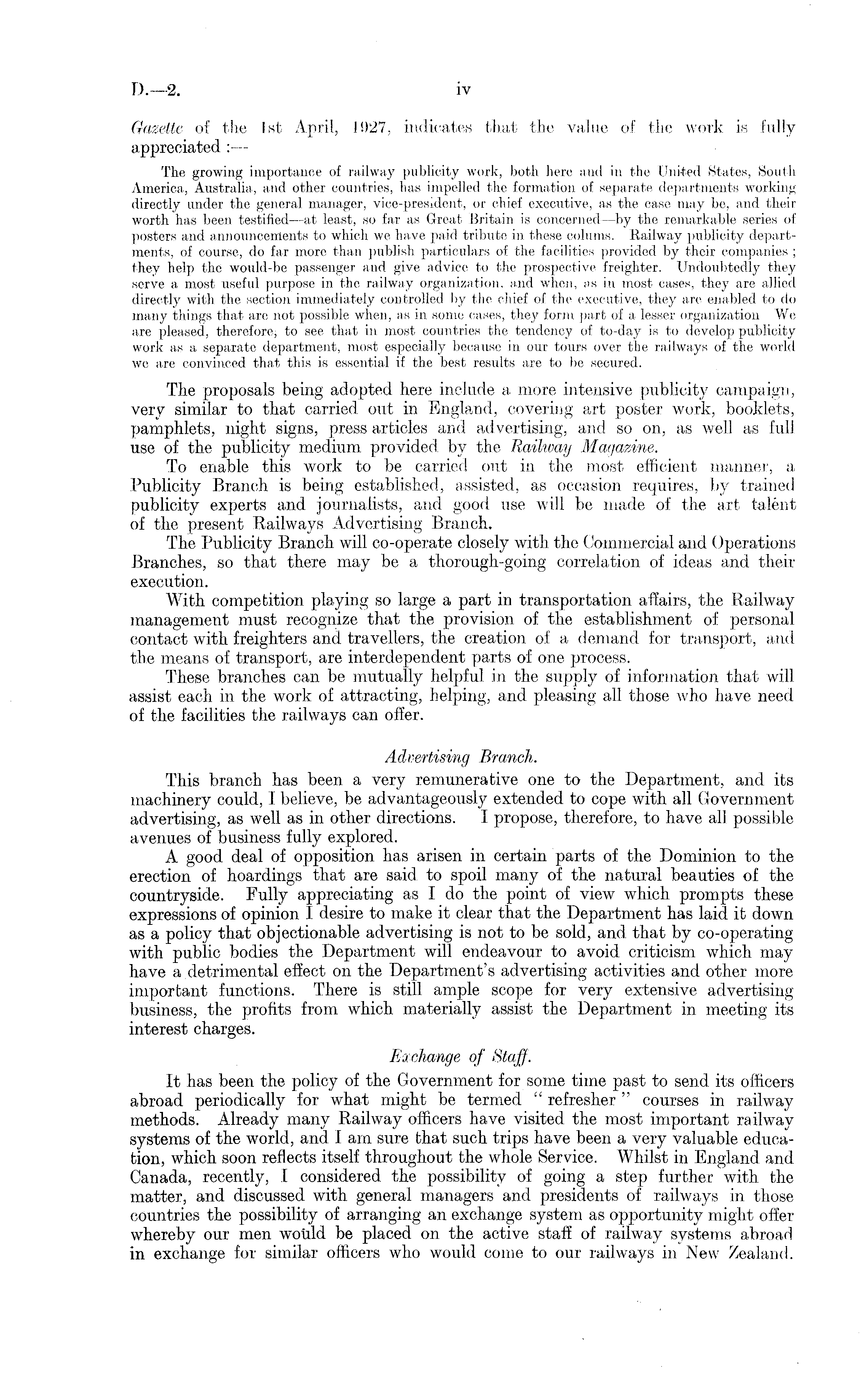 Gazette of the Ist April, 1927, indicates that the value of the work is fully appreciated : — The growing importance of railway publicity work, both here and in the United States, South America, Australia, and other countries, has impelled the formation of separate departments working directly under the general manager, vice-president, or chief executive, as the case may be, and their worth has been testified —at least, so far as Great Britain is concerned —by the remarkable series of posters and announcements to which we have paid tribute in these colums. Railway publicity departments, of course, do far more than publish particulars of the facilities provided by their companies ; they help the would-be passenger and give advice to the prospective freighter. Undoubtedly they serve a most useful purpose in the railway organization, and when, as in most cases, they are allied directly with the section immediately controlled by the chief of the executive, they are enabled to do many things that are not possible when, as in some cases, they form part of a lesser organization We are pleased, therefore, to see that in most countries the tendency of to-day is to develop publicity work as a separate department, most especially because in our tours over the railways of the world we are convinced that this is essential if the best results are to be secured. The proposals being adopted here include a more intensive publicity campaign, very similar to that carried out in England, covering art poster work, booklets, pamphlets, night signs, press articles and advertising, and so on, as well as full use of the publicity medium provided by the Railway Magazine. To enable this work to be carried out in the most efficient manner, a Publicity Branch is being established, assisted, as occasion requires, by trained publicity experts and journalists, and good use will be made of the art talent of the present Railways Advertising Branch. The Publicity Branch will co-operate closely with the Commercial and Operations Branches, so that there may be a thorough-going correlation of ideas and their execution. With competition playing so large a part in transportation affairs, the Railway management must recognize that the provision of the establishment of personal contact with freighters and travellers, the creation of a demand for transport, and the means of transport, are interdependent parts of one process. These branches can be mutually helpful in the supply of information that will assist each in the work of attracting, helping, and pleasing all those who have need of the facilities the railways can offer. Advertising Branch. This branch has been a very remunerative one to the Department, and its machinery could, 1 believe, be advantageously extended to cope with all Government advertising, as well as in other directions. I propose, therefore, to have all possible avenues of business fully explored. A good deal of opposition has arisen in certain parts of the Dominion to the erection of hoardings that are said to spoil many of the natural beauties of the countryside. Fully appreciating as Ido the point of view which prompts these expressions of opinion I desire to make it clear that the Department has laid it down as a policy that objectionable advertising is not to be sold, and that by co-operating with public bodies the Department will endeavour to avoid criticism which may have a detrimental effect on the Department's advertising activities and other more important functions. There is still ample scope for very extensive advertising business, the profits from which materially assist the Department in meeting its interest charges. Exchange of Staff. It has been the policy of the Government for some time past to send its officers abroad periodically for what might be termed " refresher " courses in railway methods. Already many Railway officers have visited the most important railway systems of the world, and I am sure that such trips have been a very valuable education, which soon reflects itself throughout the whole Service. Whilst in England and Canada, recently, 1 considered the possibility of going a step further with the matter, and discussed with general managers and presidents of railways in those countries the possibility of arranging an exchange system as opportunity might offer whereby our men would be placed on the active staff of railway systems abroad in exchange for similar officers who would come to our railways in New Zealand.